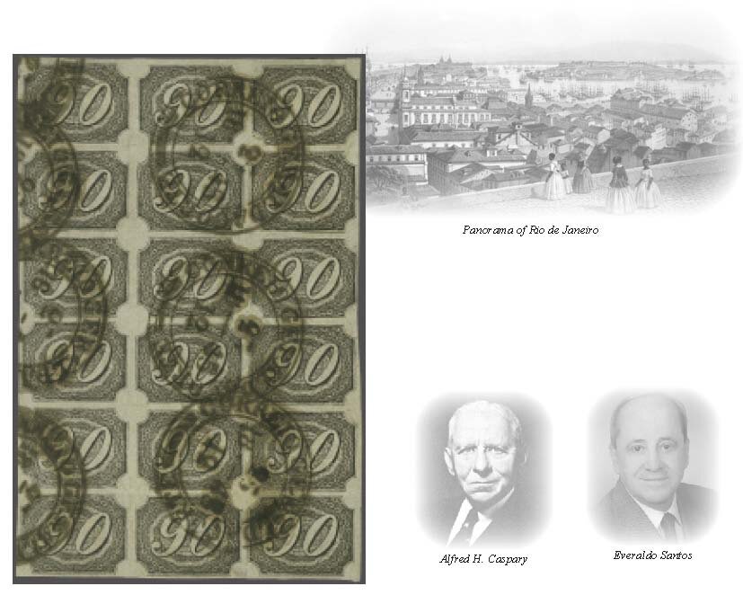 10053 bof imageInclinados 1844/46: 90 r. black on yellowish thin paper, the used block of eighteen (3 x 6), showing alternating Types I / II / I / II / I / II, with fine colour, good to large margins all round and neatly cancelled by "CORREIO GERAL DA CORTE" circular datestamps on Christmas Day 1845. Two slight closed tears and horizontal crease beween fifth and sixth rows. Illustrated in "Inclinados" by Bernd Juchert on page 108 and in Walter Taveira on page 225. A spectacular and truly beautiful multiple: the second largest recorded. Signed A. Diena. Provenance: Collection Alfred H. Caspary, Harmers, New York, 2-5 June 1958, lot 529; collection J.A. Almeida Dias, Harmer Rooke, London, 7-8 March 1963, lot 401; collection Reynaldo Bruno Pracchia, DF, Zurich, 18 Nov 1987, lot 60224; collection Everaldo Santos, Afinsa, Madrid, March 2001, lot 96. (Image 1) (Image 2)