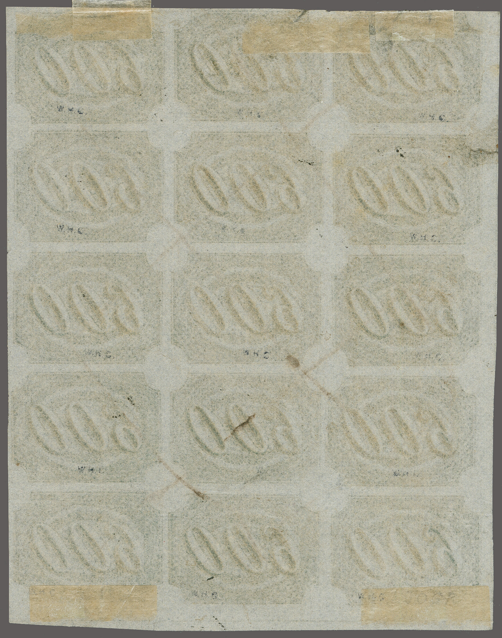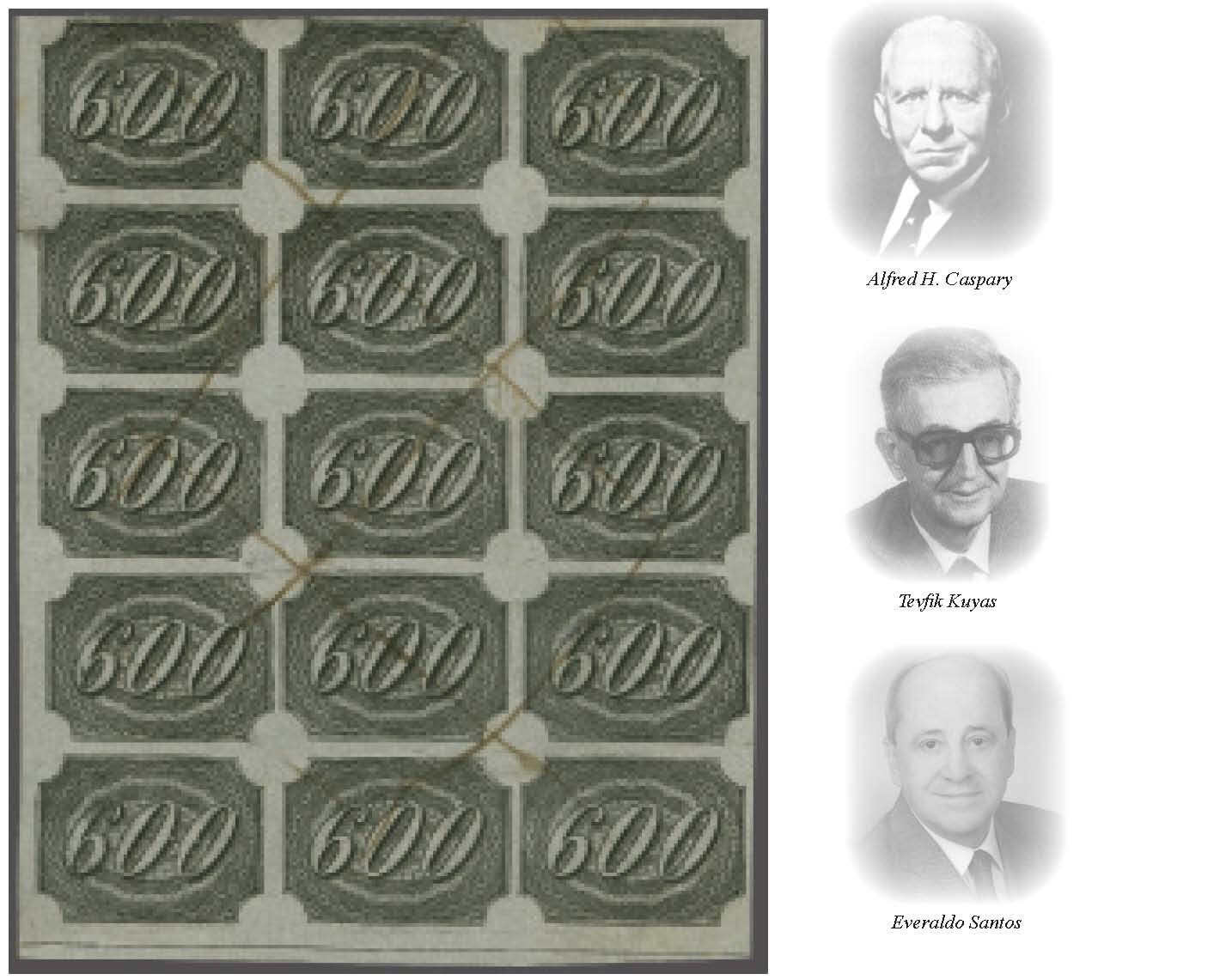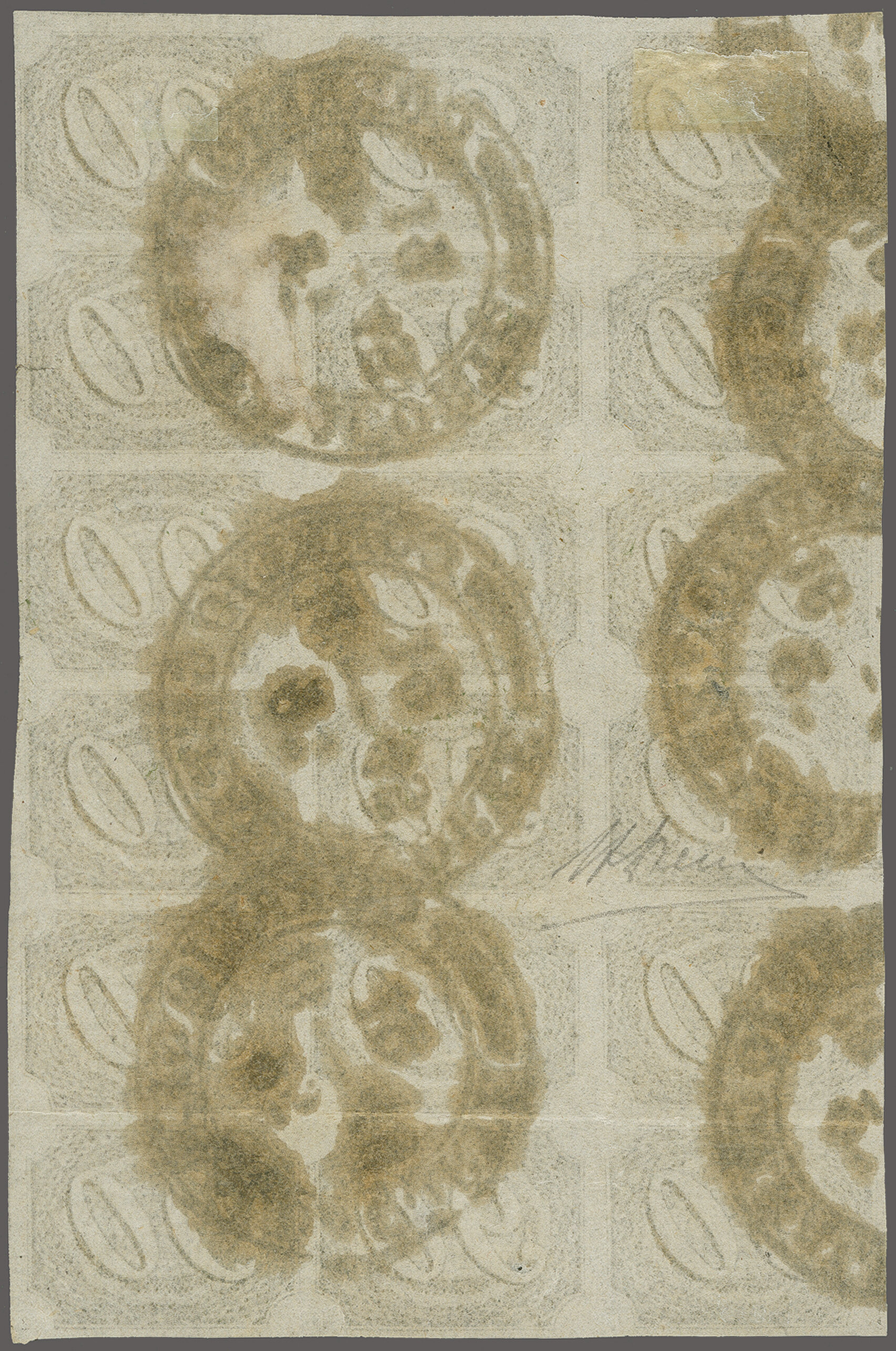 10064 bof imageInclinados 1844/46: 600 r. black on greyish paper, the wonderful used block of fifteen (3 x 5) of rich colour and with mostly large margins all round, corner marginal from lower left of the sheet, positions 109-111 / 118-120 / 127-129 / 136-138 / 145-147; and showing both the vertical and horizontal marginal rule, cancelled by six pen strokes in manuscript ink. Illustrated in "Inclinados" by Bernd Juchert on page 126 and discussed and illustrated in "Inclinados" by Walter Taveira on page 287-288. A remarkable and famous multiple and a highlight of any collection of Brazilian classic philately. Signed W.H. Colson Scott = $ 33'000++. Provenance: First recorded in the philatelic press on 15 August 1908 and owned by a dealer in Rio de Janeiro; collection Ferdinand D'Almeida; collection Alfred H. Caspary, Harmers, New York, 2-5 June 1958, lot 543; collection T. Kuyas, SG, Frankfurt, 18 May 1978, lot 296; collection Everaldo Santos, Afinsa, Madrid, 14 March 2001, lot 115. (Image 1) (Image 2)