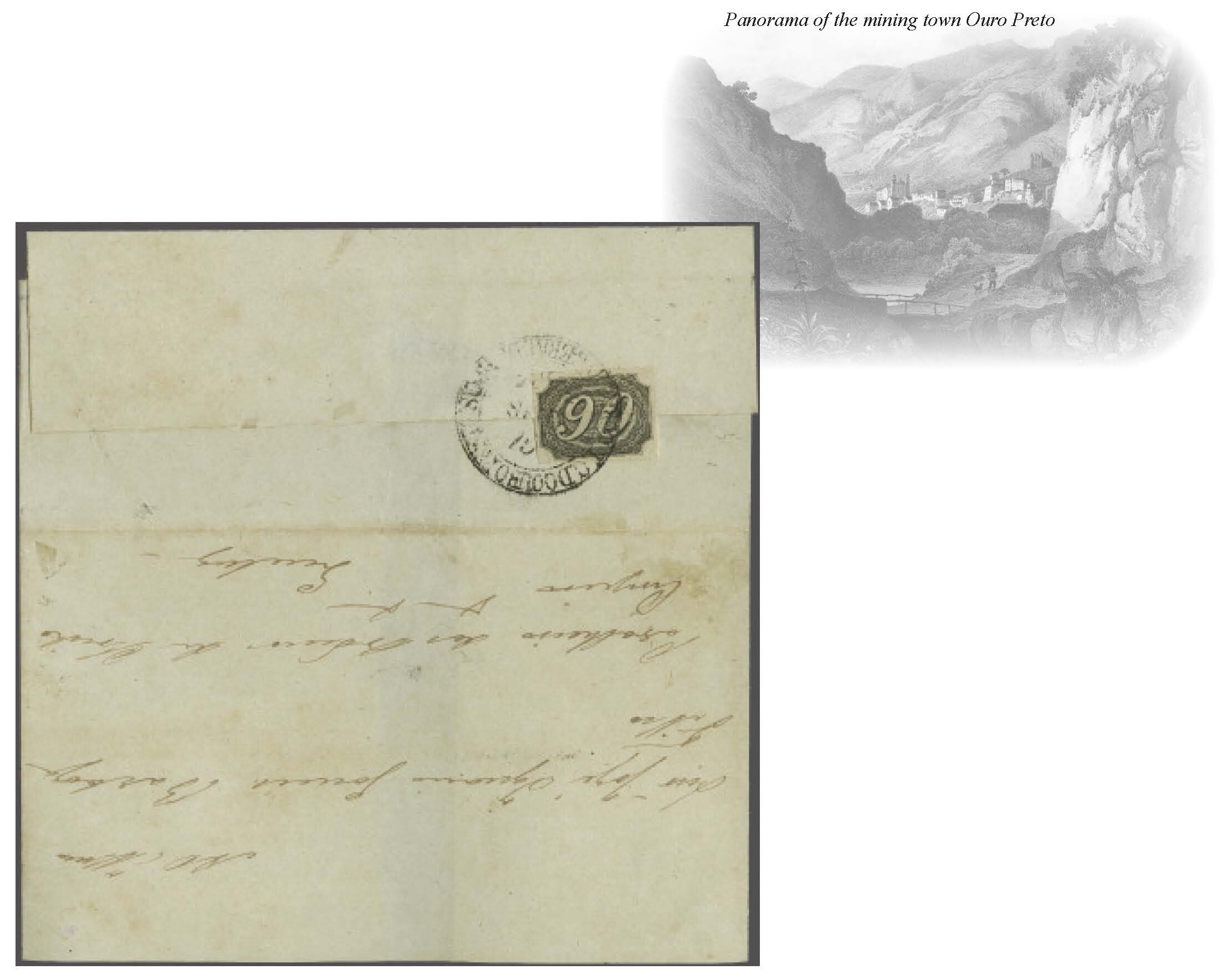 10054 cover imageInclinados 1844/46: 90 r. black on yellowish thin paper, Type II, a single example with large even margins all round, slight scissor cut in margin only, used on reverse of 1845 refolded double rate cover to Queluz, tied by circular "I.C. DO OURO PRETO / CORREIO GERAL DA MINAS" datestamp (Sept 15) struck in black (Ayres fig. 1617). Illustrated in "Inclinados" by Bernd Juchert on page 129 and by Walter Taveira on page 395. The sole recorded usage of this stamp on cover from Ouro Preto. A fine and most attractive cover Scott = $ 1'000+. Provenance: Soler y Llach, Barcelona, July 2005, lot 1687; collection Everaldo Santos. (Image 1) (Image 2)