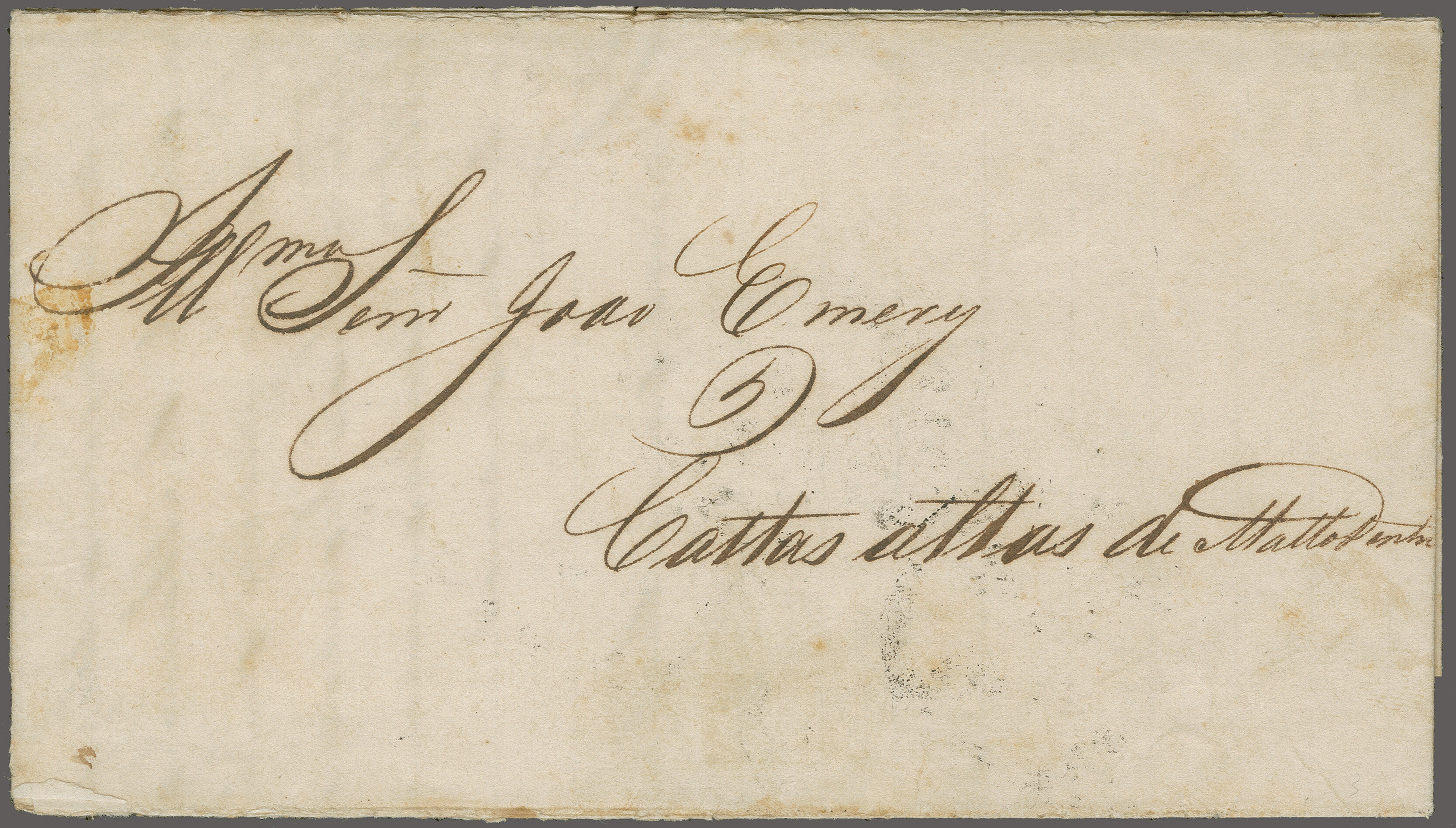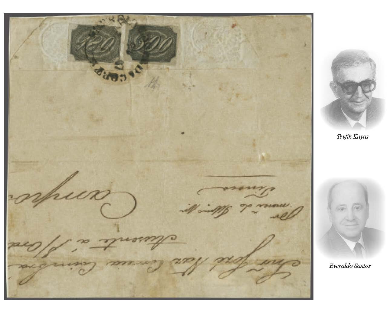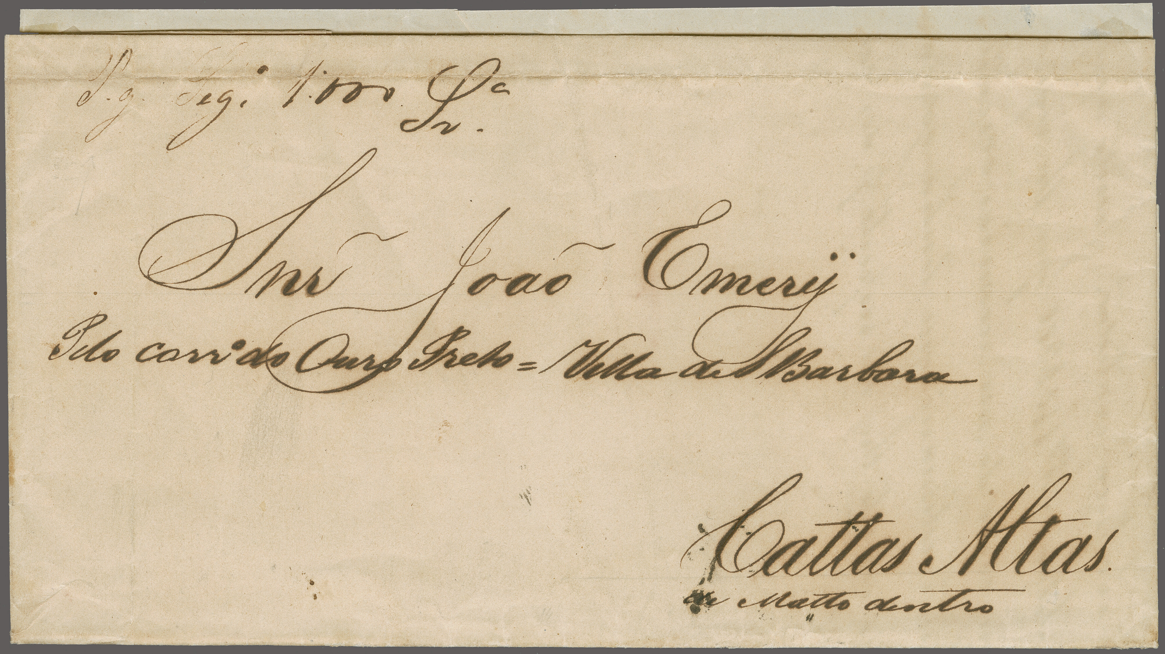 10055 cover imageInclinados 1844/46: 90 r. grey-black on thin greyish paper, Type I, used on reverse of registered / insured 8 August 1847 entire letter from Rio de Janeiro to Cattas Altas do Matto Dentro, the adhesive with three large margins and shaved at top, tied by "CORREIO GERAL DA CORTE" datestamp (Aug 11) in black. Manuscript at top "Segura" and signature, on obverse "Seg. 1'000" = one thousand reis prepaid for an insurance level of up to 50'000 reis at 2%. Illustrated in "Inclinados" by Bernd Juchert on page 89 and by Walter Taveira on page 396. An extremely rare entire, just two Inclinado covers are recorded at the Insured rate. Provenance: Collection Everaldo Santos. (Image 1)