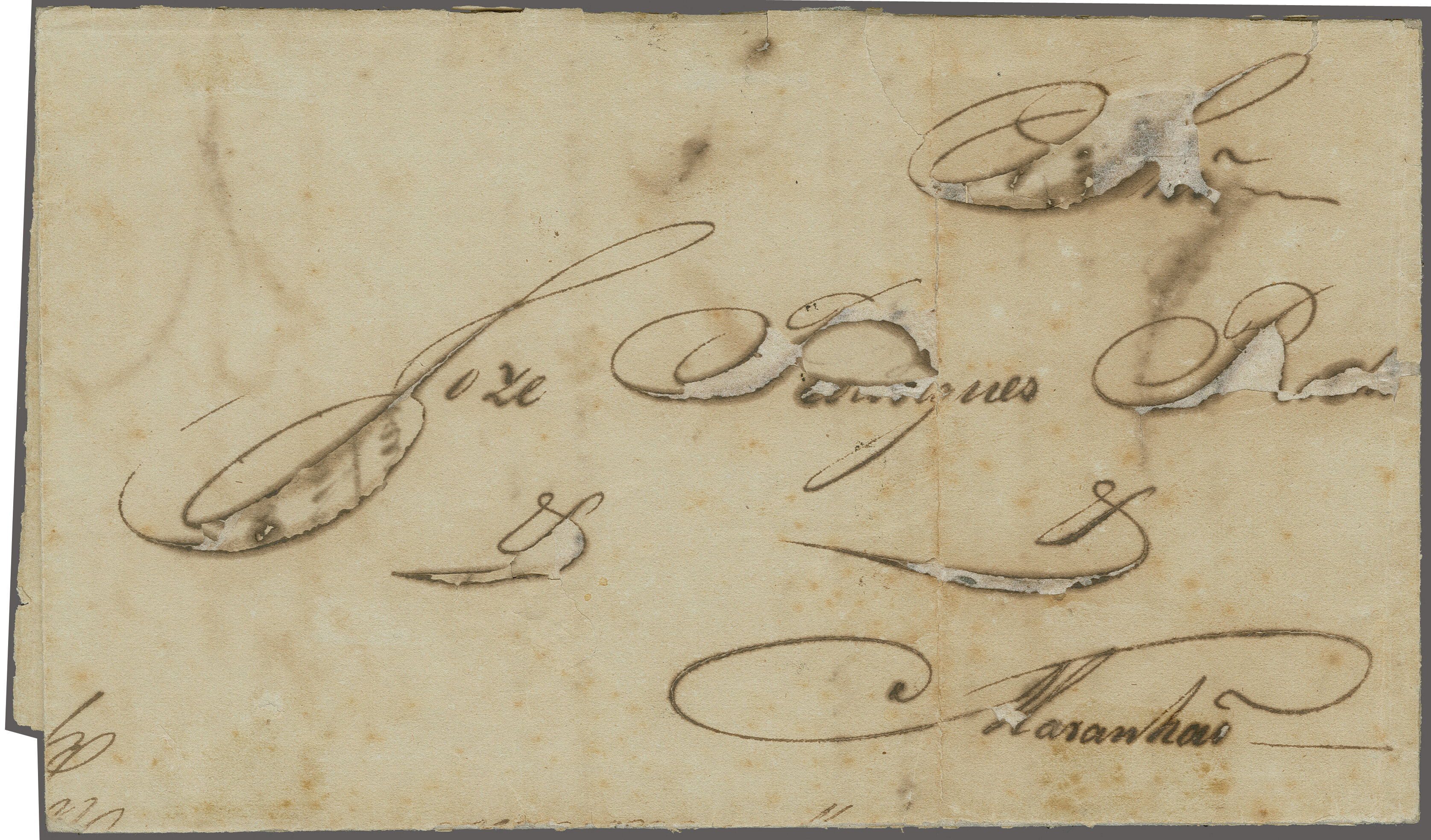 10056 cover imageInclinados 1844/46: 90 r. black and 30 r. grey-black each on yellowish paper, used on 19 November 1844 entire letter from Pernambuco to Maranhão, carried at single Maritime rate, margins large to just touched, tied by "PENAMBUCO SHIELD" datestamp in black (Ayres fig. 1548) in black. Faults to obverse with considerable acid ink imperfections. Unrecorded by Juchert or Taveira. A scarce usage. (Image 1)