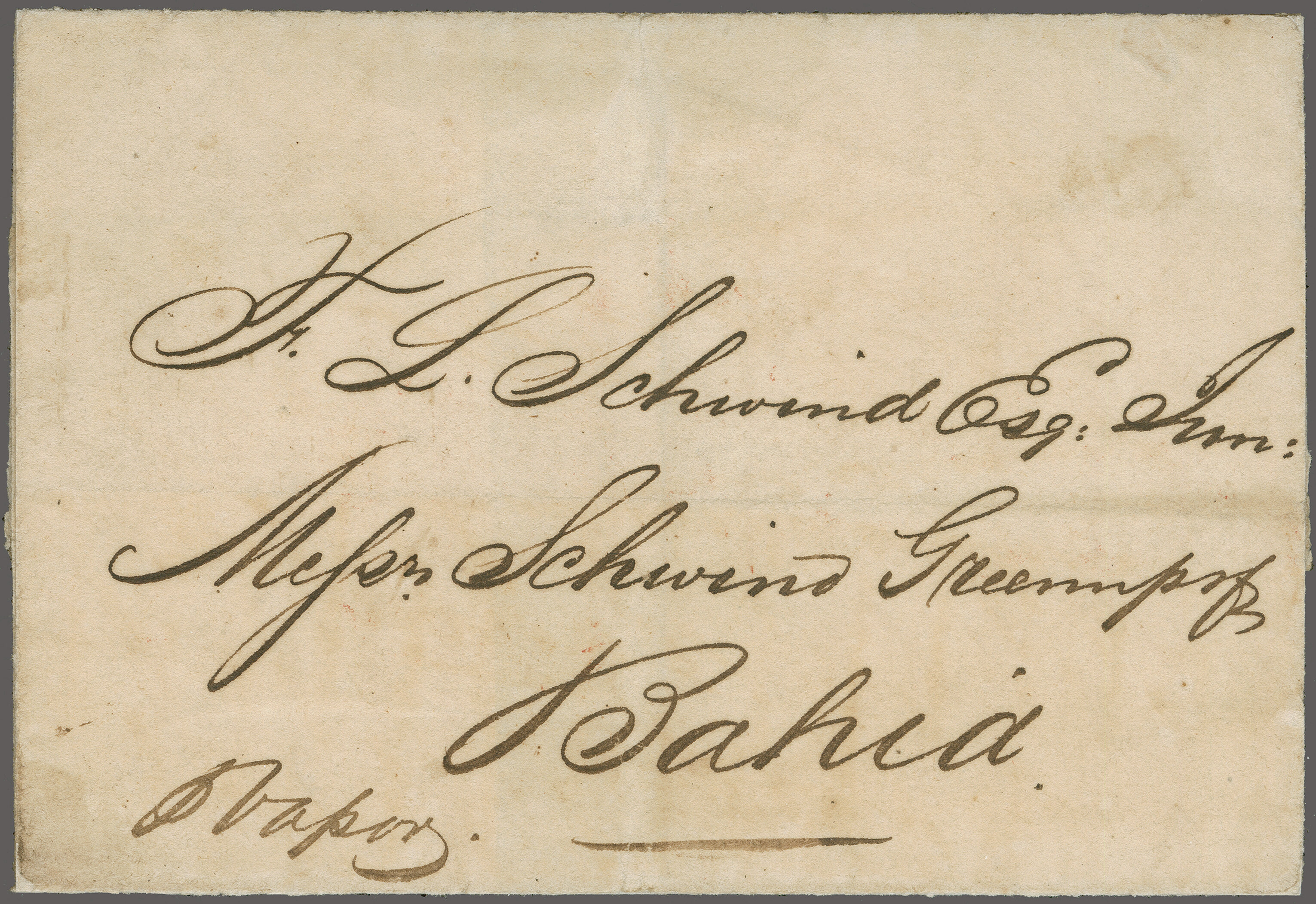 10057 cover imageInclinados 1844/46: 90 r. grey-black in a horizontal pair, Type II and single 60 r. grey-black, Type II, the pair creaseed and with margins touched to large the 60 r, very fine; used on reverse of cover endorsed "p. Vapor" from Rio de Janeiro to Bahia at Maritime triple rate, tied by somewhat smudged "CORREIO GERAL DA CORTE" circular datestamps in red. Illustrated in "Inclinados" by Bernd Juchert on page 103. Despite imperfections, a remarkable cover with just two covers known bearing this franking. (Image 1)