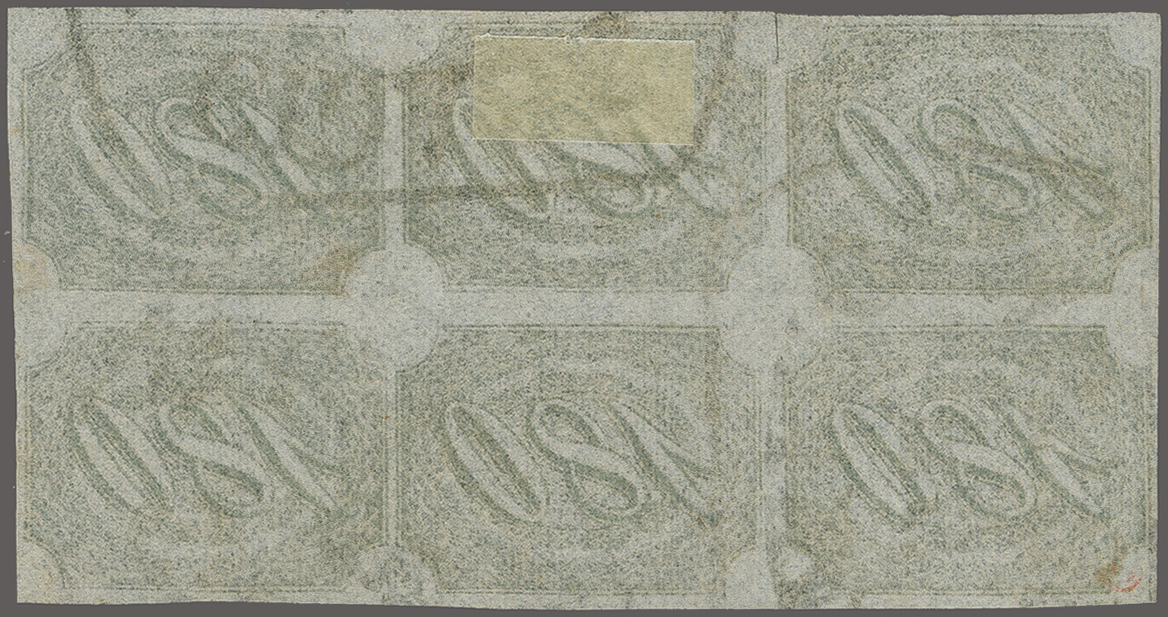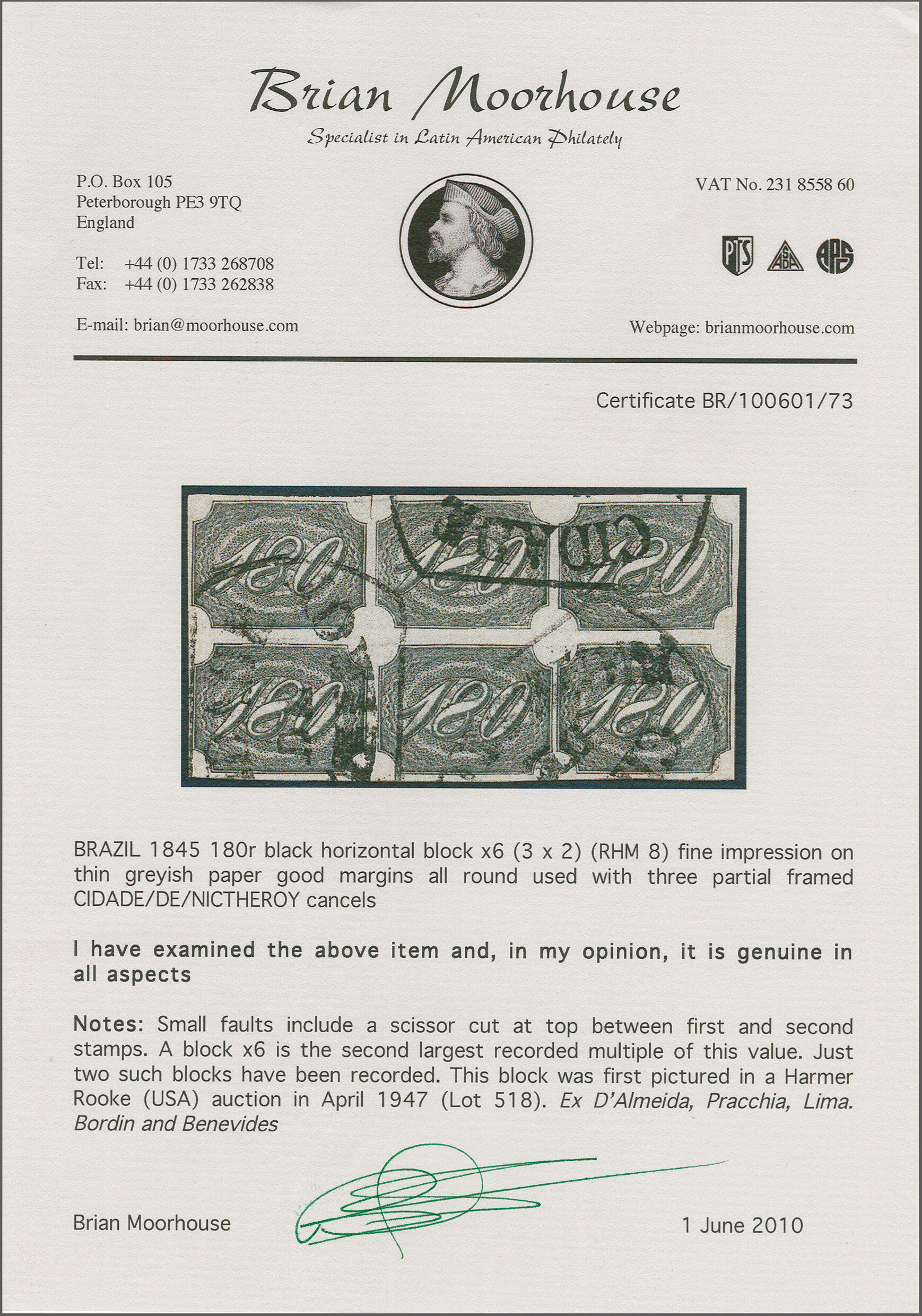 10059 bof imageInclinados 1844/46: 180 r. deep black on greyish thin paper, the used block of six (3 x 2) of fine impression, good to large margins all round, slightest scissor cut in margin only between first and second stamps, neatly cancelled by framed "CIDADE / DE / NICTHEROY" handstamps in black (Ayres fig. 1371). Illustrated in "Inclinados" by Bernd Juchert on page 117 and illustrated and discussed by Walter Taveira on pages 261 and 262. The second largest multiple known. A magnificent and famous multiple for the connoisseur. Cert. Moorhouse (2010) Scott = $ 10'000++. Provenance: Collection Guilherme Guinle (1925); Harmer Rooke, New York, April 1947, lot 518; collection Reynaldo Bruno Pracchia, DF, Zurich, 18 Nov 1987, lot 60238; collection Angelo Lima, DF, Geneva, 3-8 Nov 1996 lot 21169; collection Helio David Bordin, 1997; collection Roberto Seabra Benevides, Torres, London, Autumn 2001; Investphila, Lugano, Nov 2010, lot 1127. (Image 1) (Image 2) (Image 3)