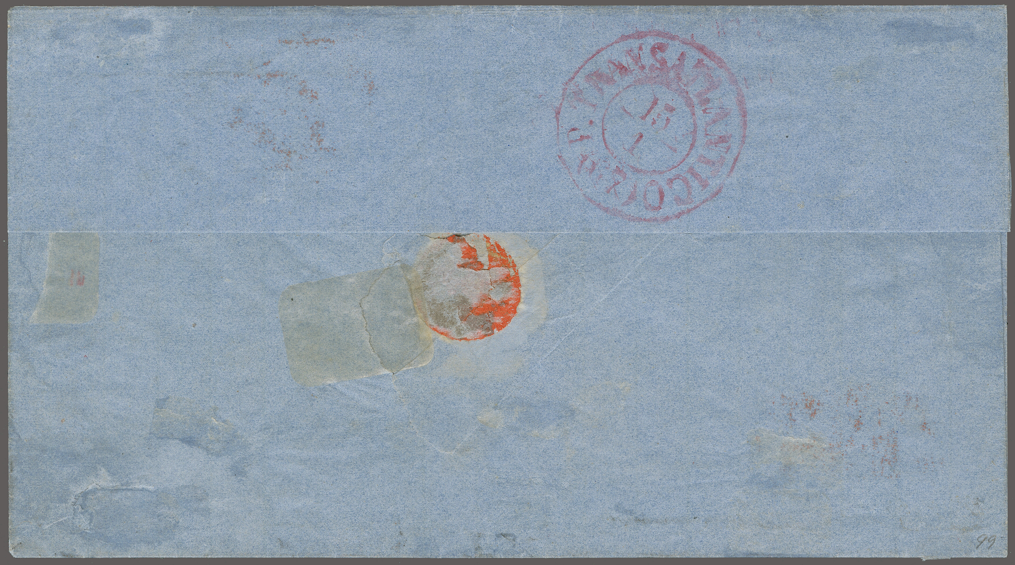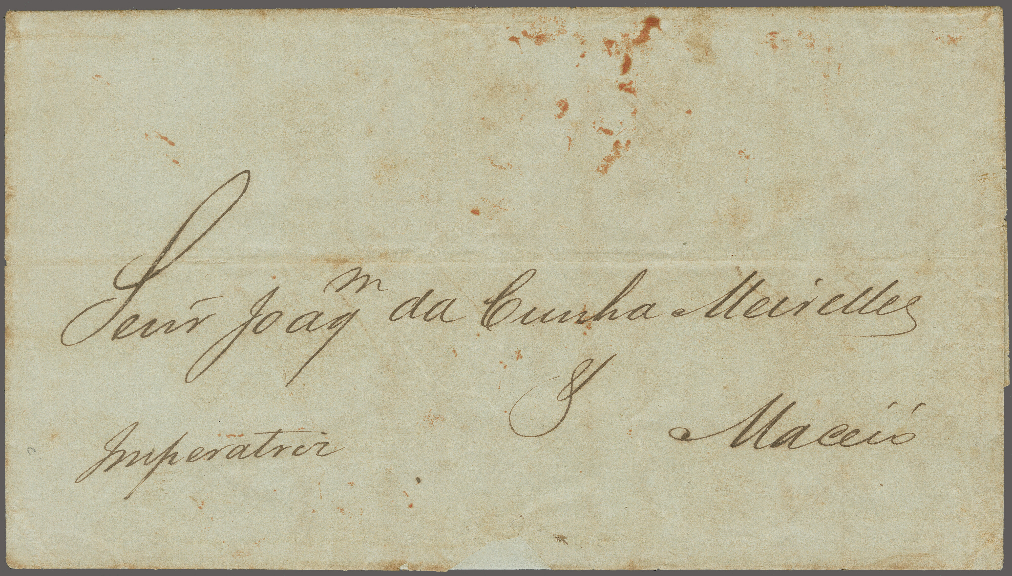 10062 cover/bof imageInclinados 1844/46: 300 r. black on greyish thin paper, a used example with large margins all round and showing portion of adjoining stamp at top, in combination with 1850 Verticais 10 r. black in a "block" of six which was damaged upon opening of the letter and two stamps at right have been sympathetically replaced, on 13 July 1851 entire letter paying the quintuple Maritime postage rate from Bahia to Maceio and endorsed per steamer "Imperatriz" on obverse; the stamps tied by "CORREIO DA BAHIA" circular datestamps in red (Ayres fig. 1605). Illustrated in "Inclinados" by Walter Taveira on page 410. Photocopy of the original together with the lot; despite faults a remarkable item being one of just two known covers with the combination of Inclinados with a Verticais adhesive and one of only two covers with a 300 reis Inclinado. Provenance: Collection Roberto Seabra Benevides, Torres, London, Autumn 2001. (Image 1)