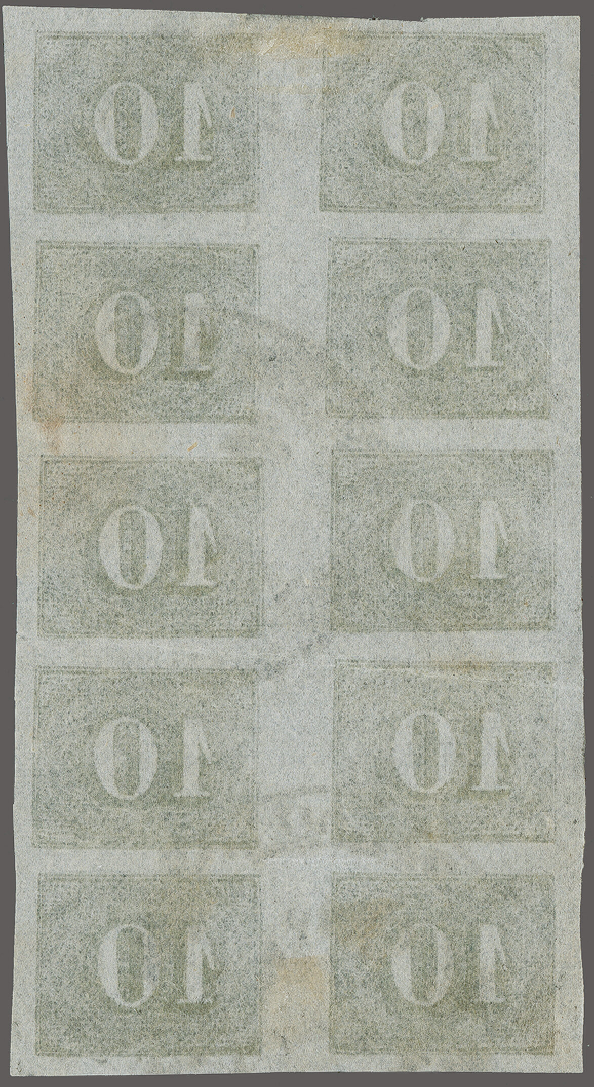 10065 **/*/bof imageVerticais 1850 10 r. black, an unused block of sixteen (4 x 4) on somewhat yellowed paper, large margins all round, some ageing but most unusually with full browned streaky gum still intact, a rare and appealing multiple Scott = $ 480++. (Image 1)