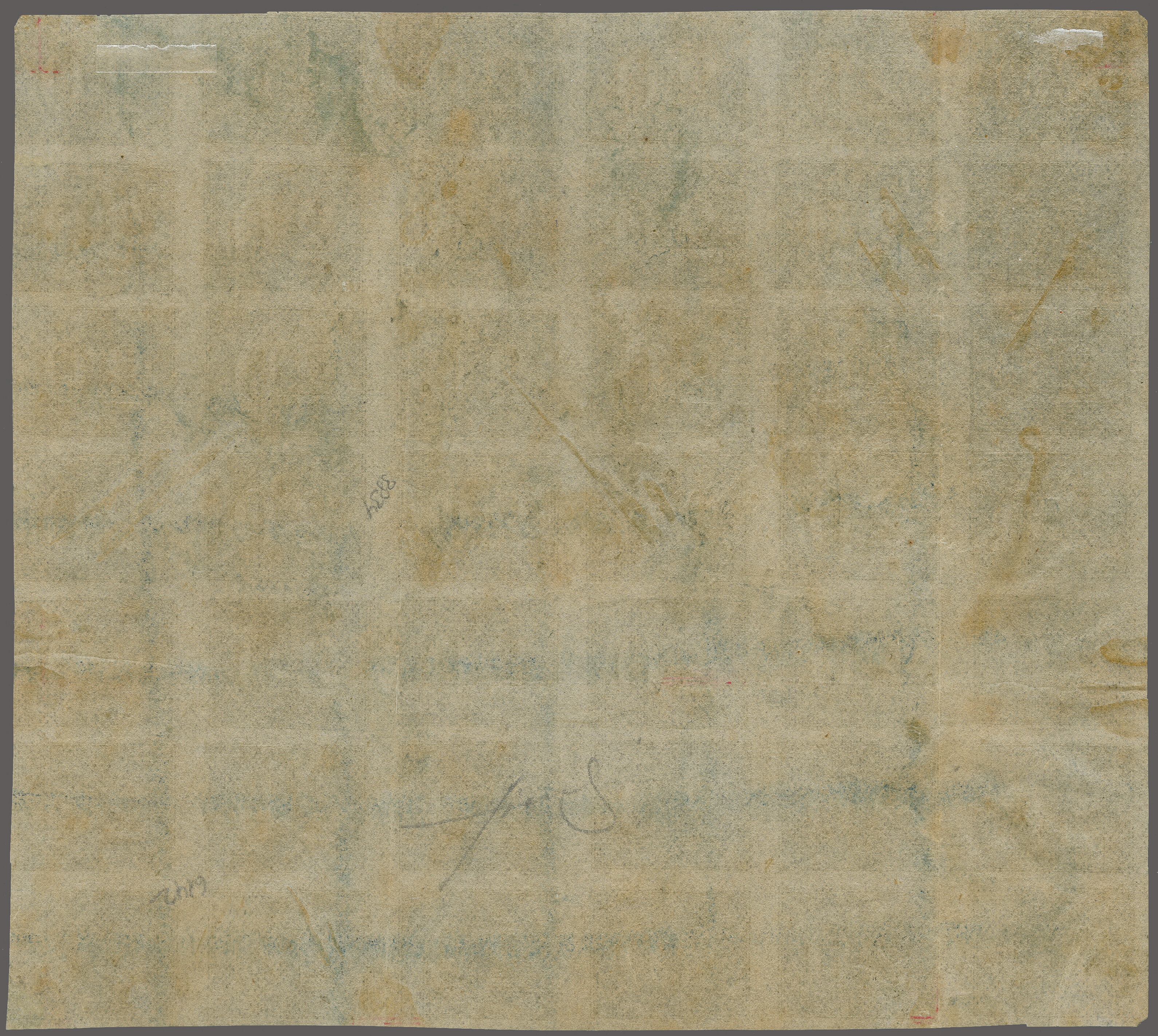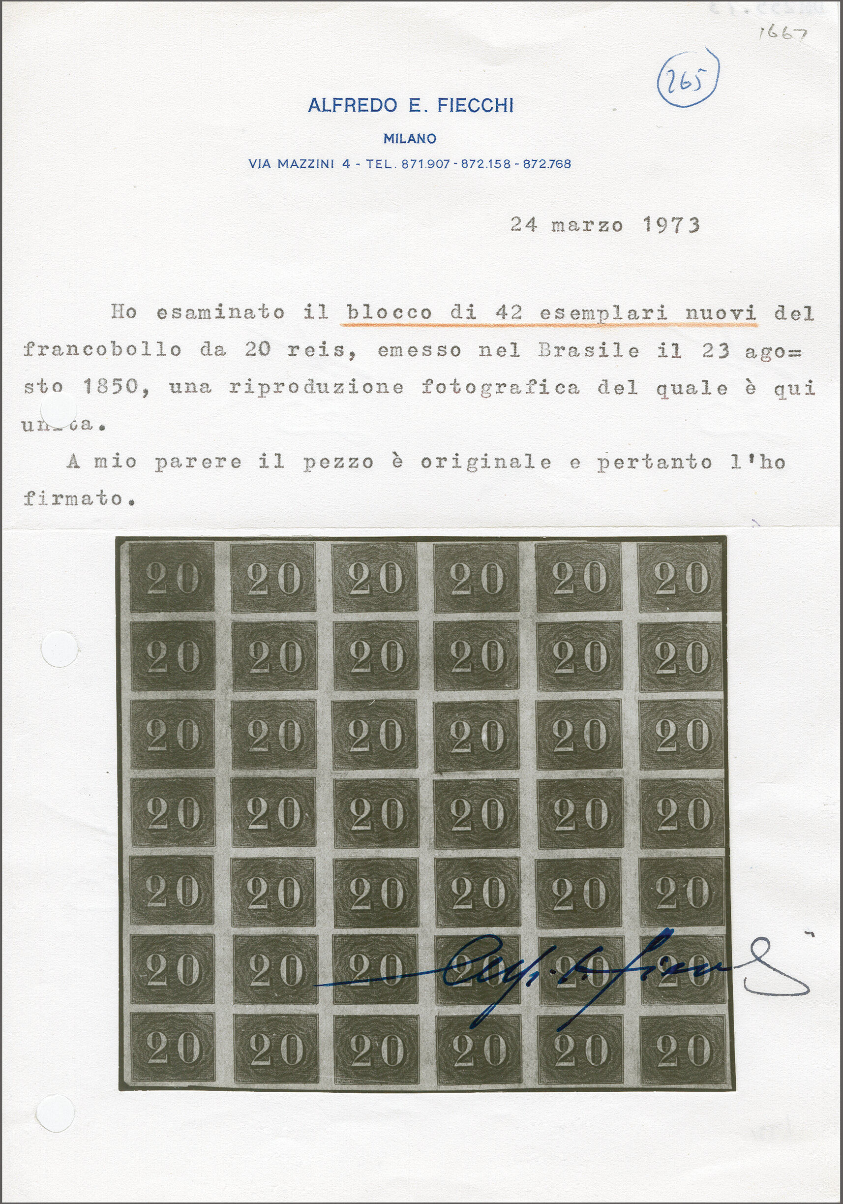 10068 **/*/bof imageVerticais 1850: 20 r. black on thin yellowish paper, an unused block of forty-two (6 x 7) with just shaved to large margins all round, of fine colour in a good state of preservation for a multiple of this size, some age spots and some typical creasing unapparent on face, large part og. The largest recorded unused multiple of this stamp. Rare. Cert. Fiecchi (1973) Scott = $ 3'850+. Provenance: Collection Dr. Norman Hubbard, Robson Lowe, Basel, 18 March 1975, lot 1667; Corinphila sale 107, Sept 1998, lot 3834; collection 'Crown Point', Corinphila sale 131, Oct 2001, lot 6142. (Image 1) (Image 2) (Image 3)