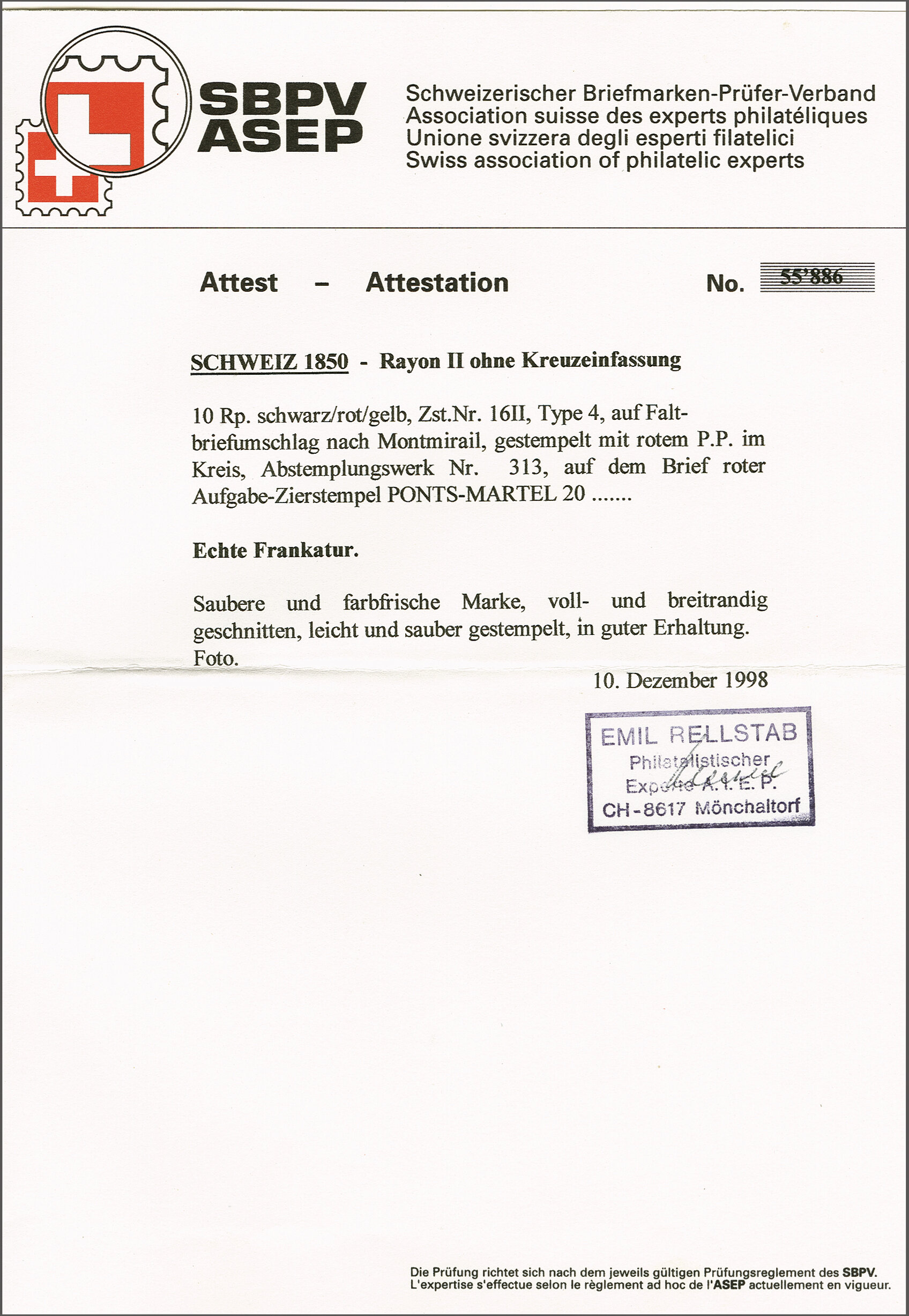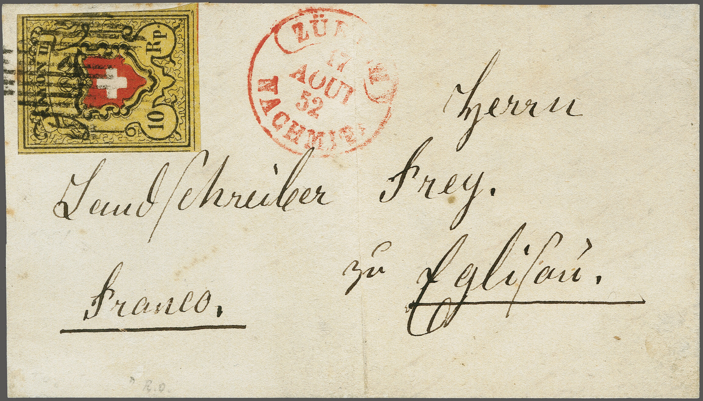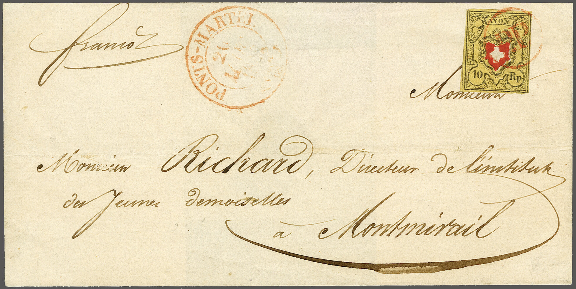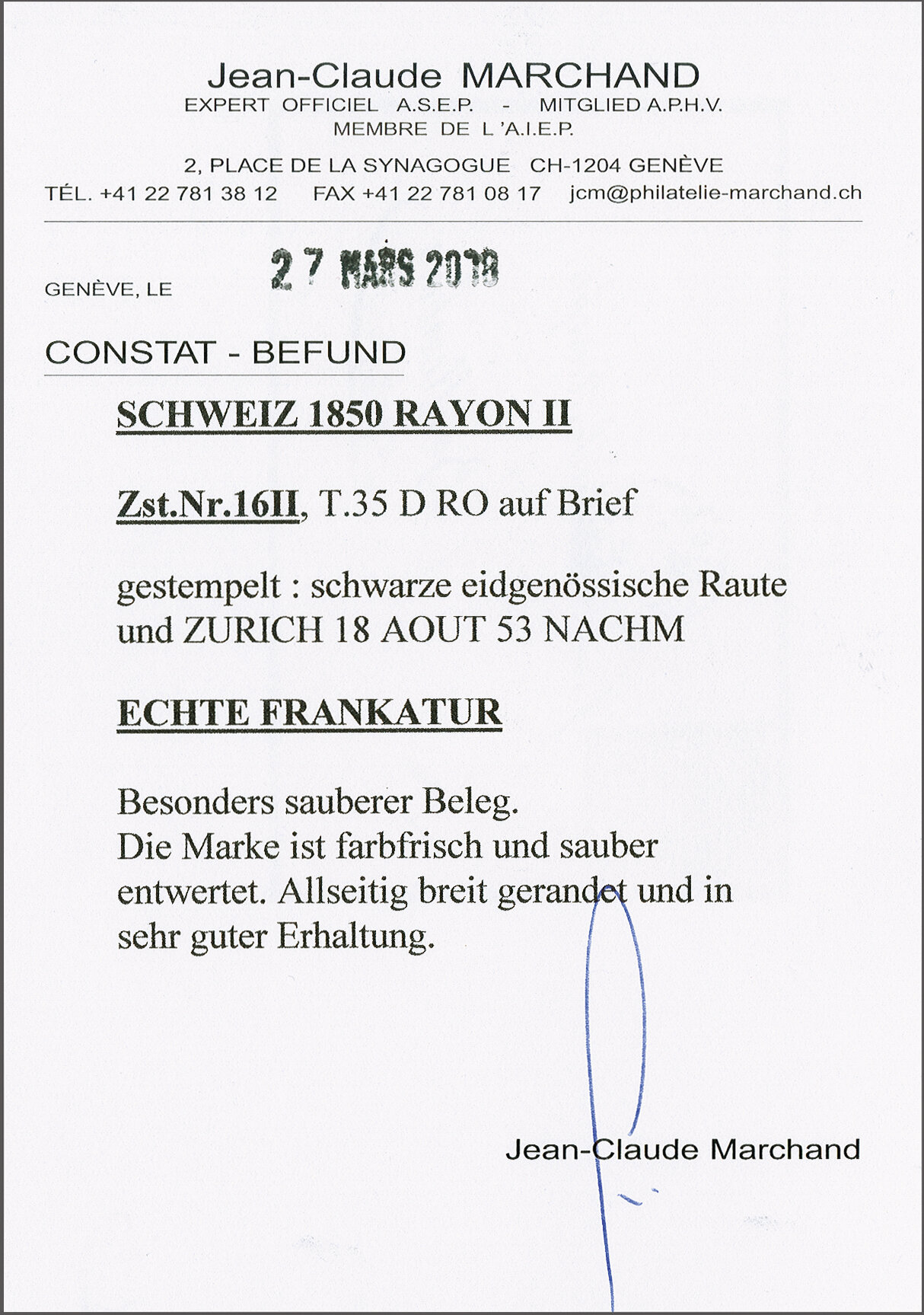 Abgebildet und diskutiert in: Henri Grand, "Oblitérations Suisses 1843-1854", S. 234 Provenienz: Angebot Ernst Müller, Basel, beworben auf der Titelseite der Firmenzeitschrift "Die Basler Taube", 8/1 (März 1928); Giorgino-Auktion, Biel 18./19. März