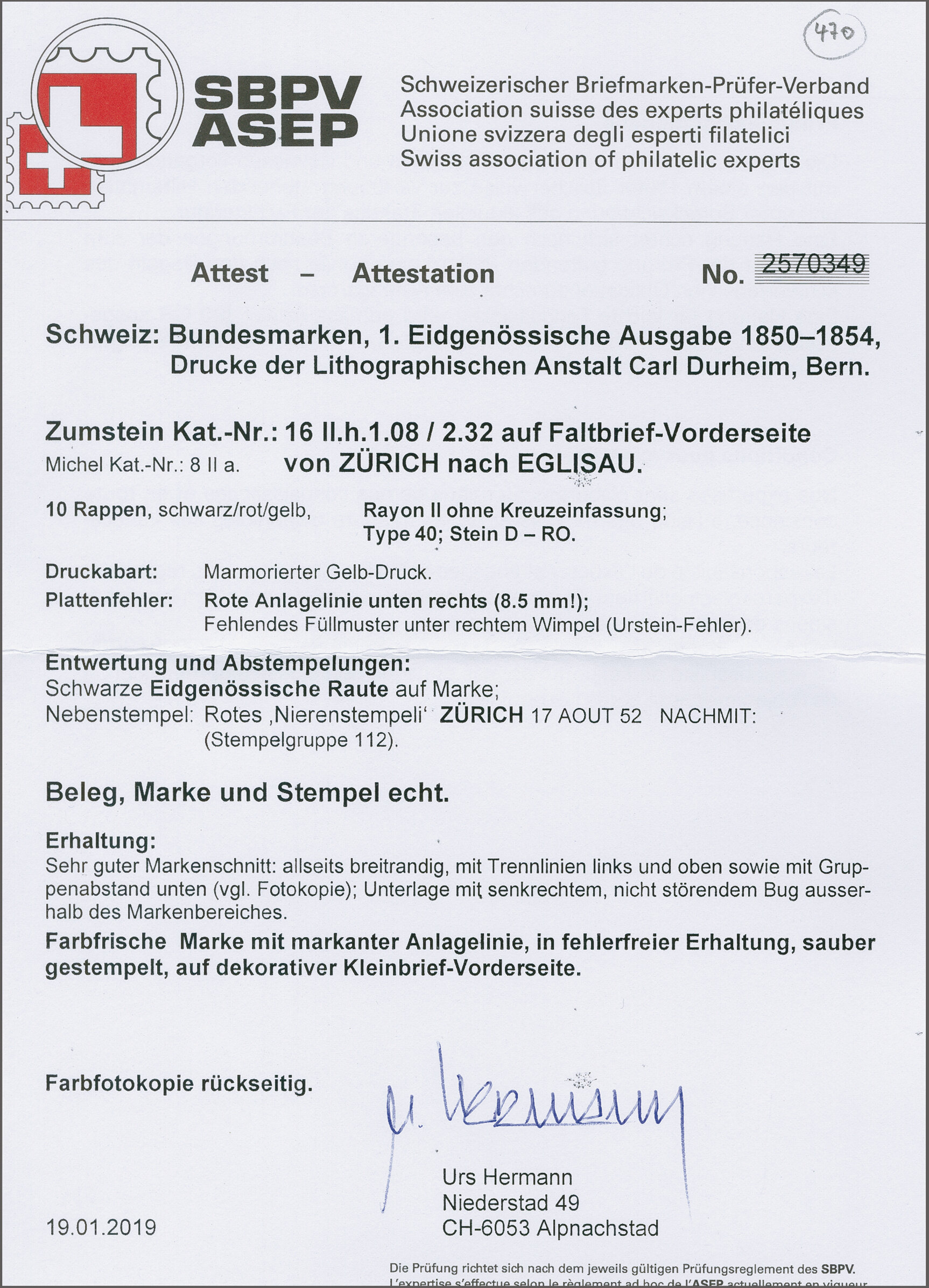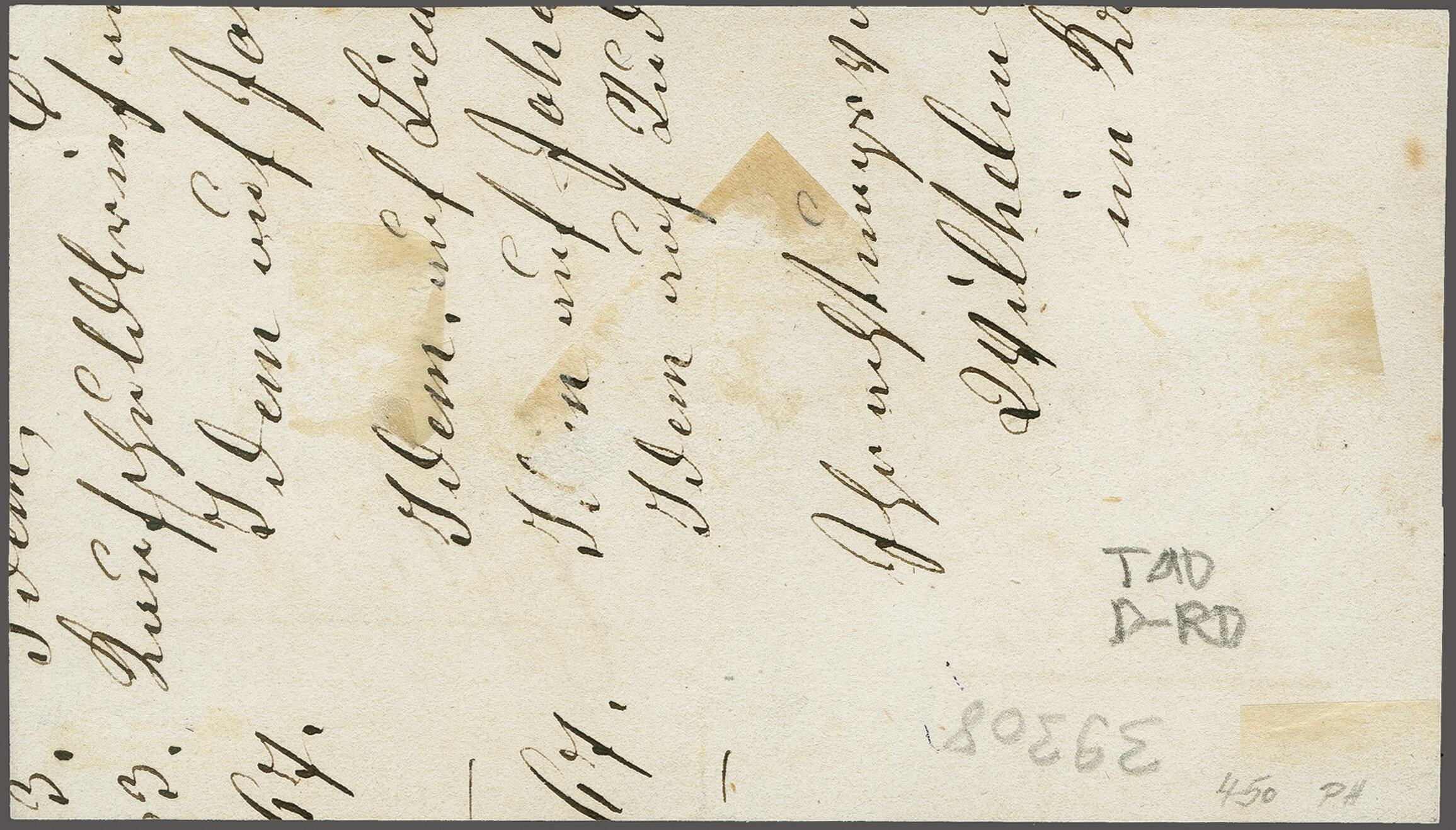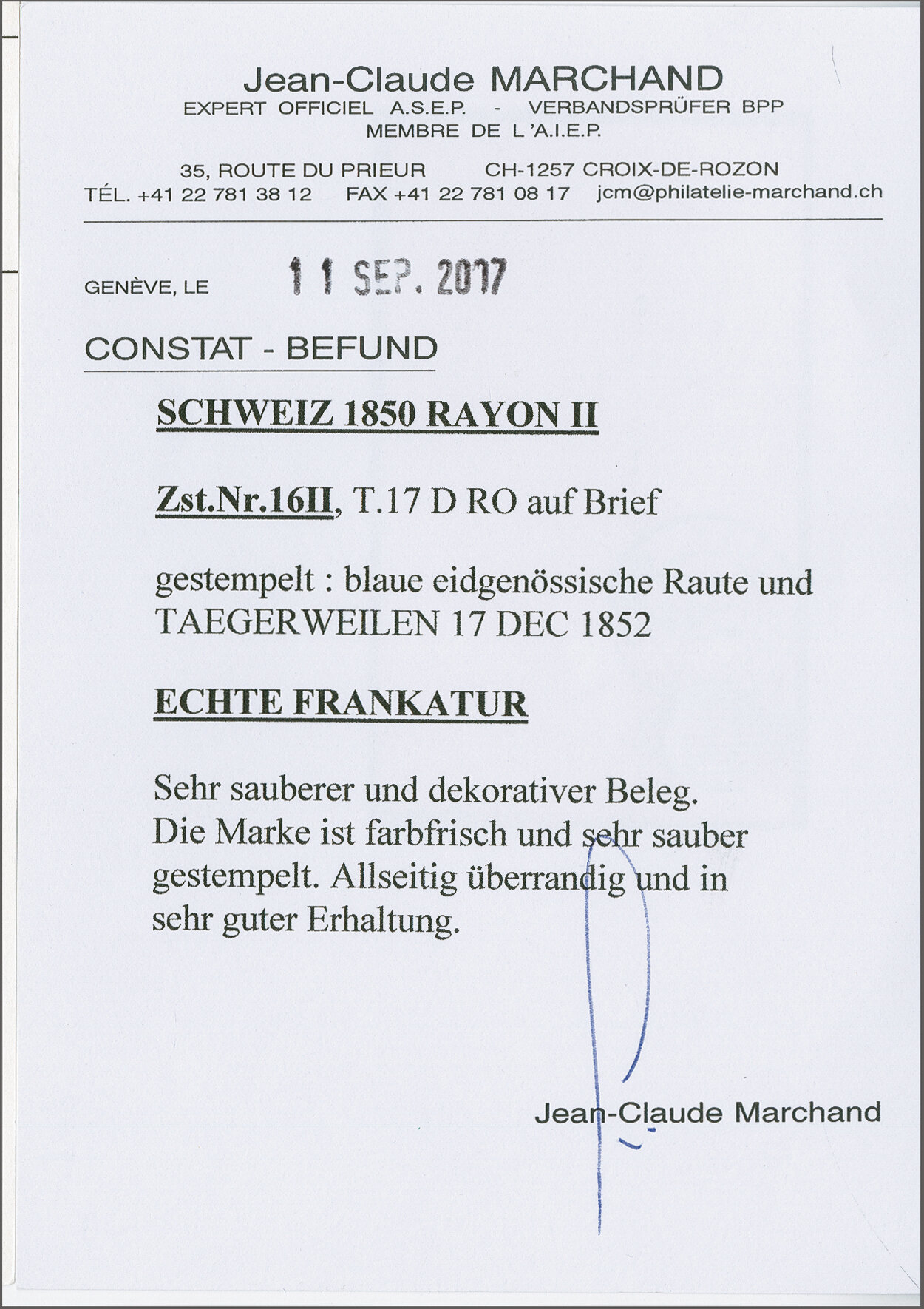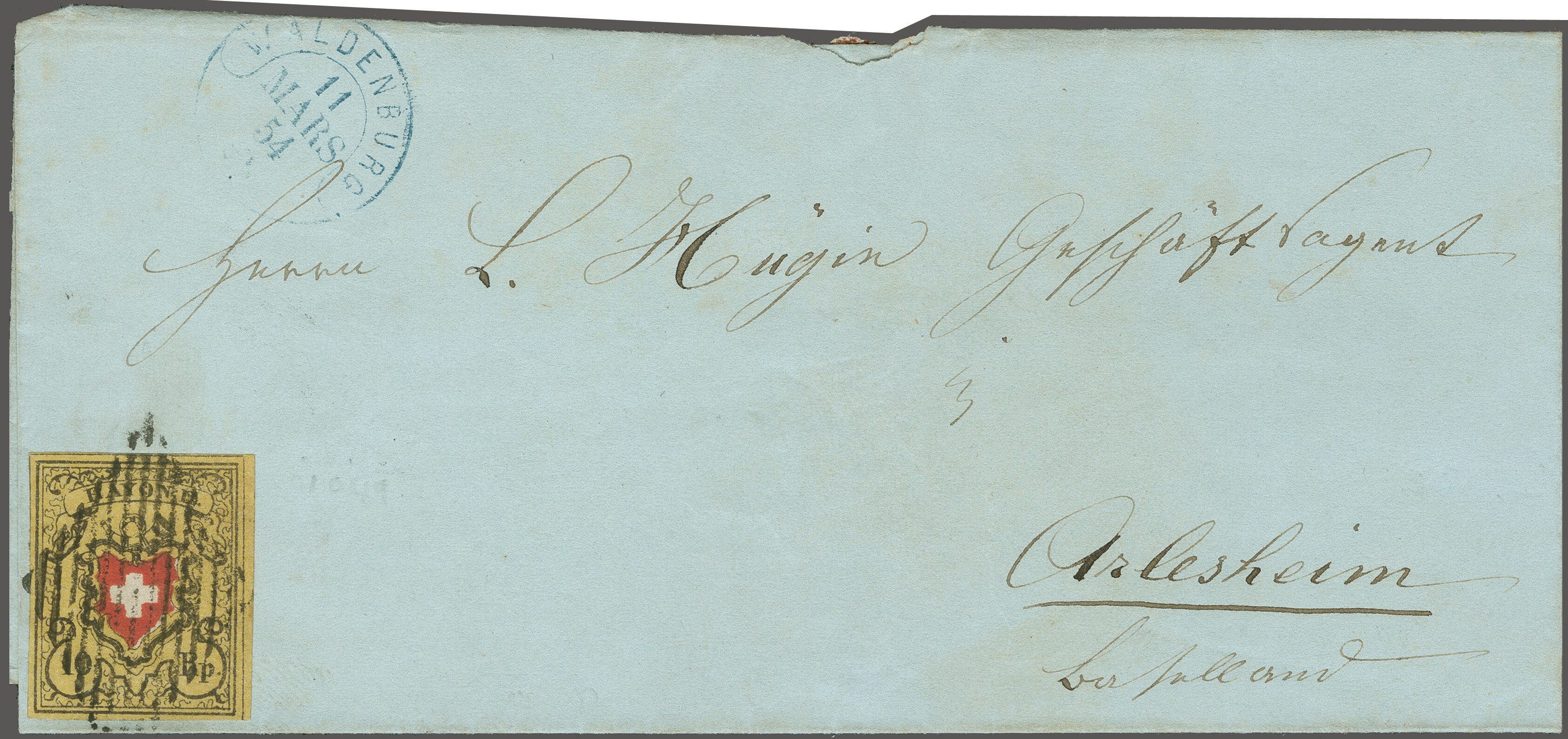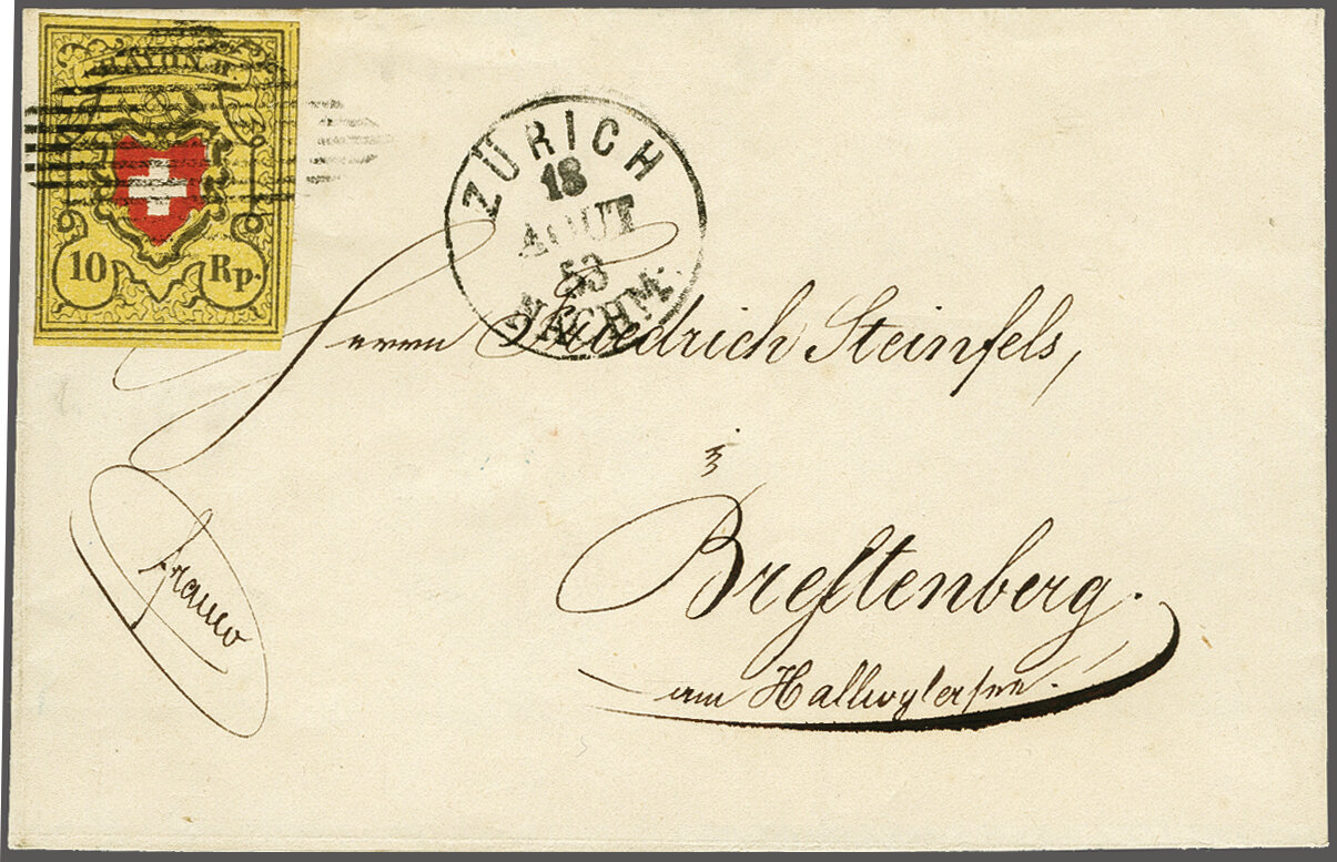 Abgebildet und diskutiert in: Henri Grand, "Oblitérations Suisses 1843-1854", S. 234 Provenienz: Angebot Ernst Müller, Basel, beworben auf der Titelseite der Firmenzeitschrift "Die Basler Taube", 8/1 (März 1928); Giorgino-Auktion, Biel 18./19. März