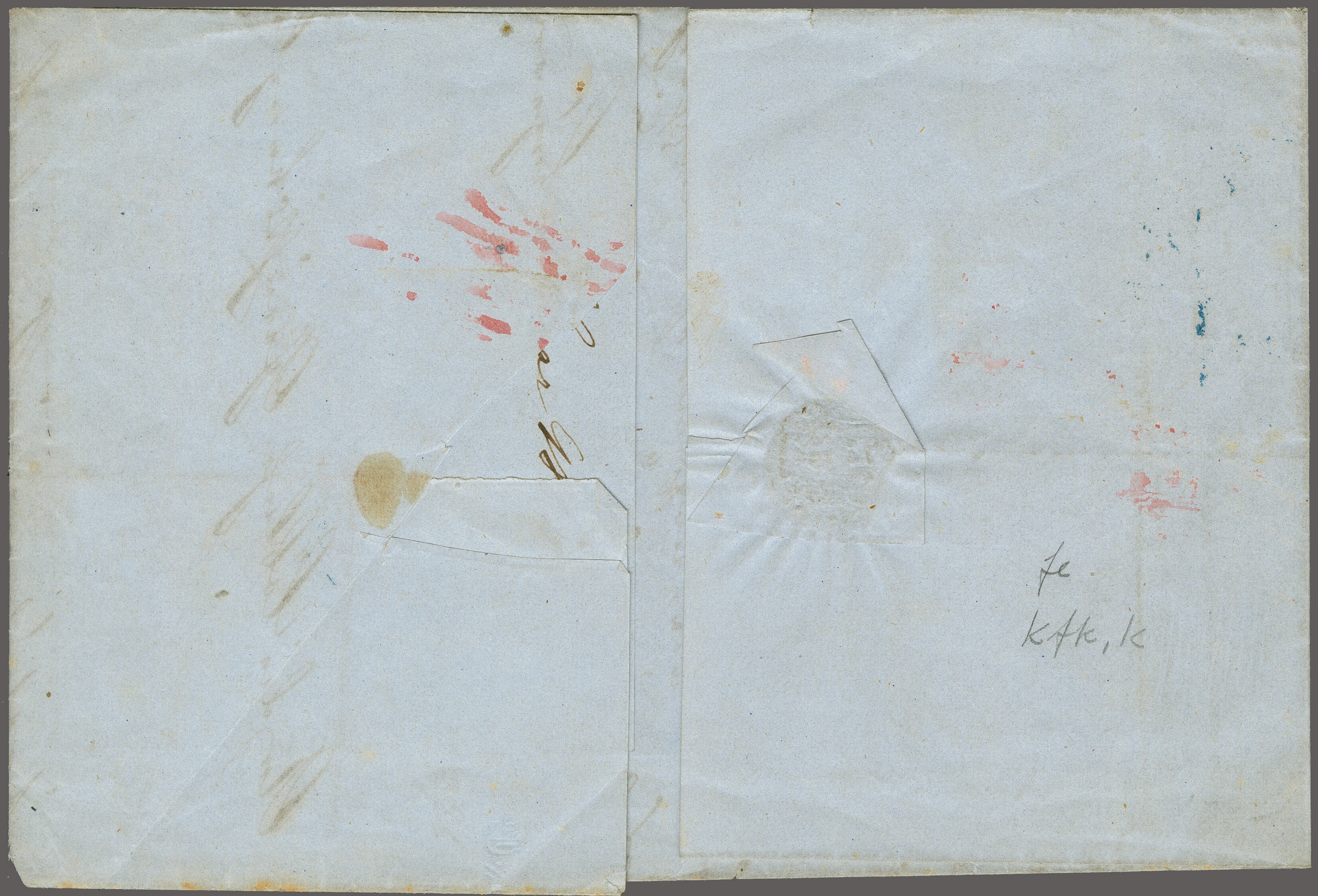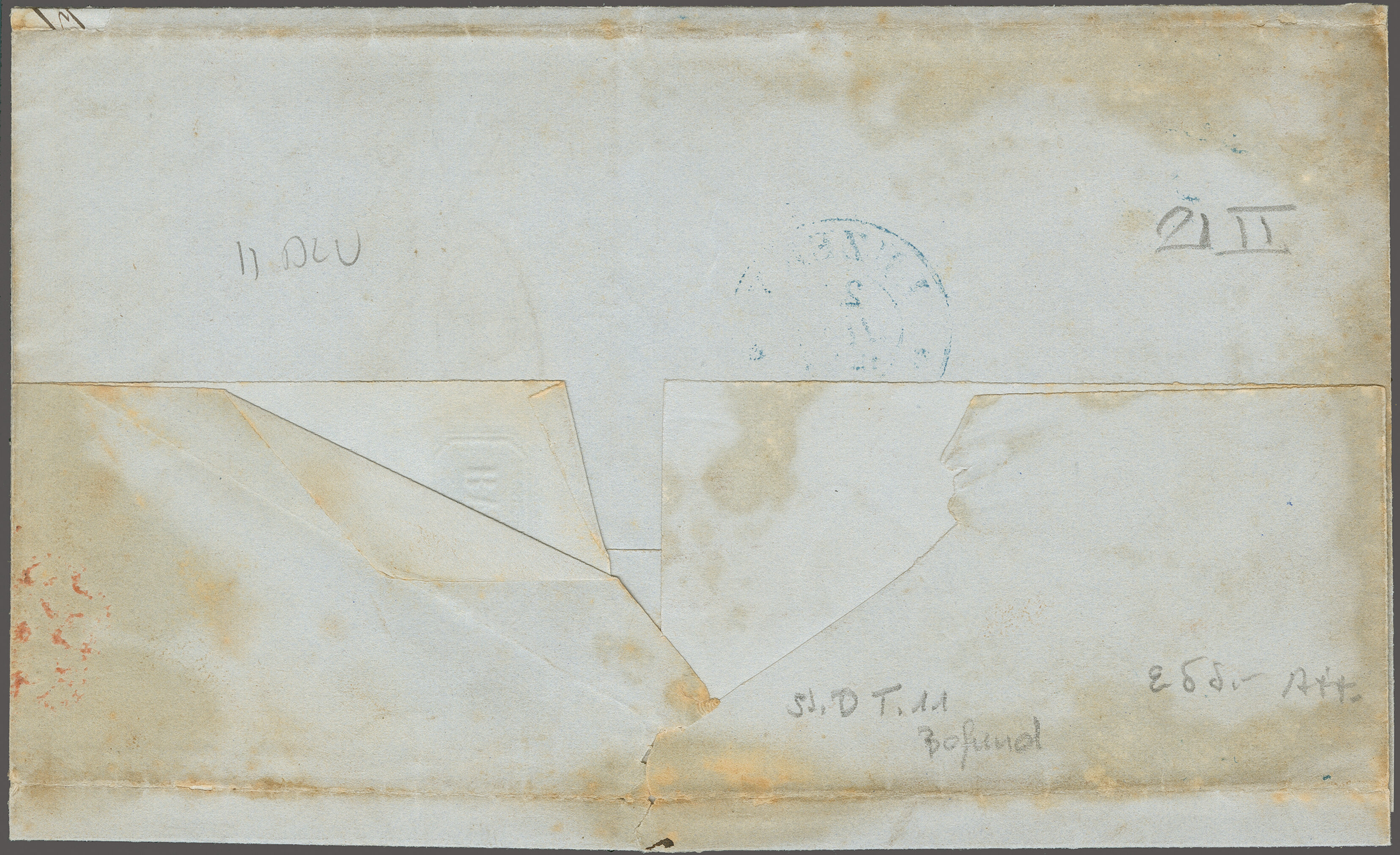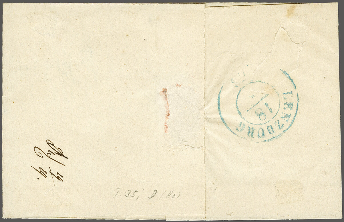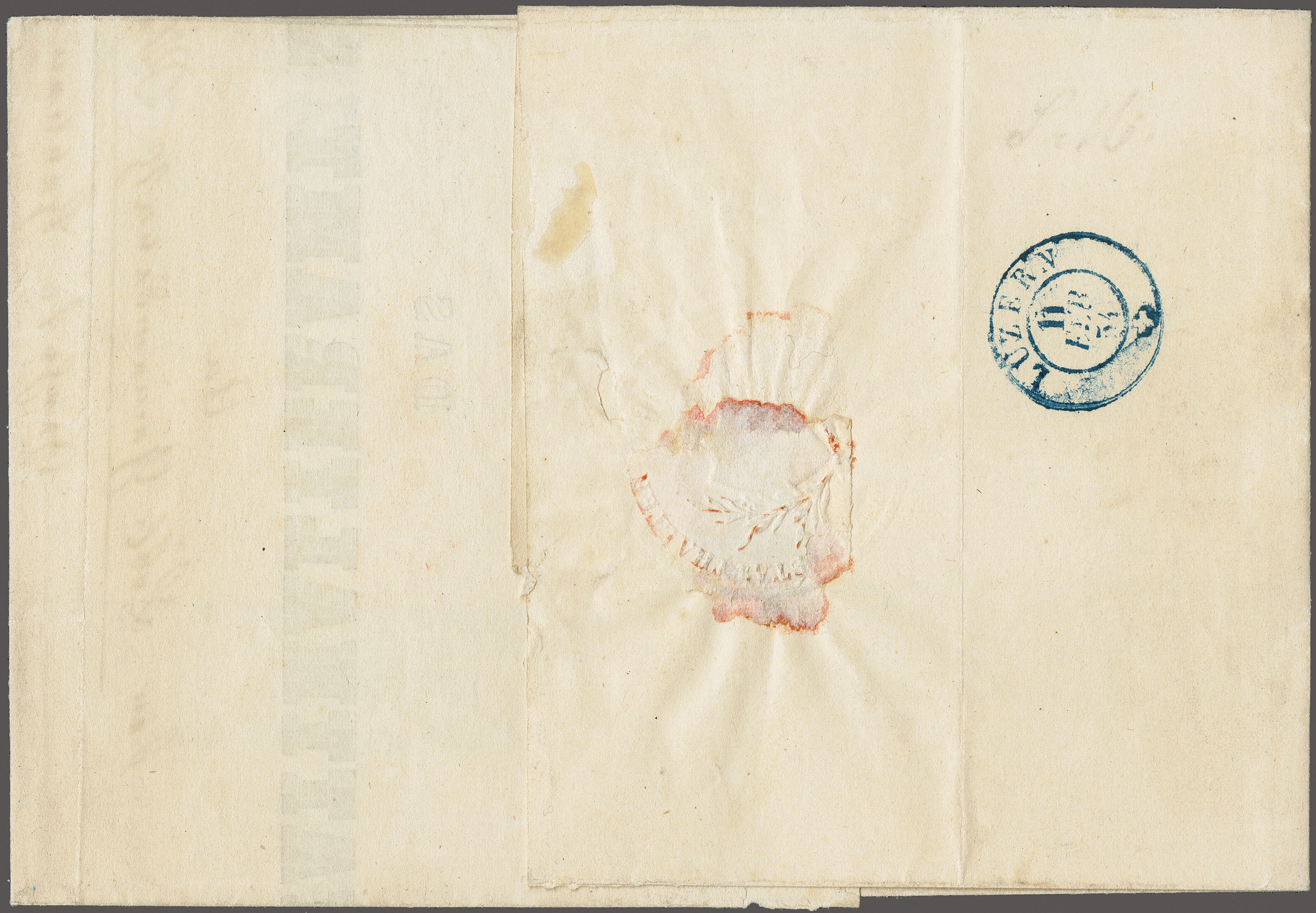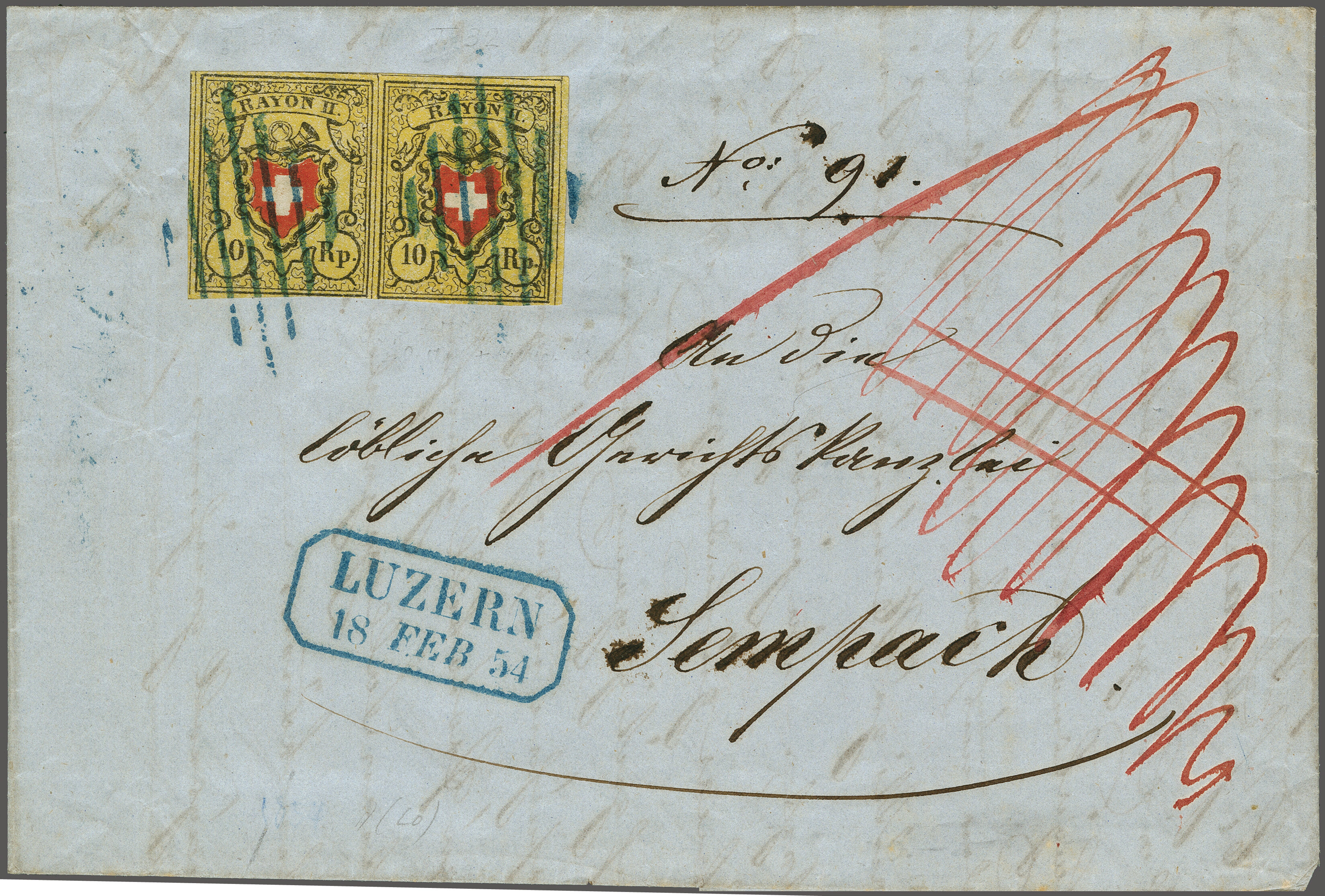 Stein D: Type 11 l/u, farbfr. und breitrandig, klar und übergehend entw. mit blauer Luzerner Raute (AW 43) mit nebenges. kl. Zweikreisstp. "LUZERN 25. JUIL. 1853" in derselben Farbe auf Faltbriefhülle (min. fleckig) im 2.