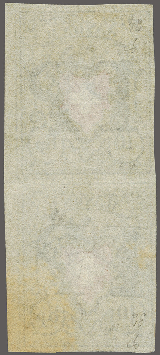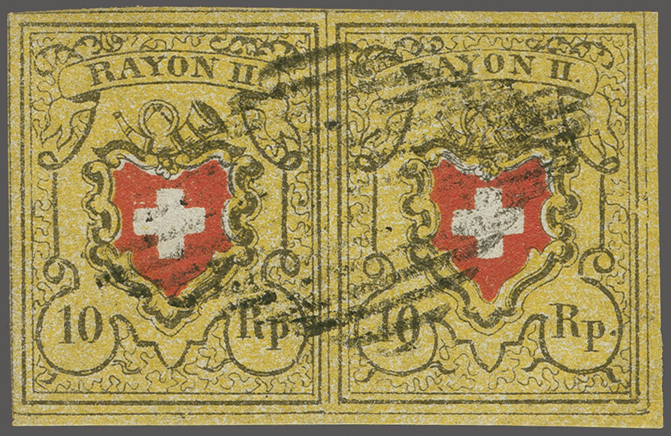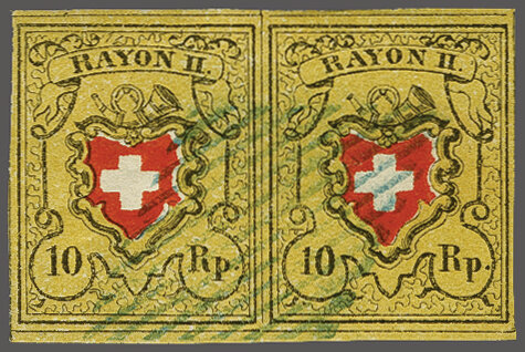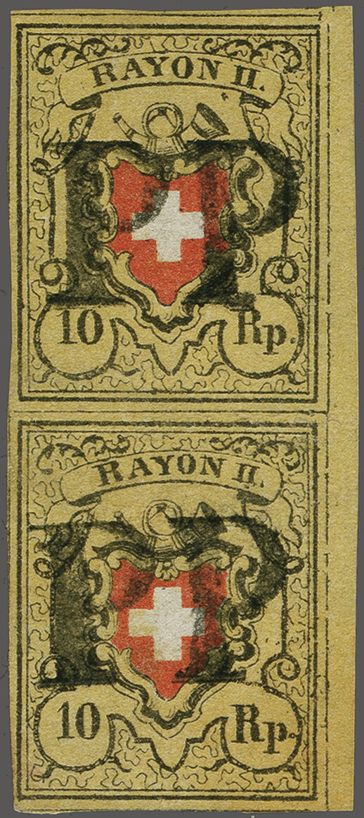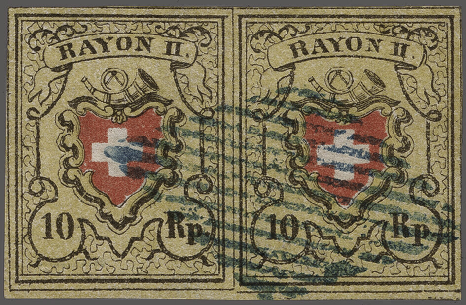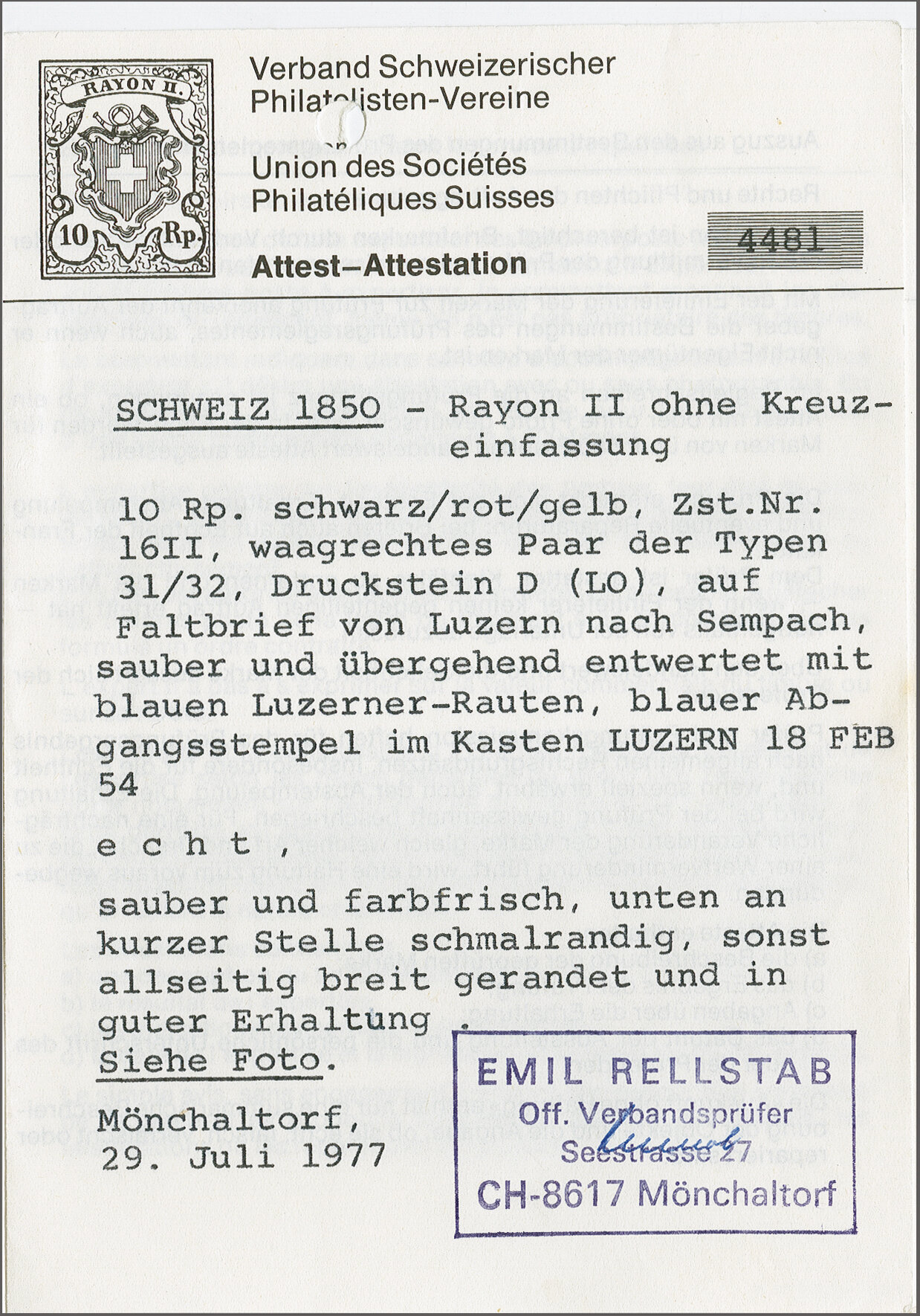 Stein E: Typen 24+32 l/u im senkr. Paar, farbfr. und gut- bis überrandig mit breitem Gruppenabstand rechts, je klar und voll aufgesetzt entw. mit schwarzem "PP" des Postkreis Luzern (AW 206/207). Eine luxuriöse und in dieser