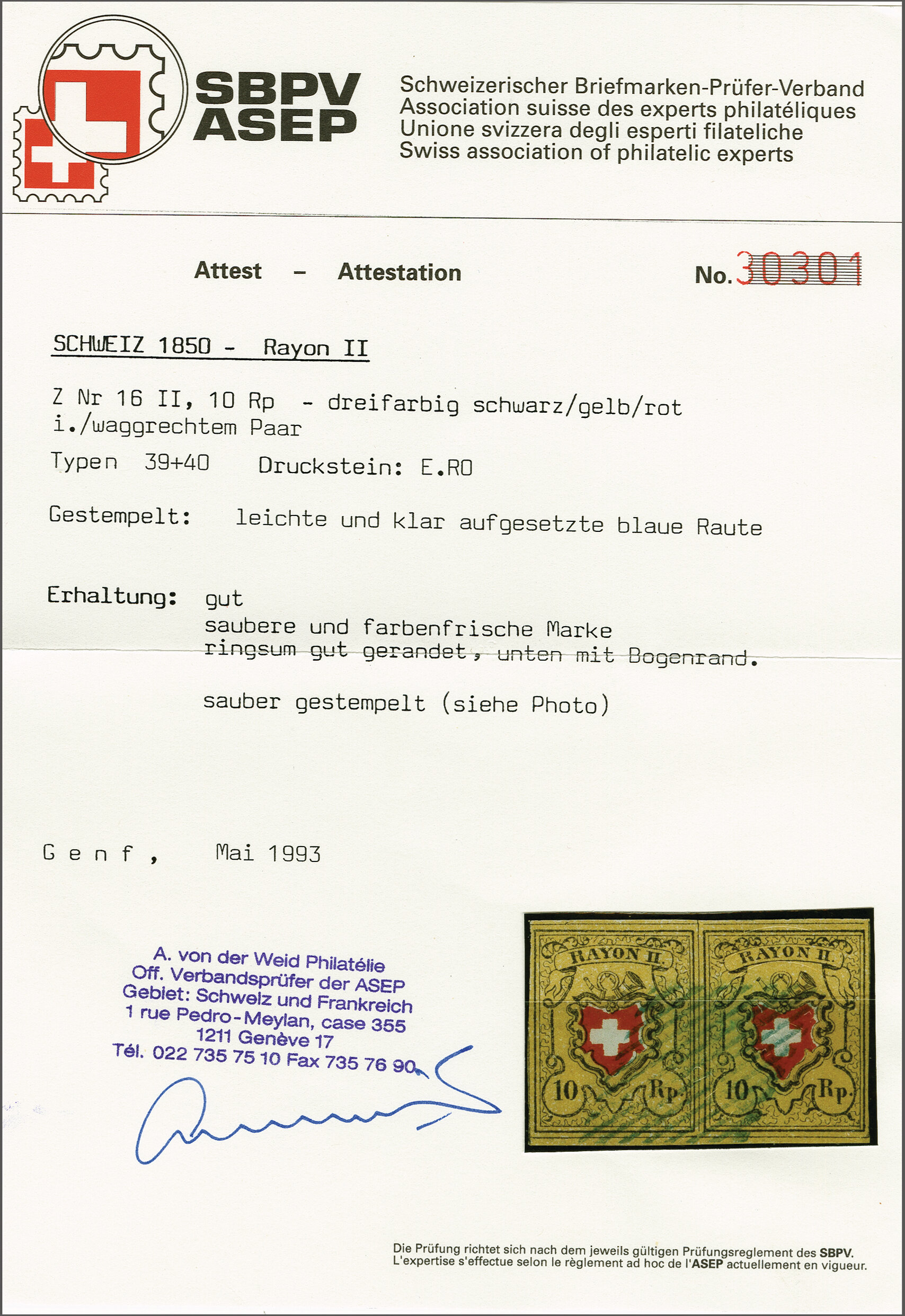 Stein E: Typen 39+40 r/o im waagr. Paar, farbfr. und gut- bis überrandig mit Bogenrand unten, zus. zart und voll aufgesetzt entw. mit blauer eidg. Raute. Attest von der Weid (1993). (Image 1)