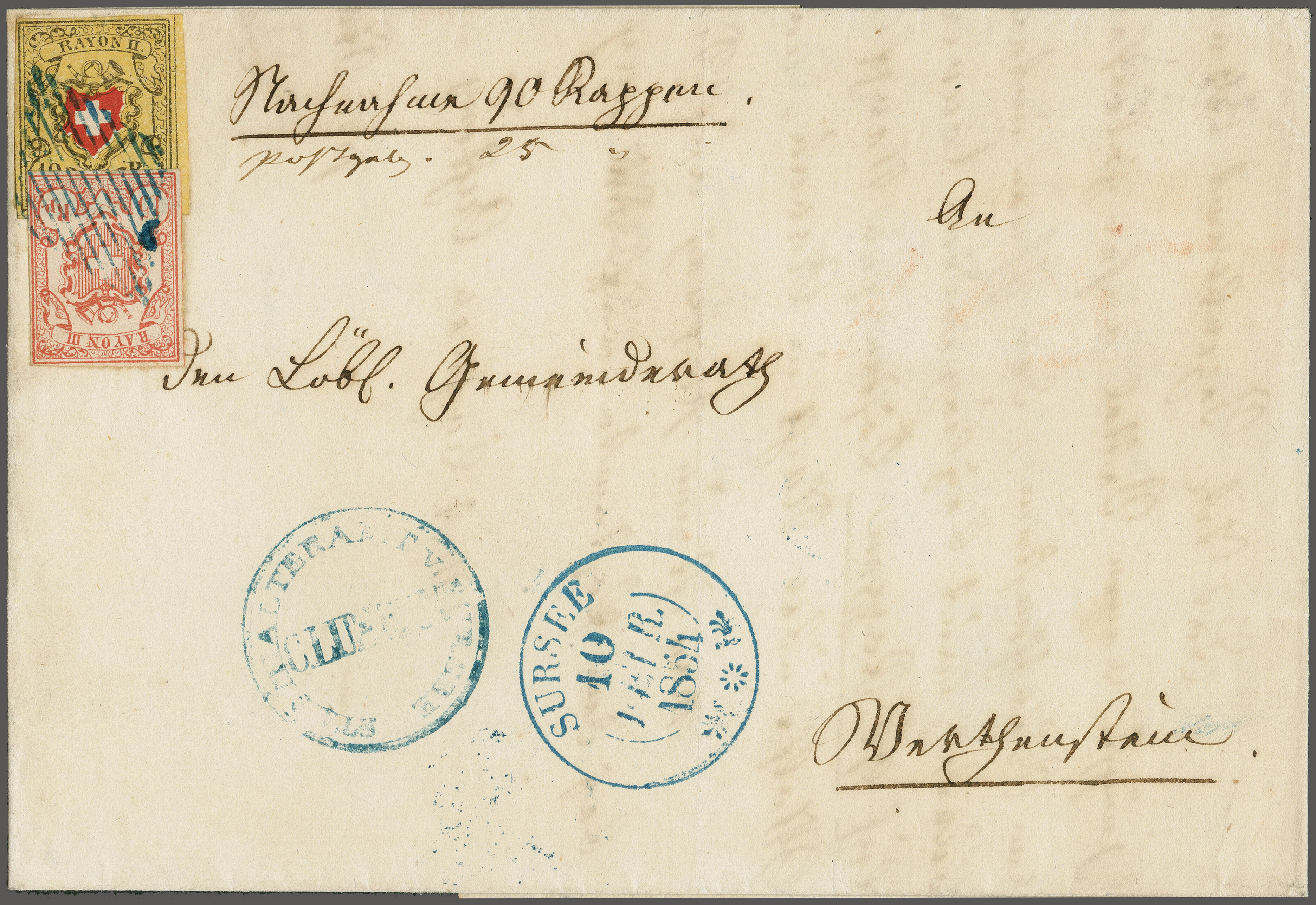 mit blauer eidg. Raute mit nebenges. grossem Zierkreisstempel "SURSEE 10 FEBR. 1854" sowie Absenderstempel "STATTHALTERAMT v. SURSEE / C. LUZERN" auf grossformatigem Nachnahme-Faltbrief über 90 Rp. nach Werthenstein. Rücks. Transitstp. "LUZERN 11