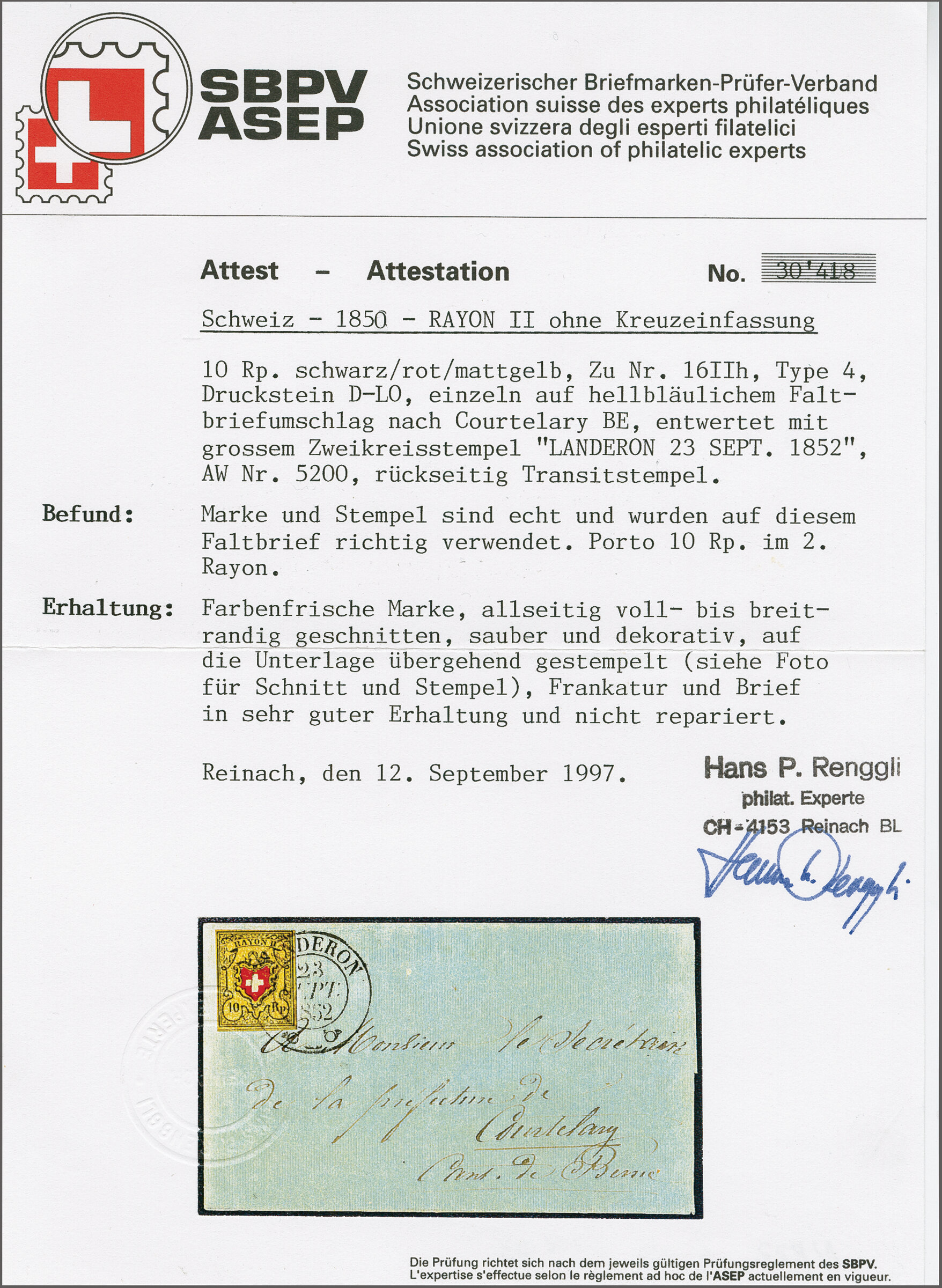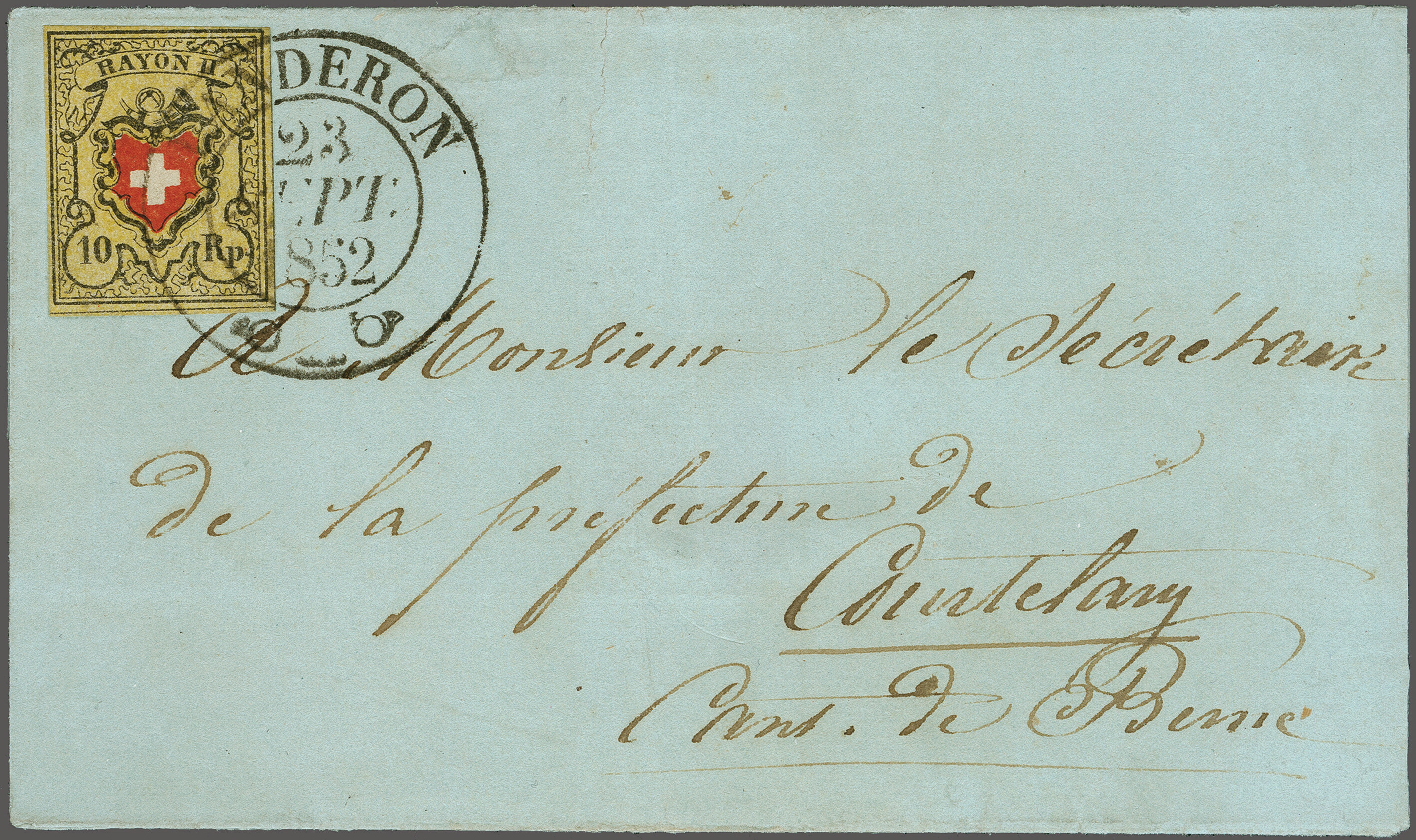 Stein D: Type 4 l/o in der mattgelben Nuance, farbfr. und voll- bis überrandig, zartklar, dekorativ und übergehend entw. mit grossem Zierkreisstempel "LANDERON 23. SEPT 1852" in schwarz auf frischer Faltbriefhülle im 2.
