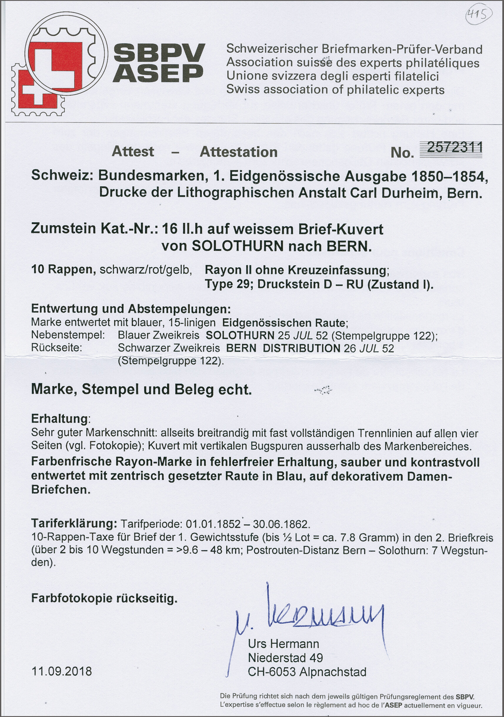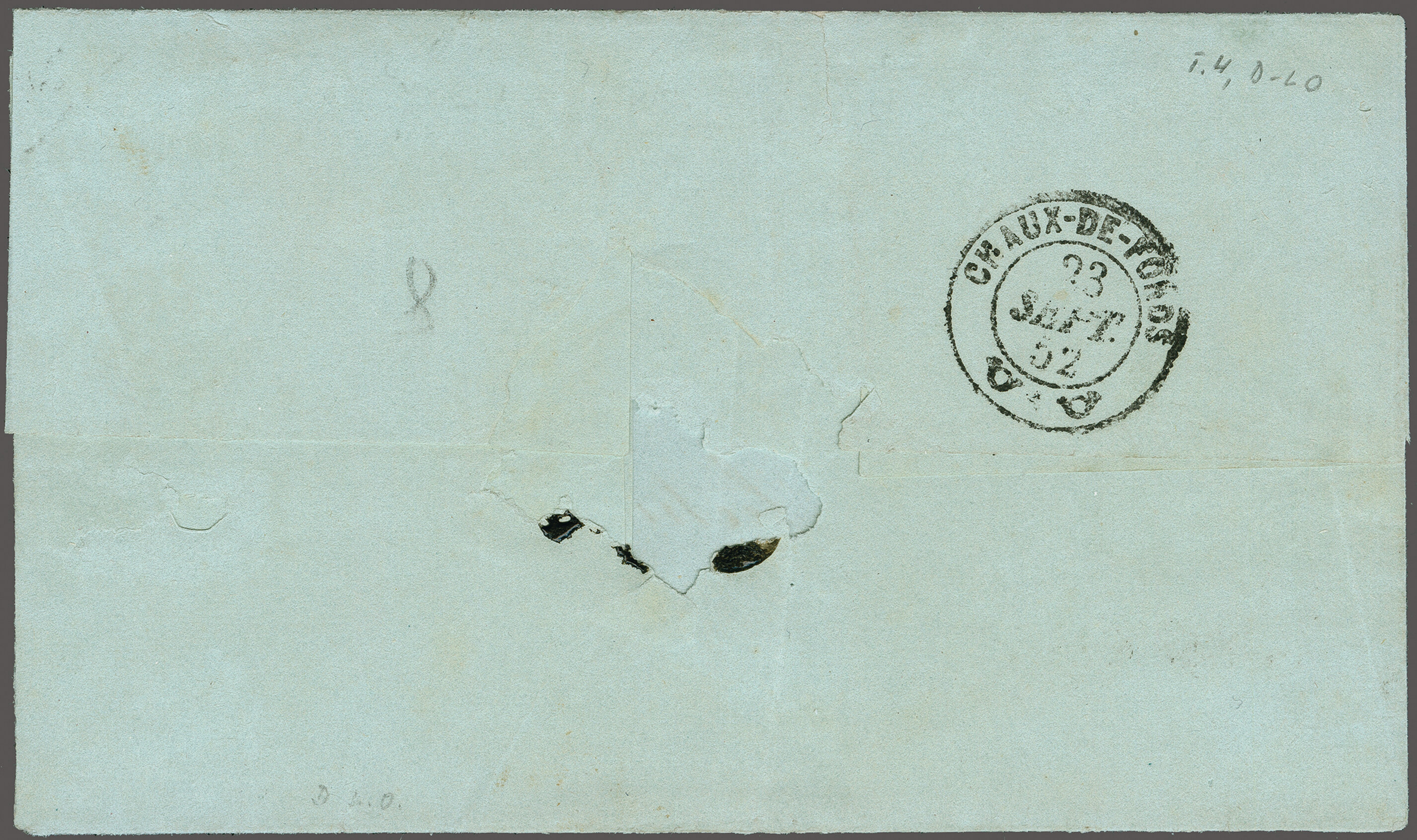 Briefkreis nach Courtelary (BE). Rücks. Transitstp. "CHAUX-DE-FONDS 23. SEPT. 52". Eine elegante und seltene Entwertung; Attest Renggli (1997). Provenienz: Sammlung Rolf P. Salinger, 317. Heinrich Köhler-Auktion, Wiesbaden Februar 2003, Los 173;