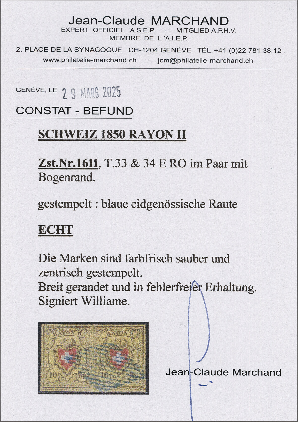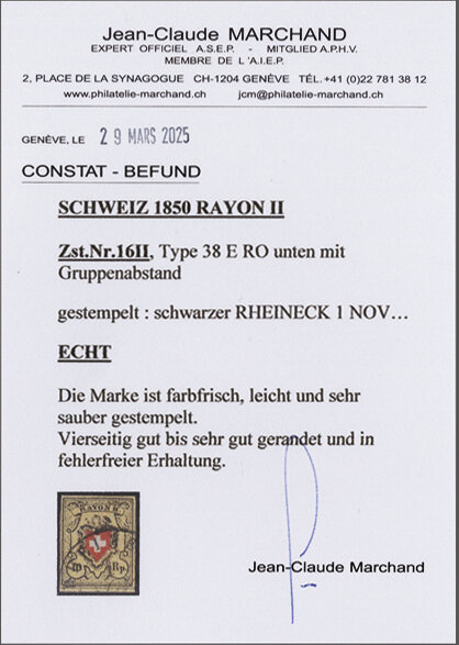 Stein E, Type 4 mit Gruppenabstand unten, eine farbintensive und breit- bis überrandige Prachteinheit, zart und zentrisch entw. mit blauer eidg. Raute. Attraktives Stück; signiert Williame; Befund Marchand (2025) SBK = CHF
