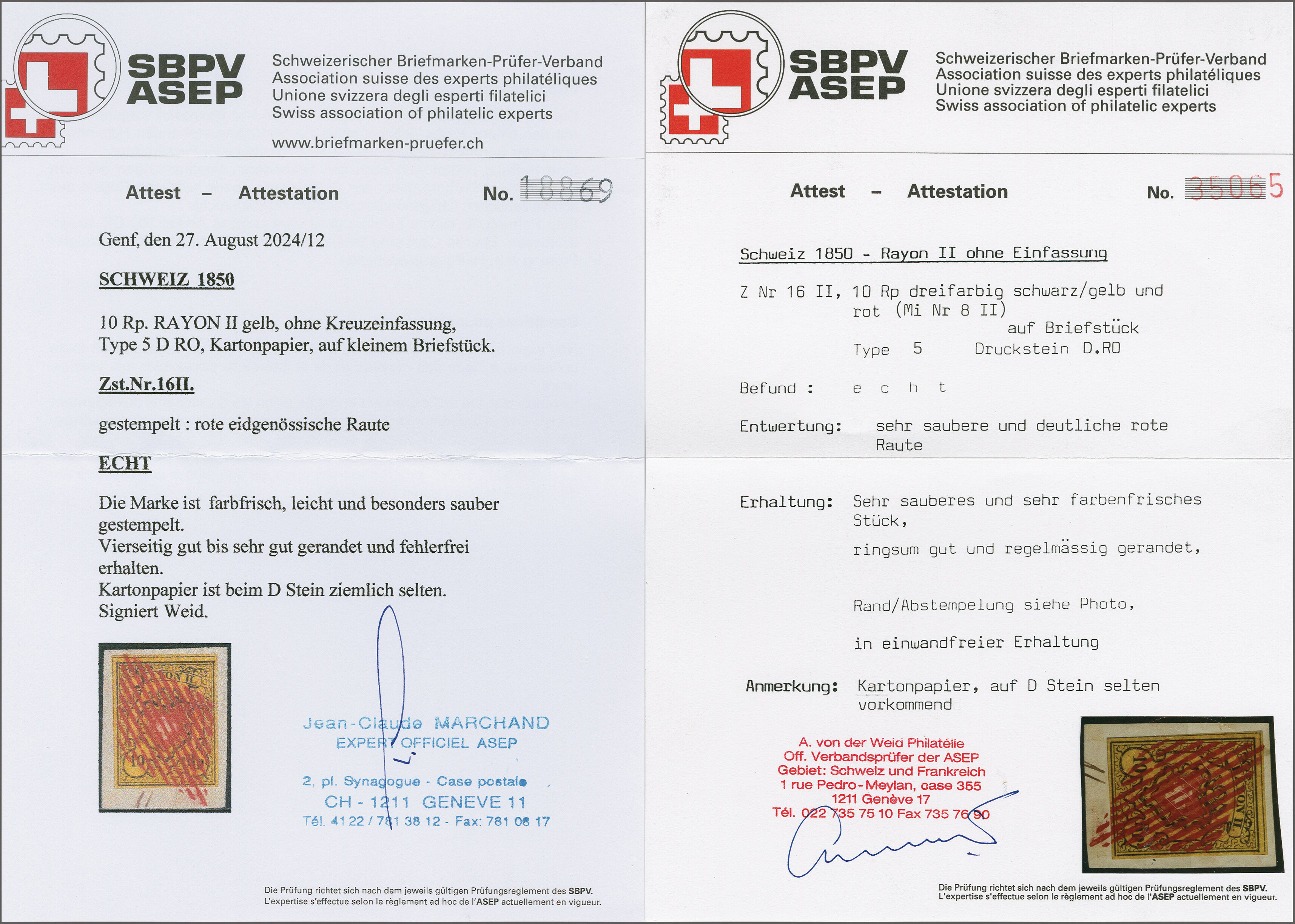 Stein D Type 5 r/o auf Kartonpapier, ein seltenes Papier mit diesem Stein, farbfr., gut bis überrandig, ideal, dekorativ und übergehend entw. mit roter eidg. Raute auf Briefstück. Atteste von der Weid, Marchand (2024). (Image 1)