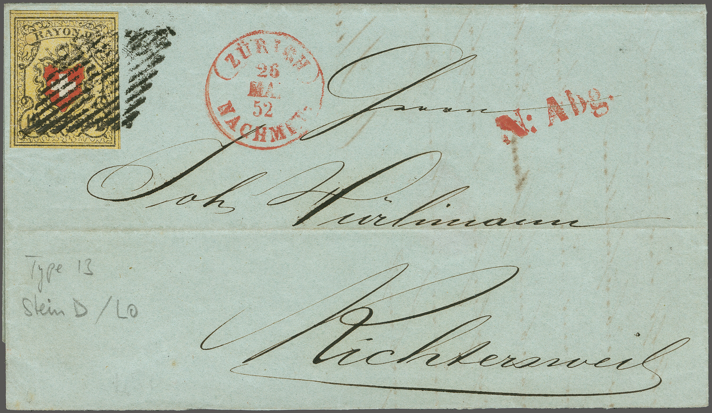 Stein D: Type 13 l/o mit marmoriertem Gelbdruck, farbfr. und breitrandig, klar und übergehend entw. mit schwarzer eidg. Raute mit nebenges. rotem Zierlinienstempel "ZÜRICH 26 MARS 52 NACHMIT:" sowie Stabstp. "N: Abg." (AW 786)
