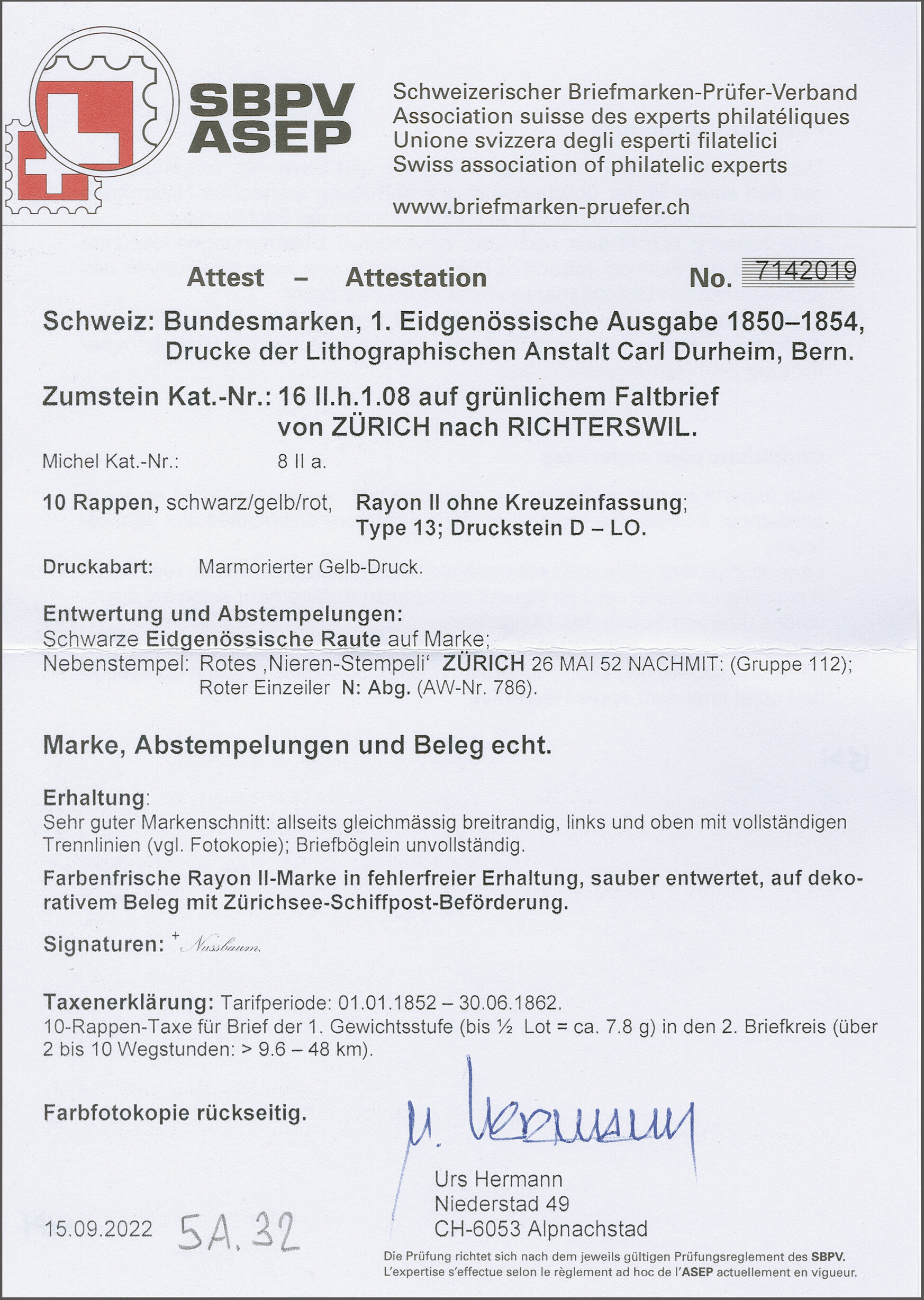 in derselben Farbe auf frischem Faltbrief (zwei Klappen fehlend) per Schiffspost über den Zürichsee nach Richterswil. Signiert Nussbaum; Attest Hermann (2022). (Image 1)