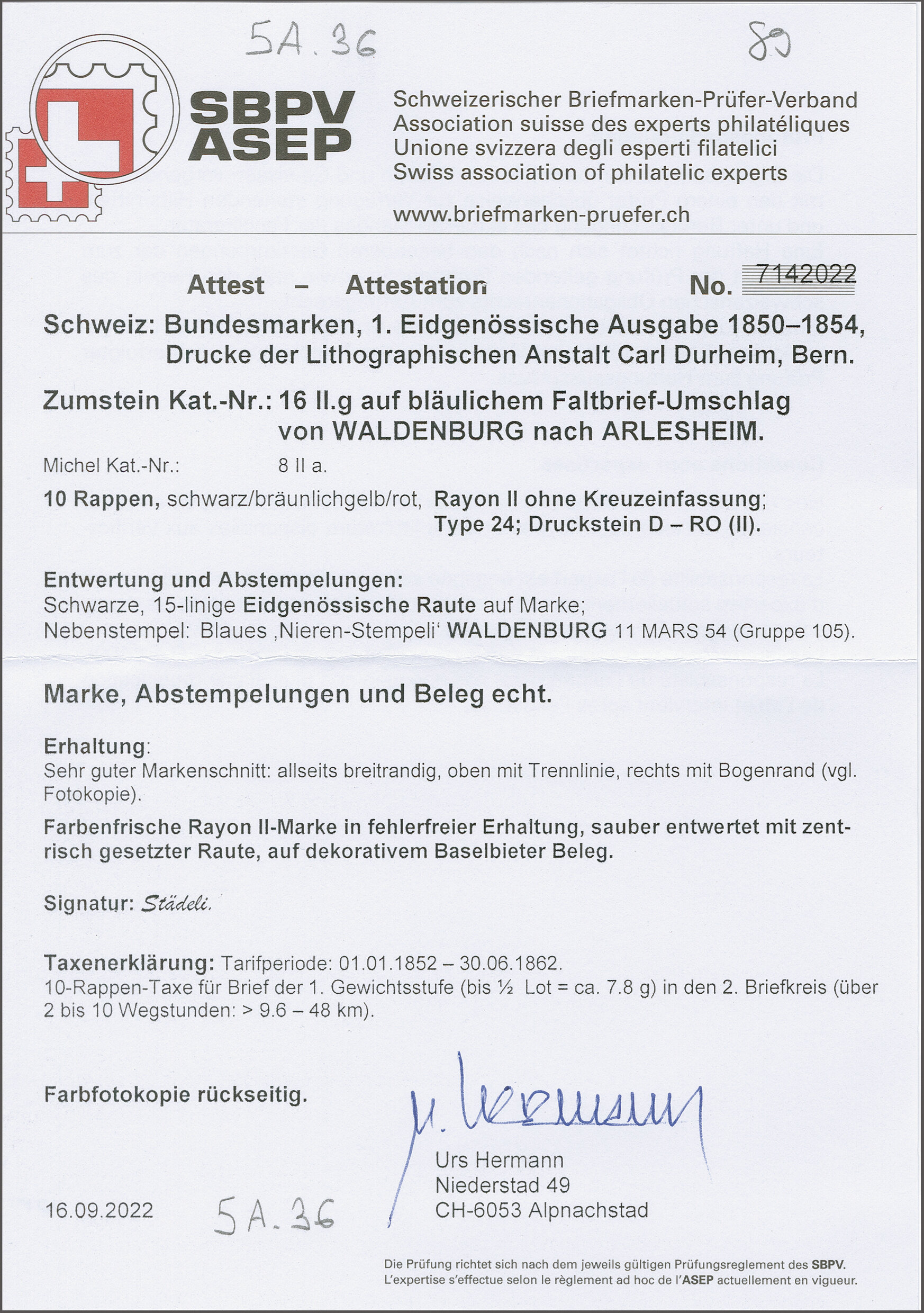 54" auf sauberer Faltbreifhülle nach Arlesheim (BL). Ein schöner Baselbieter Brief; signiert Städeli, Attest Hermann (2022). (Image 1)