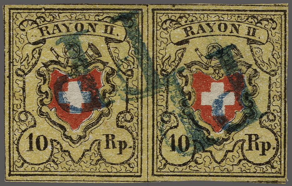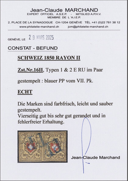 Stein E: Typen 1+2 r/u im waagr. Paar, farbfr. und voll- bis meist breitrandig, je zart und voll aufges. entw. mit kleinem blauem "PP" des Postkreis Luzern (AW 207). Befund Marchand (2025). (Image 1)