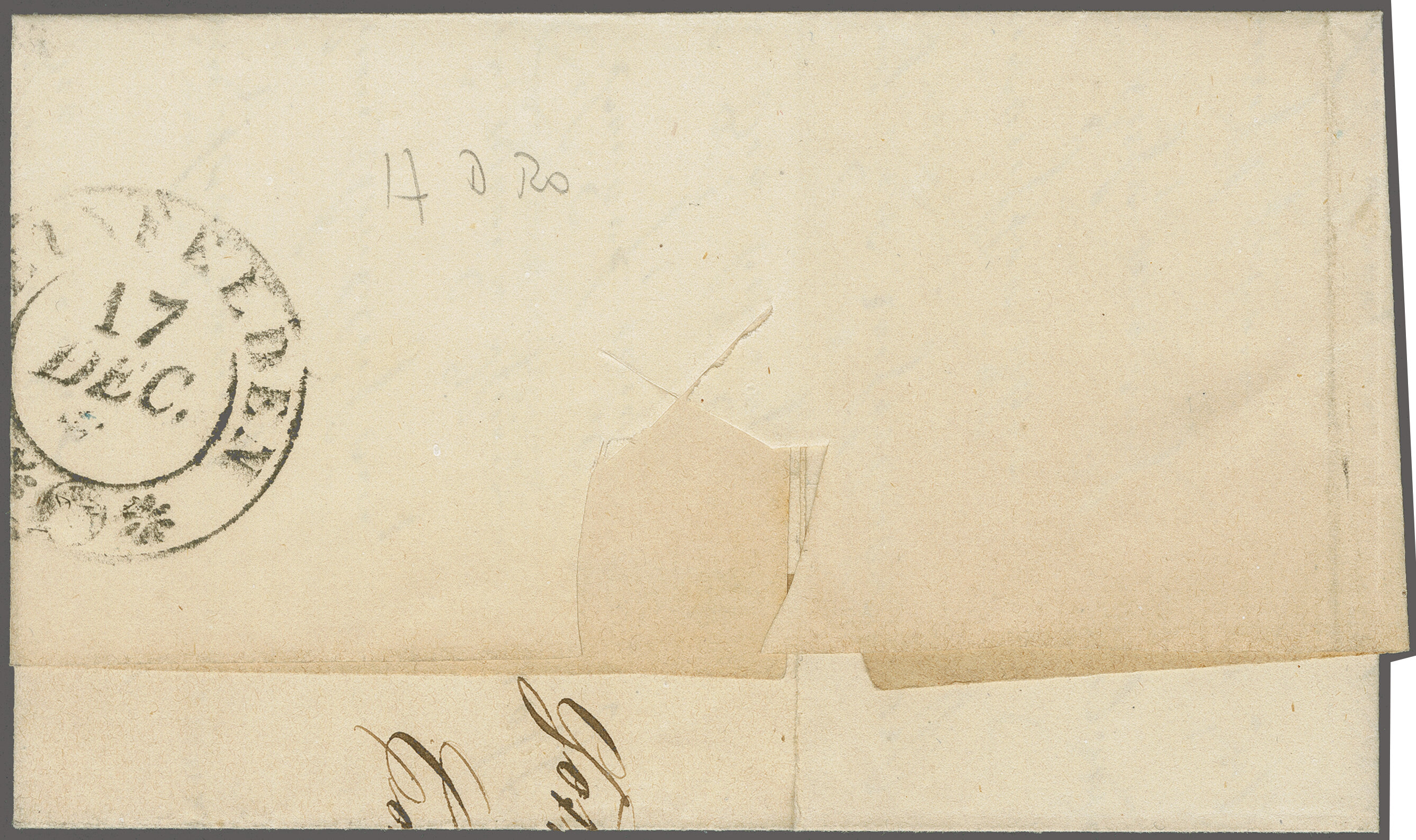 17 DEC 1852" in derselben Farbe auf kleinformatigem komplettem Faltbrief aus Gottlieben nach Weinfelden, rücks bei Ankunft Zierzweikreis vom gleichen Tag. Rückseitig Ankunftsstempel vom Folgetag. Brief links leicht umgefaltet, ein hübsches Brieflein,