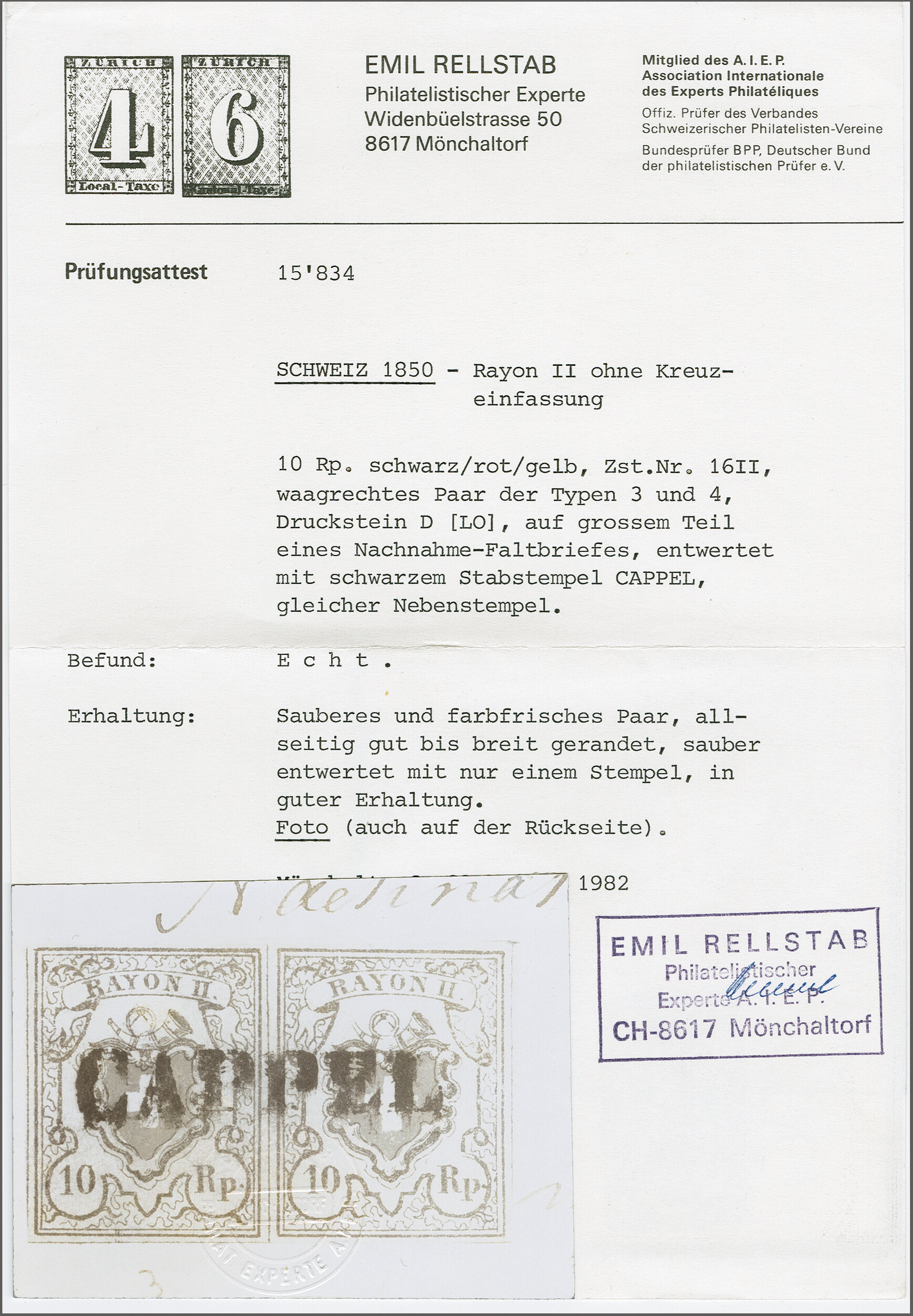 Stein D: Typen 3+4 l/o im waagrechten Paar mit Plattenfehler "Teil einer roten Anlagelinie" rechts oben, farbfr. und sehr gut- bis meist überrandig, zus. klar und zentrisch entw. mit schwarzem Stabstempel CAPPEL auf Nachnahme