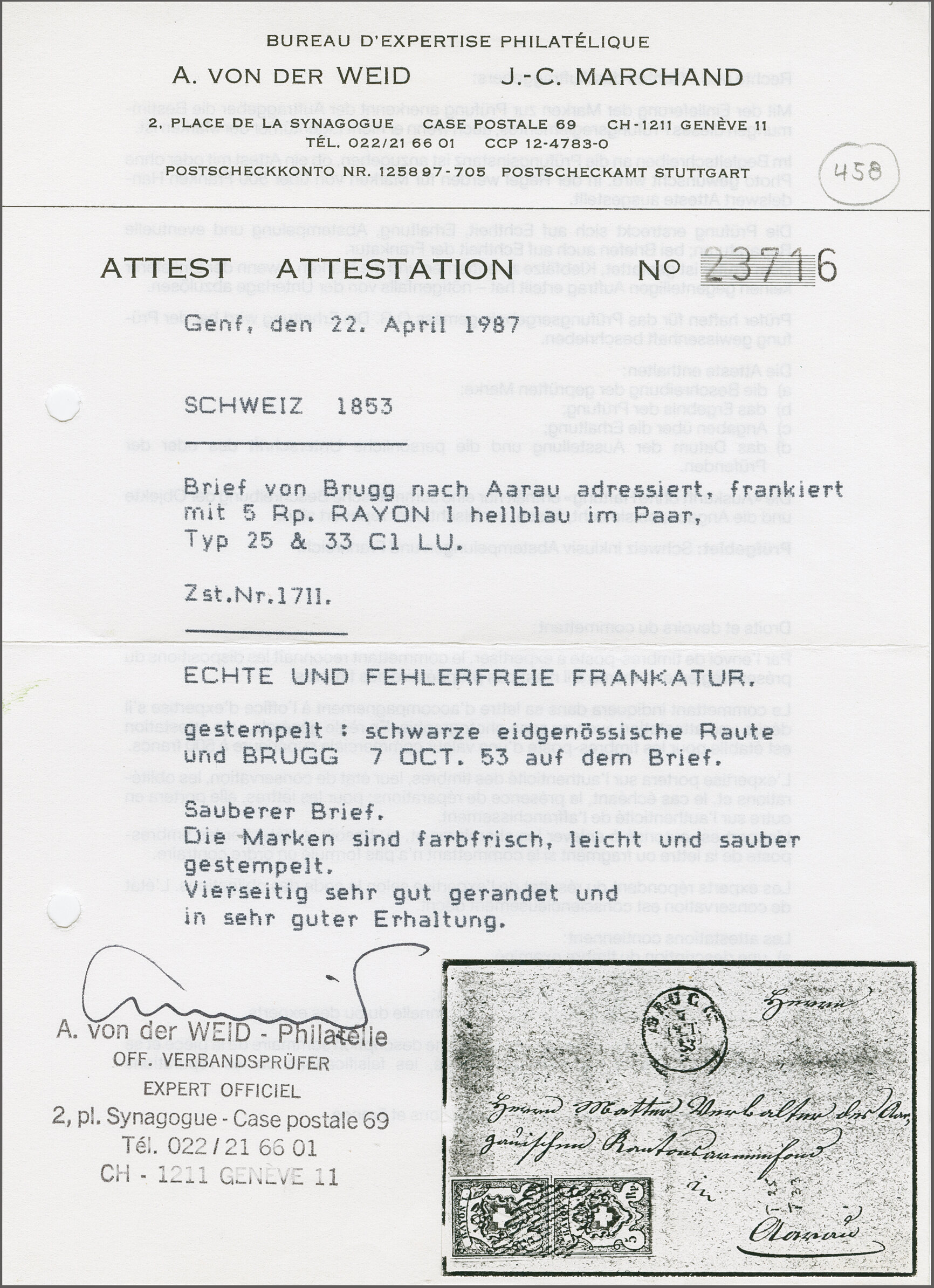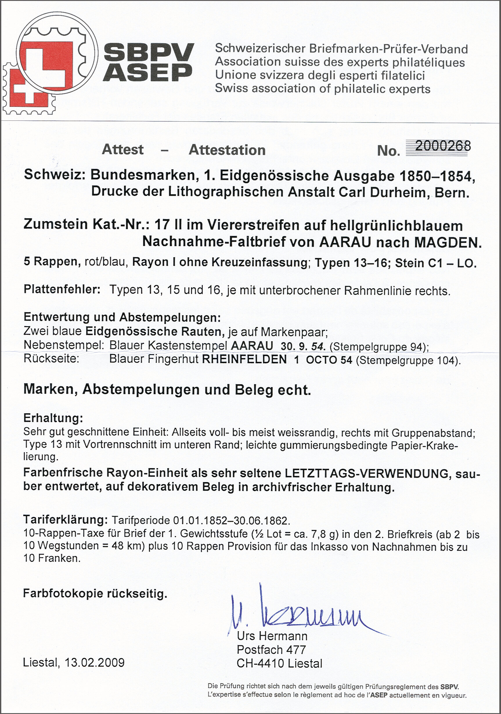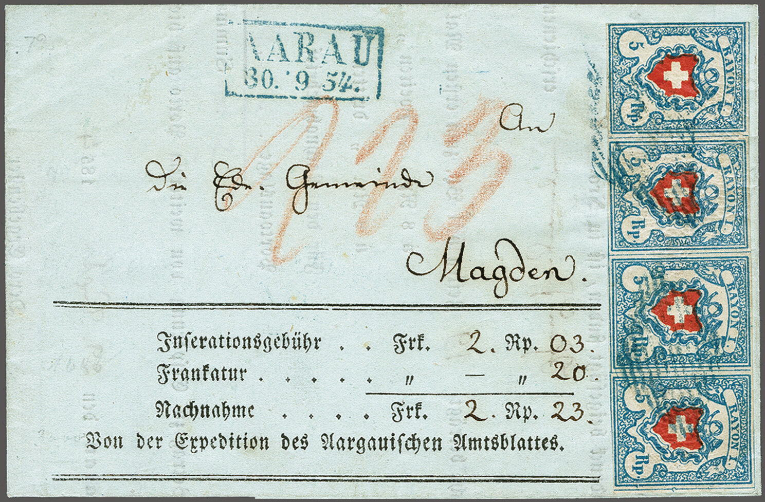 Raute mit nebenges. blauem "AARAU 30.9.54" im Kasten auf vollständigem Nachnahme-Faltbrief nach Magden mit rücks. blauem Transit "RHEINFELDEN 1 OCTO 54". Ein sehr attraktiver Brief mit einwandfreier seltener Einheit, verwendet wahrscheinlich als