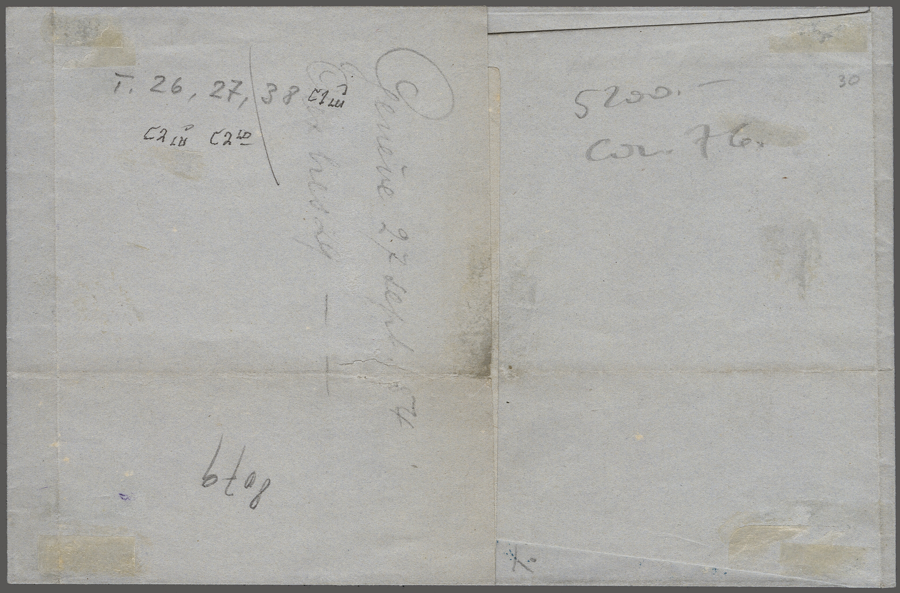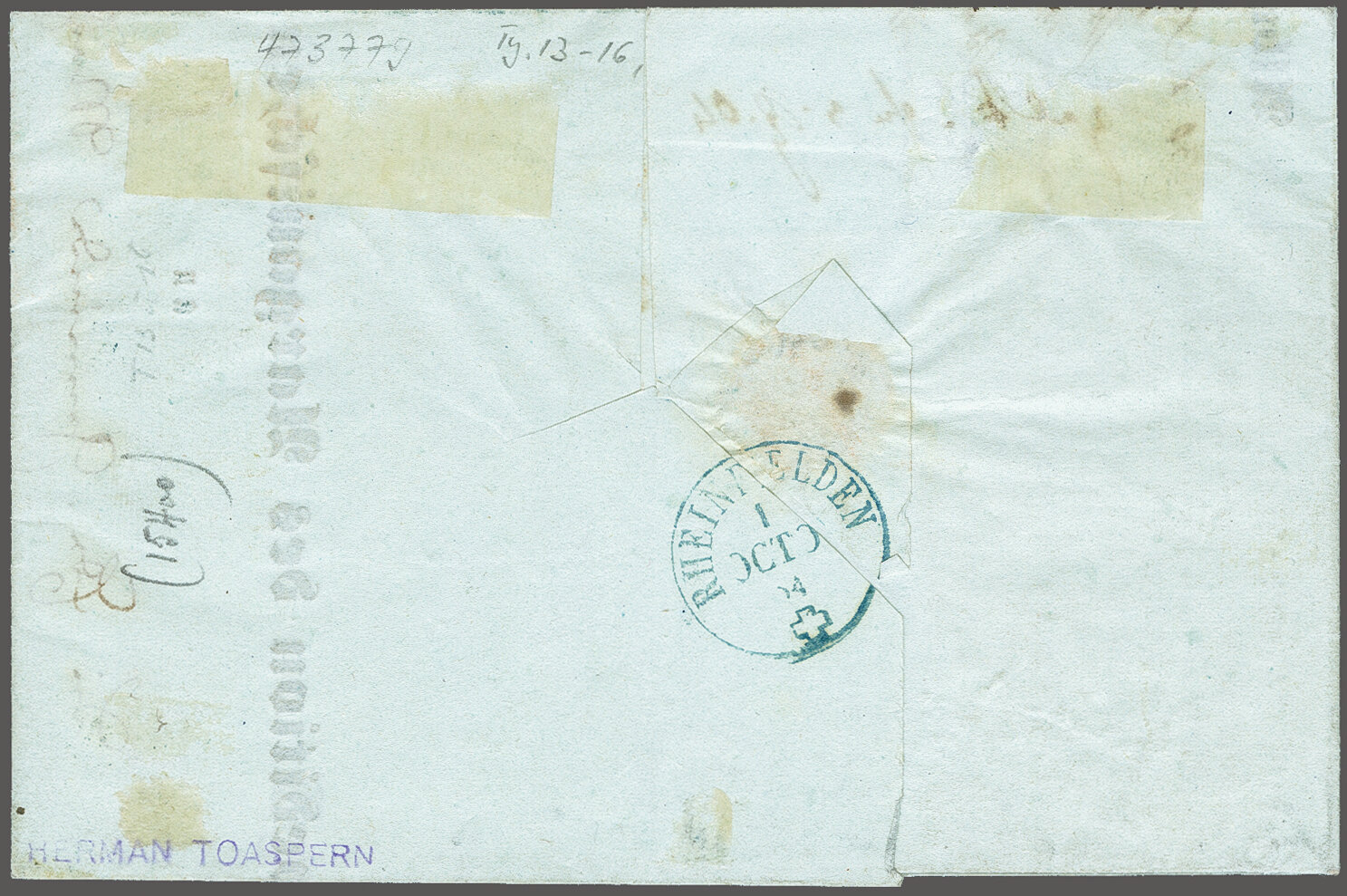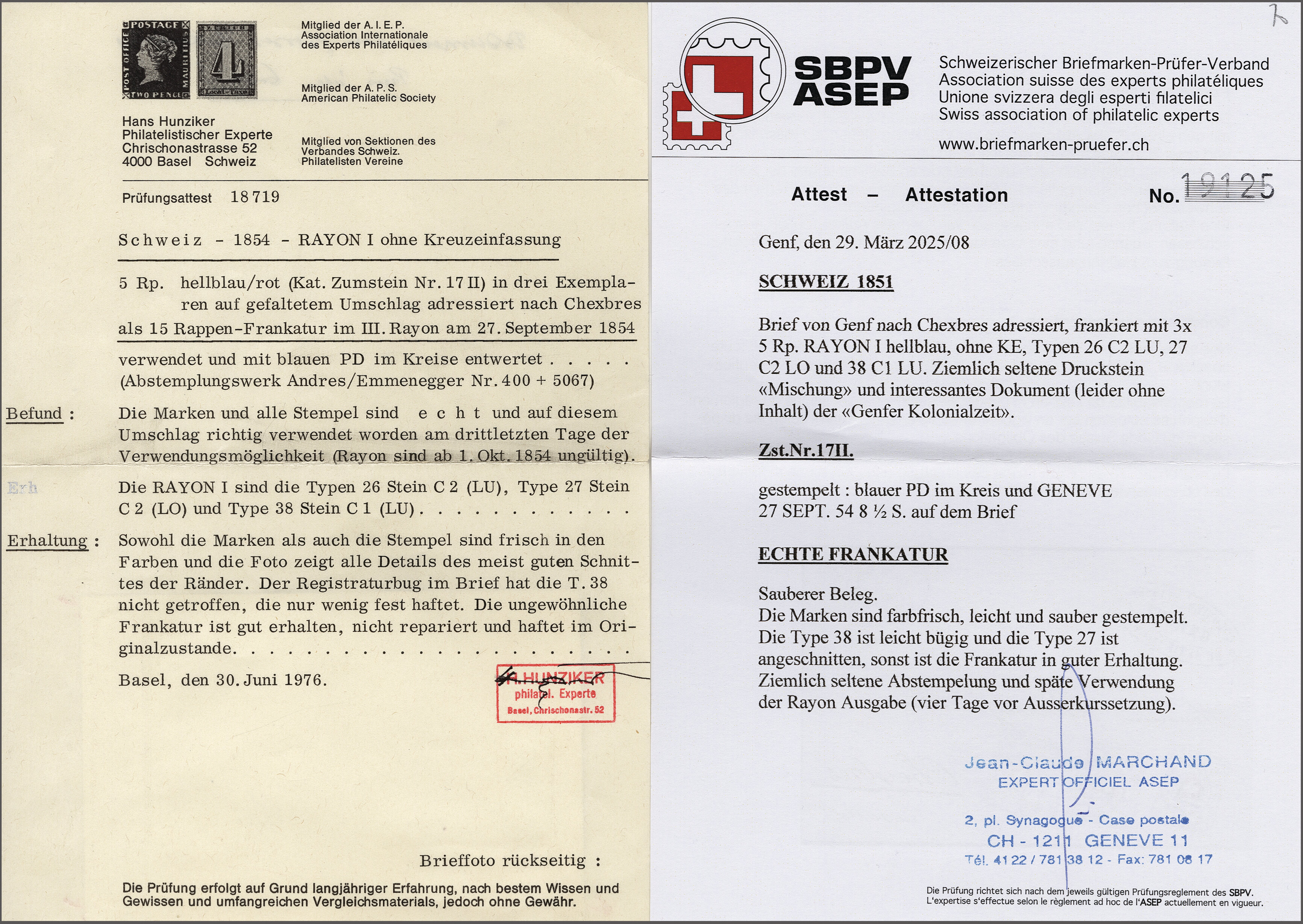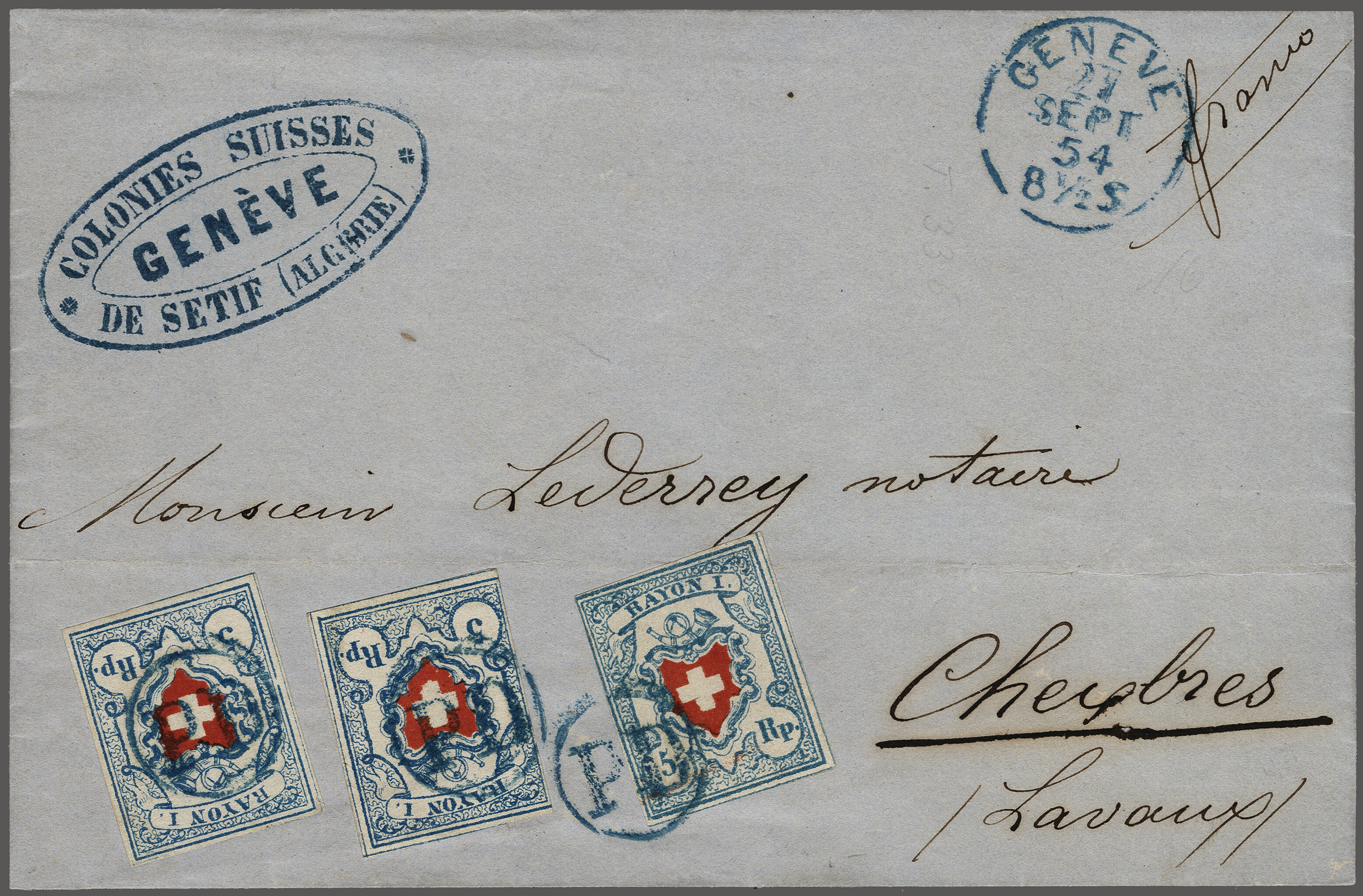 geschnitten), je klar und zum Teil übergehend entw. mit blauem "PD" im Kreis von Genf (AW 400) mit nebenges. Einkreisstp. "GENÈVE 27. SEPT. 54 8½S" und ovalem Absenderstempel "COLONIES SUISSES / DE SETIF (ALGÉRIE) / GENÈVE" in derselben Farbe auf