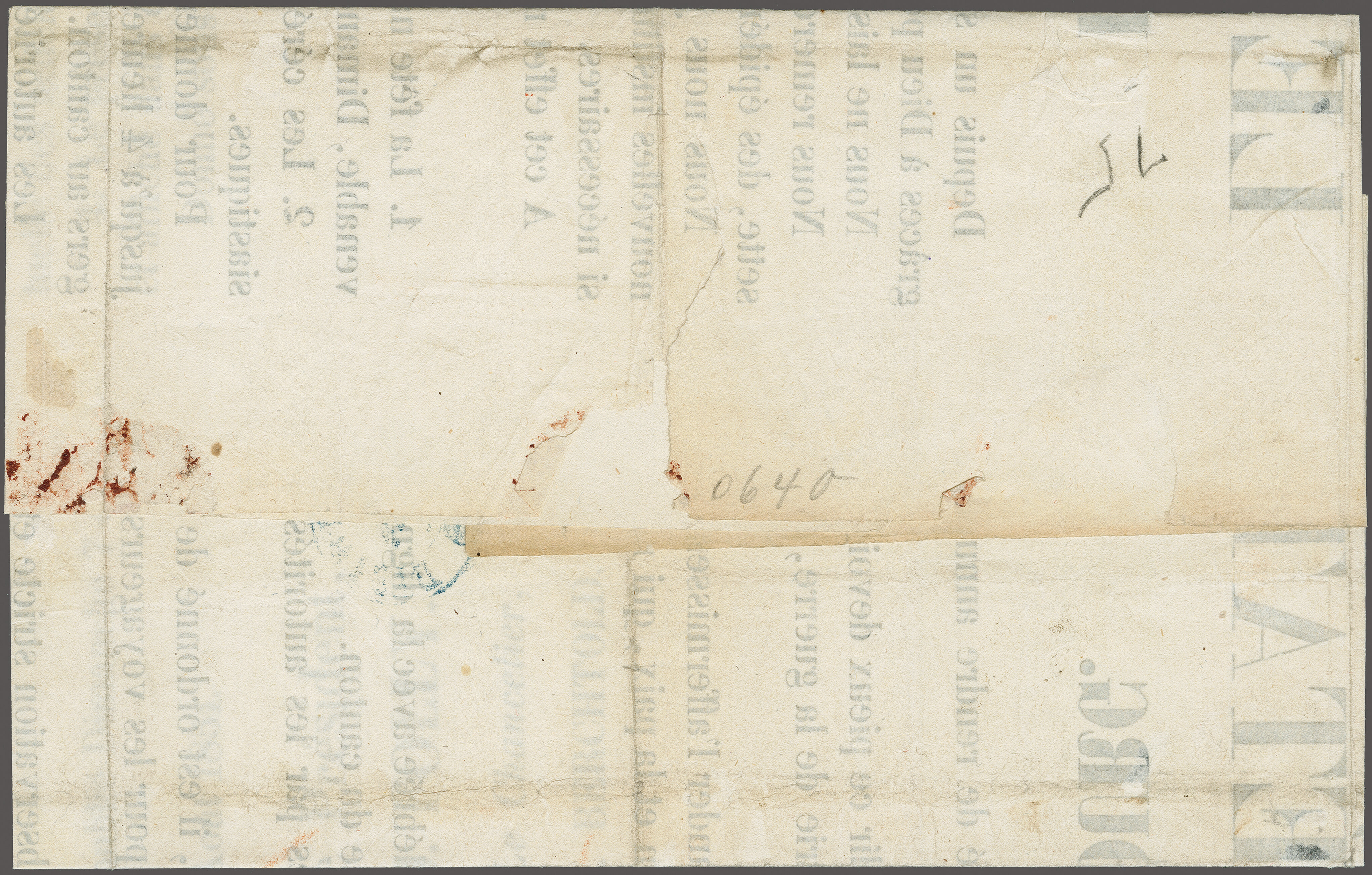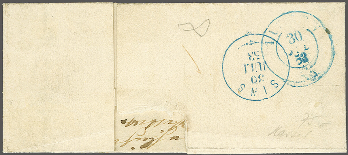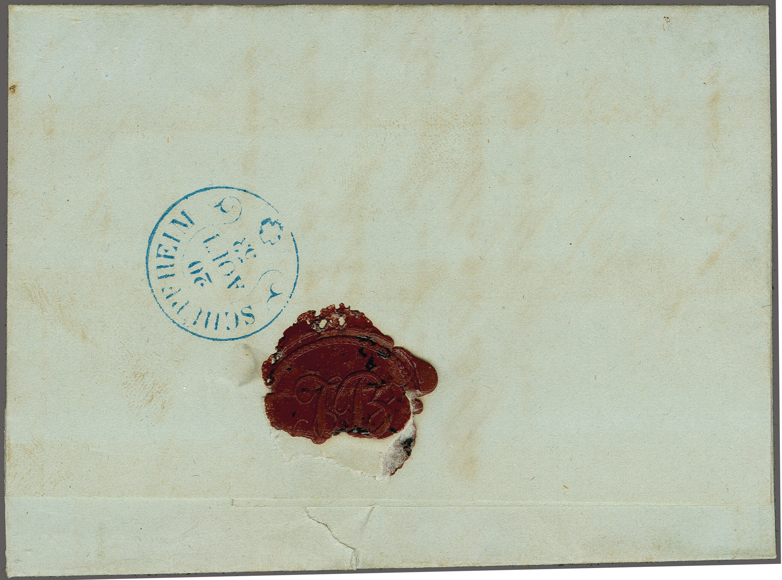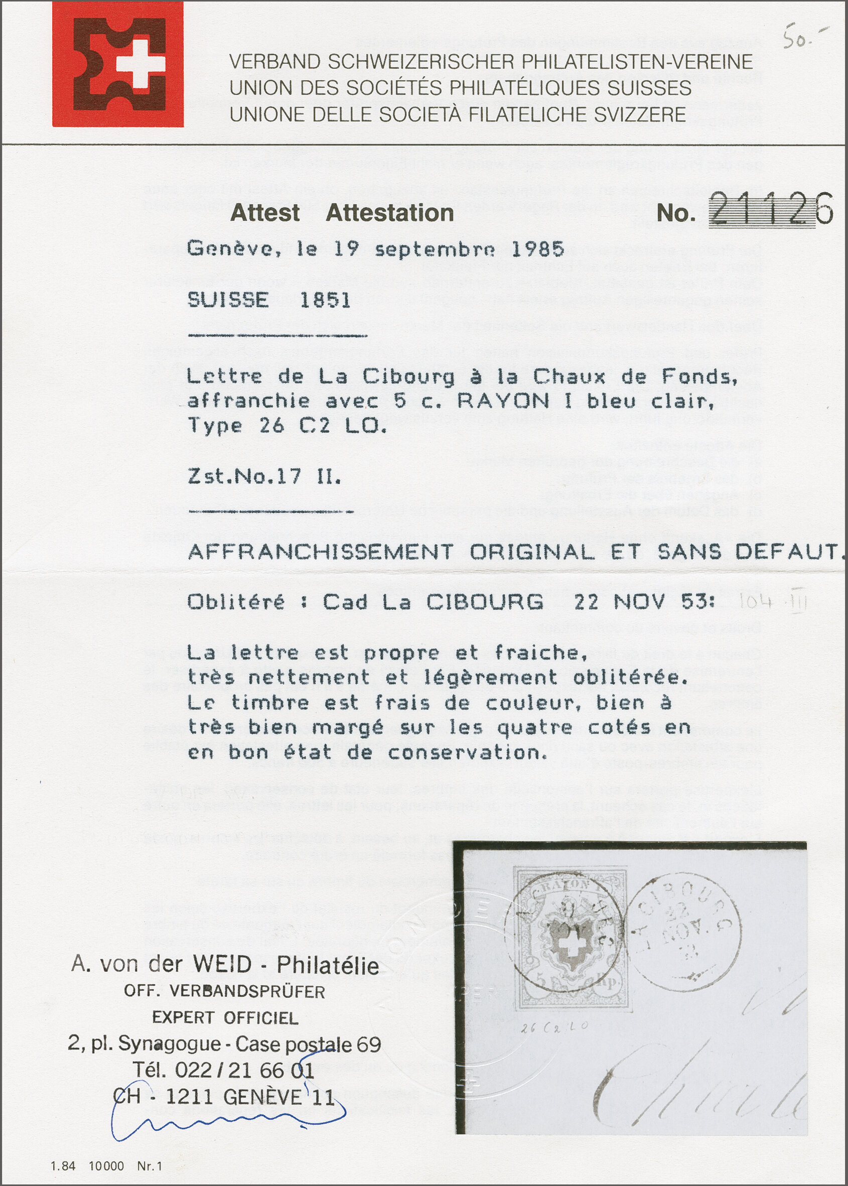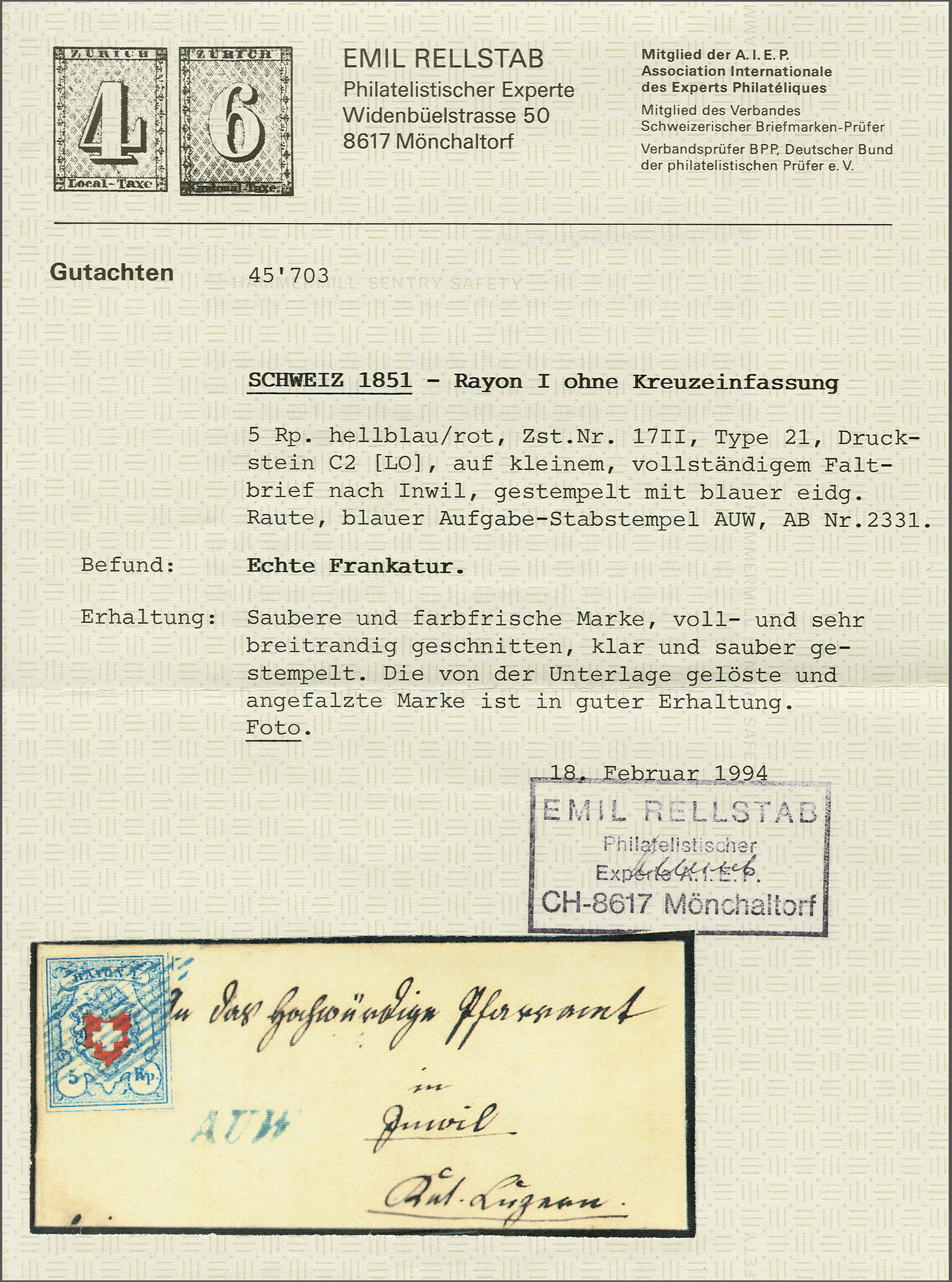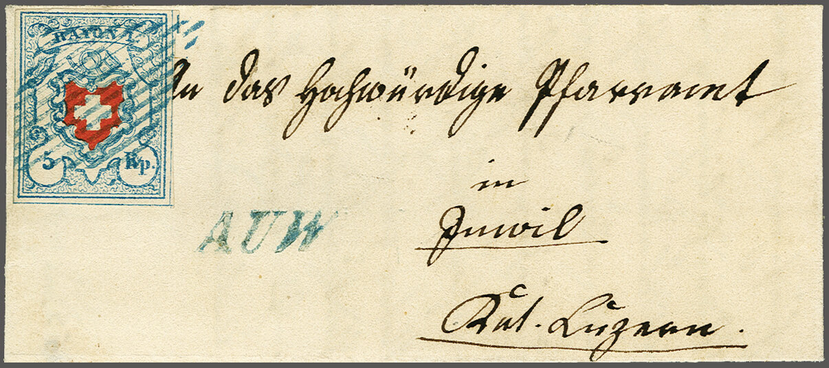 Stein C2: Type 21 l/o, farbfr. und breit- bis überrandig (abgelöst und zurück geklebt), klar und übergehend entw. mit blauer eidg. Raute mit nebenges. kursivem Stabstempel "AUW" auf kleinformatigem Faltbrief im 1. Briefkreis