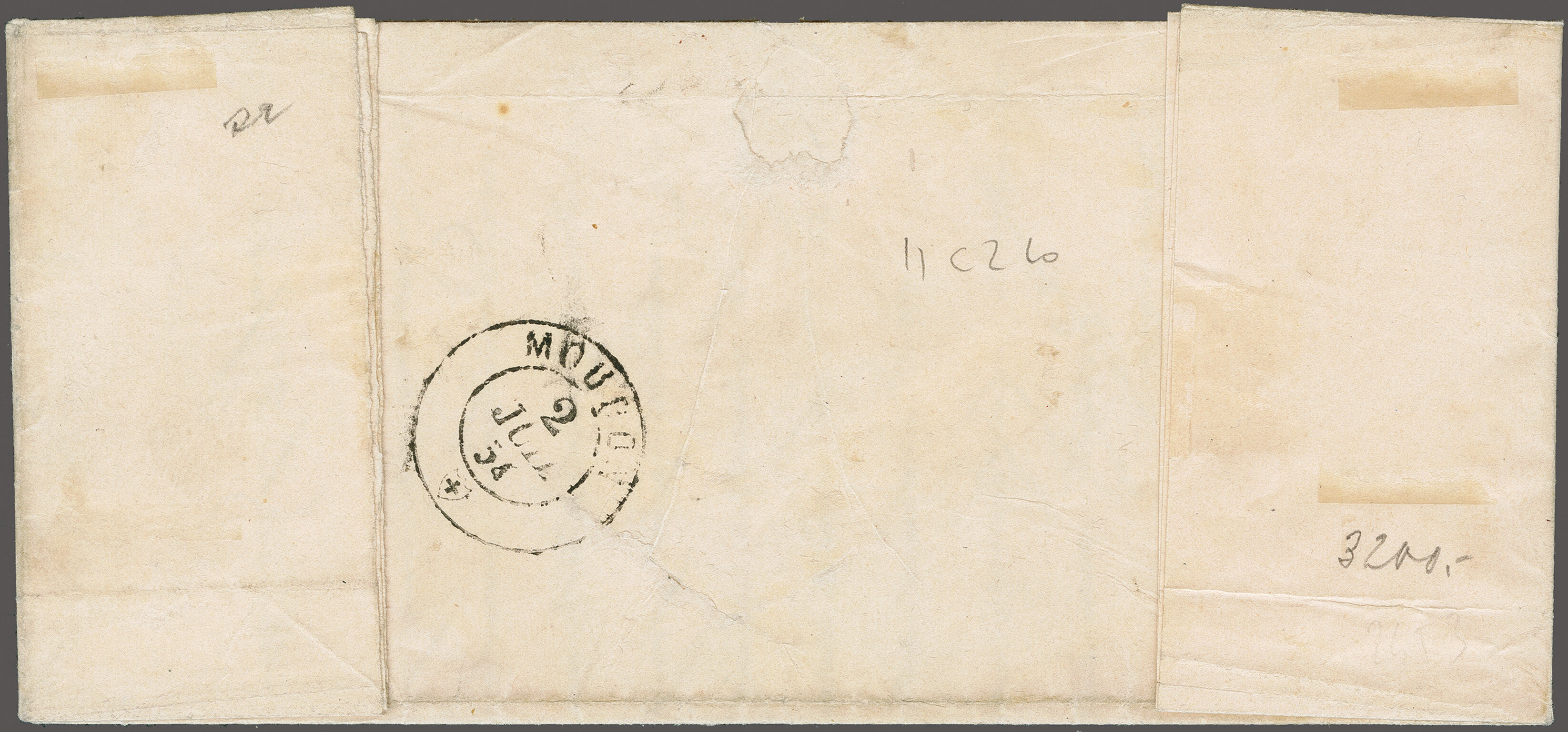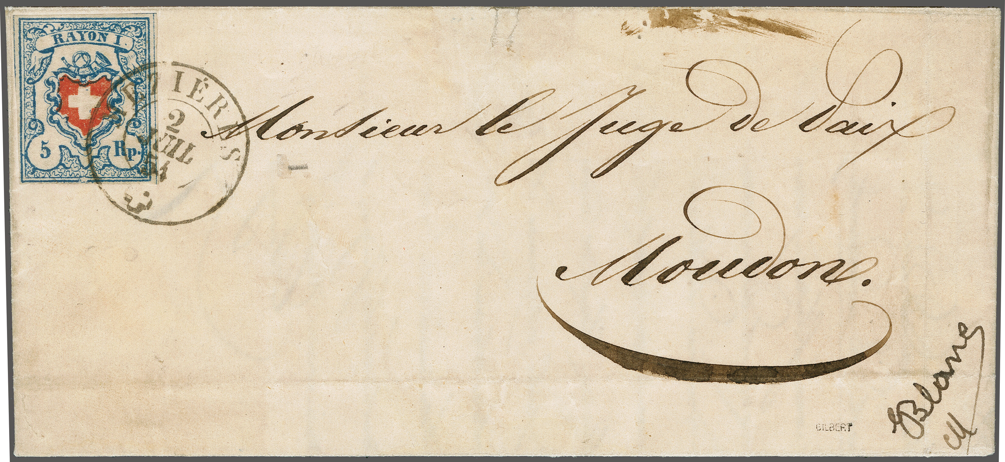 Zweikreisstempel "MEZIÈRES 2 JUIL 54" auf kleinformatigem Faltbrief an den Friedensrichter in Moudon. Eine schöne Kombination der Retouche mit dieser ungewöhnlichen Waadtländer Entwertung; Attest Marchand (2015). (Image 1)