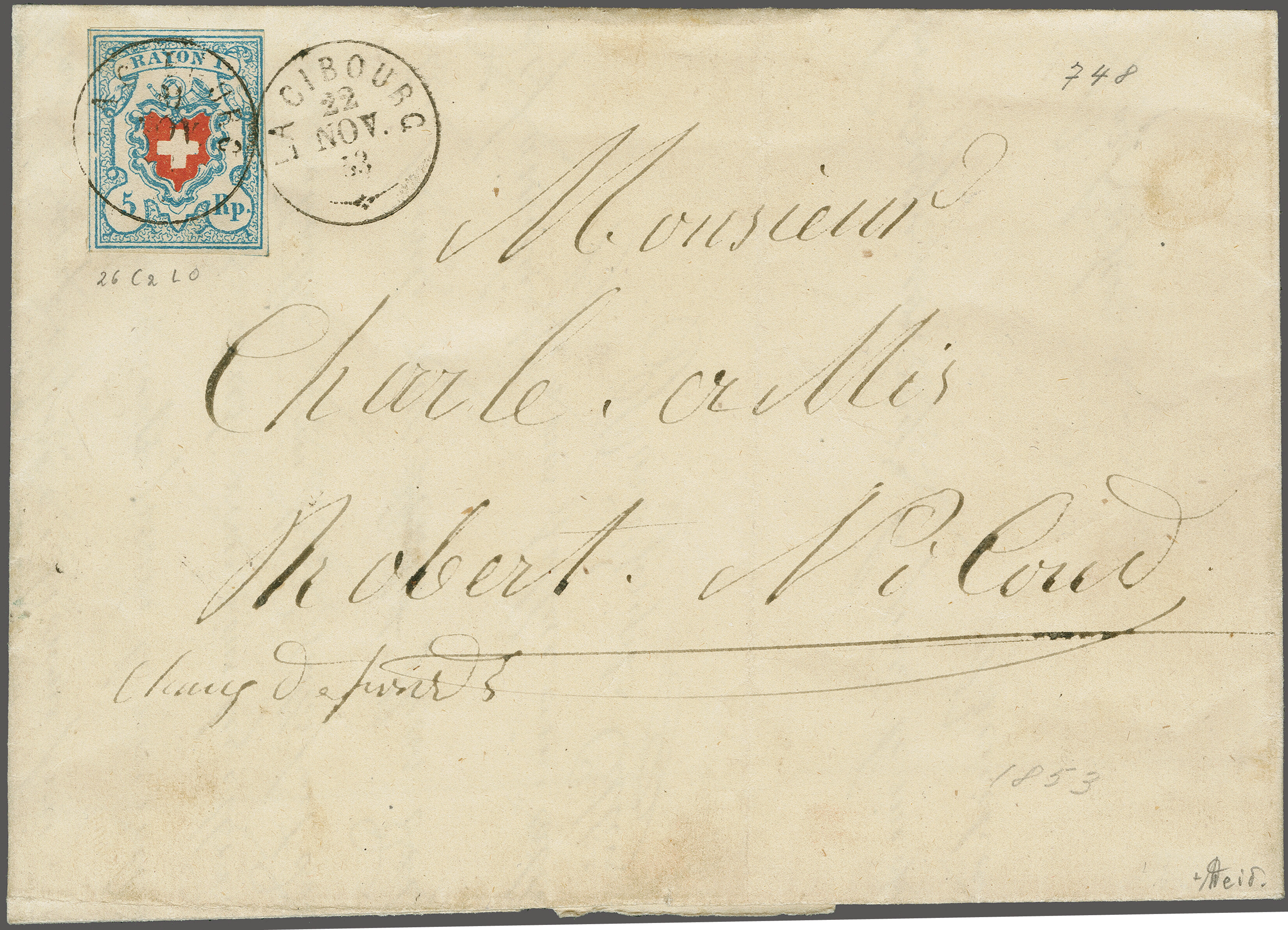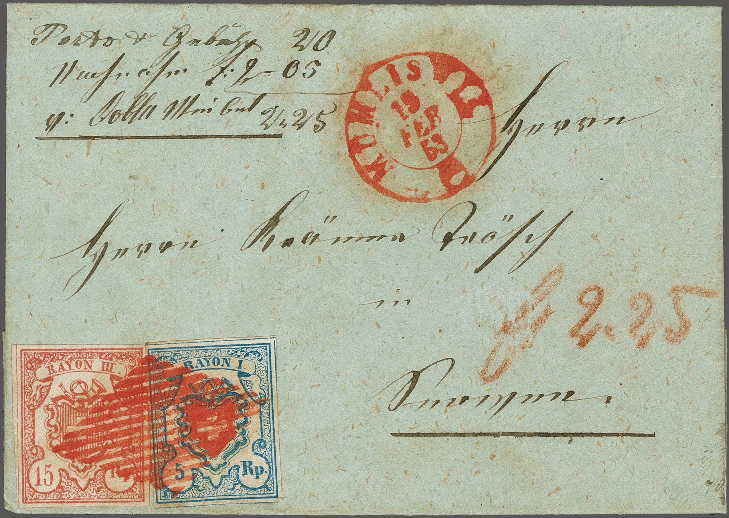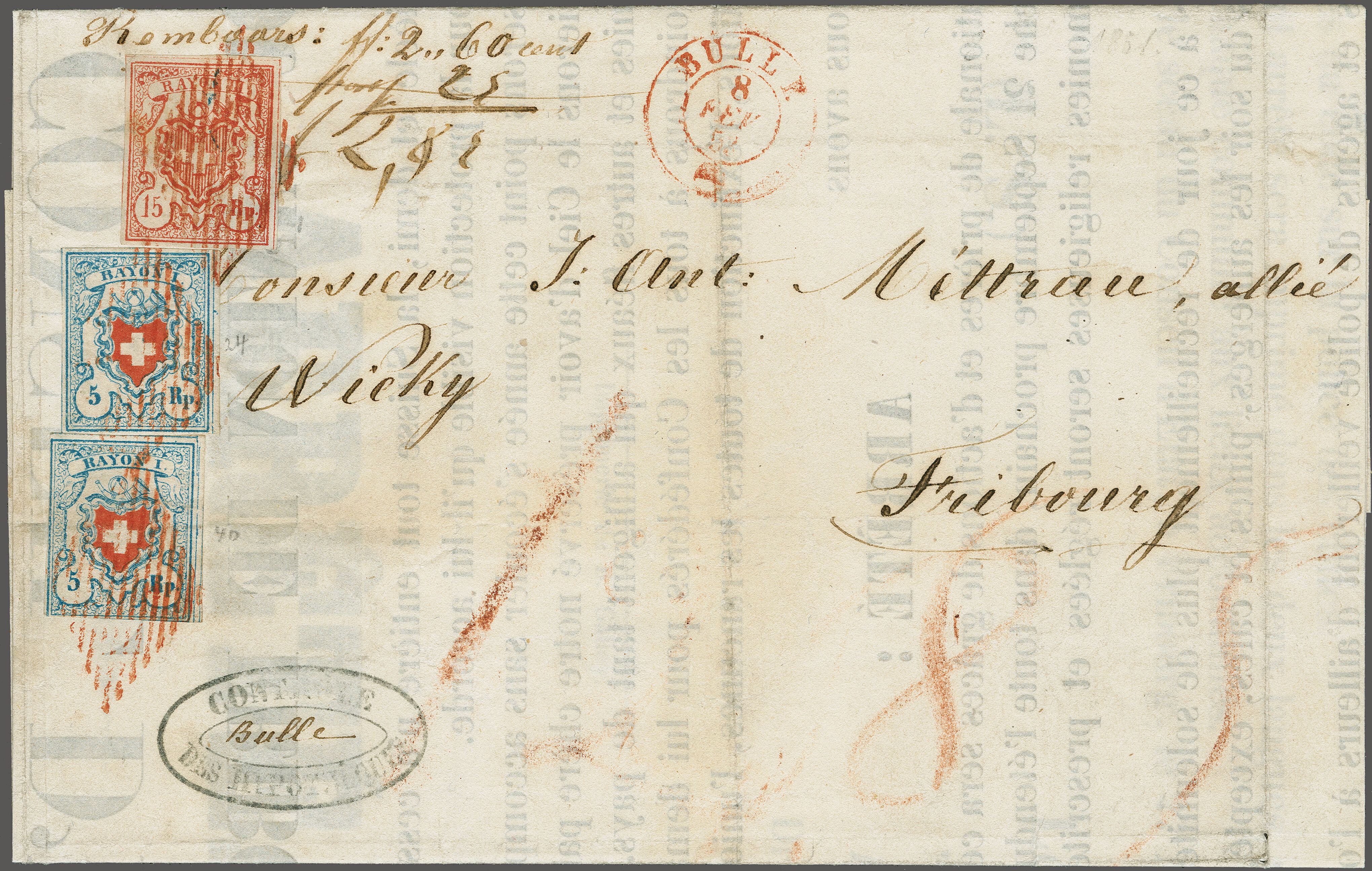 eidgenössischen Dank-, Buss- und Bettag 1851 als Nachnahme über Fr. 2.81 nach Fribourg. Rücks. Distributionsstp. "DISTRIBUÉ LE 8 FEV. 53". Korrektes Porto von 15 Rp. für die 2. Gewichtsstufe im 2. Briefkreisp plus 10 Rp. Nachnahme-Mindestprovision im