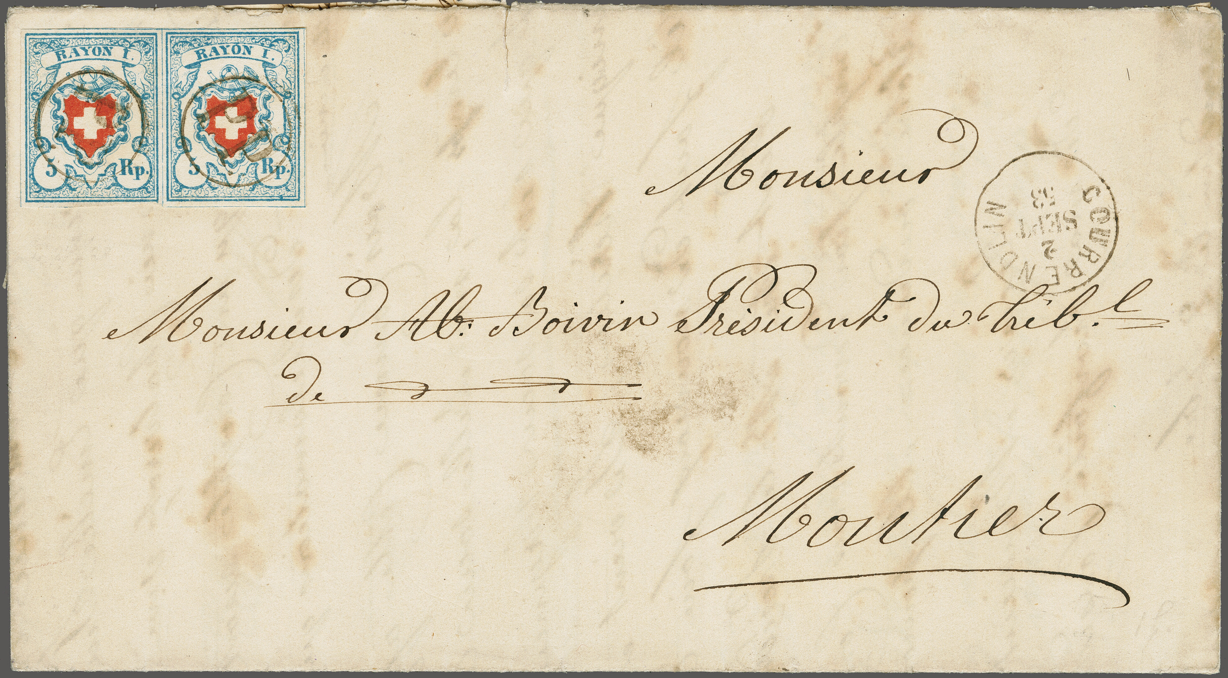 schwarzem "P.P." im Kreis von Courrendlin (AW 309) und nebenges. Fingerhutstp. "COURRENDLIN 2 SEPT. 53" in derselben Farbe auf vollständigem Faltbrief nach Moutier (Marken zur Kontrolle gelöst und zurückgefalzt). Rücks. Ankunftsstp. vom Folgetag.