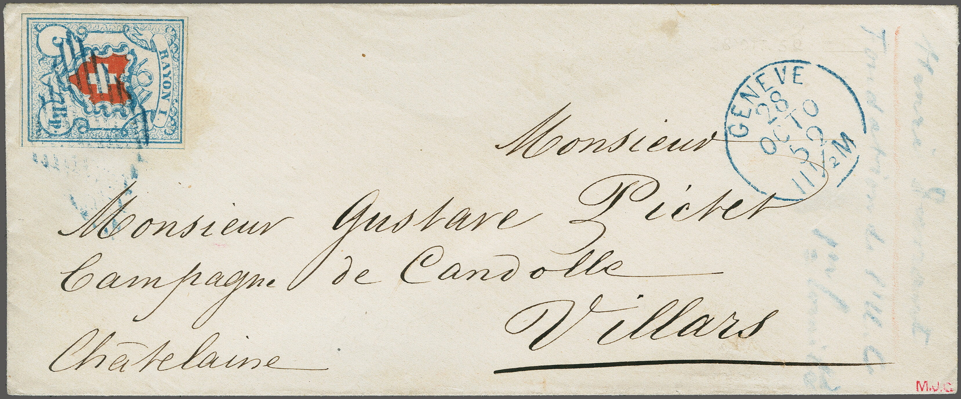 Stein C1: Type 18 r/u, farbfr. und breitrandig, zart und übergehend entw. mit blauer eidg. Raute mit nebenges. Einkreisstp. "GENÈVE 28 OCTO 52 11½M" in derselben Farbe auf Damen-Briefumschlag an den späteren Bundesrichter