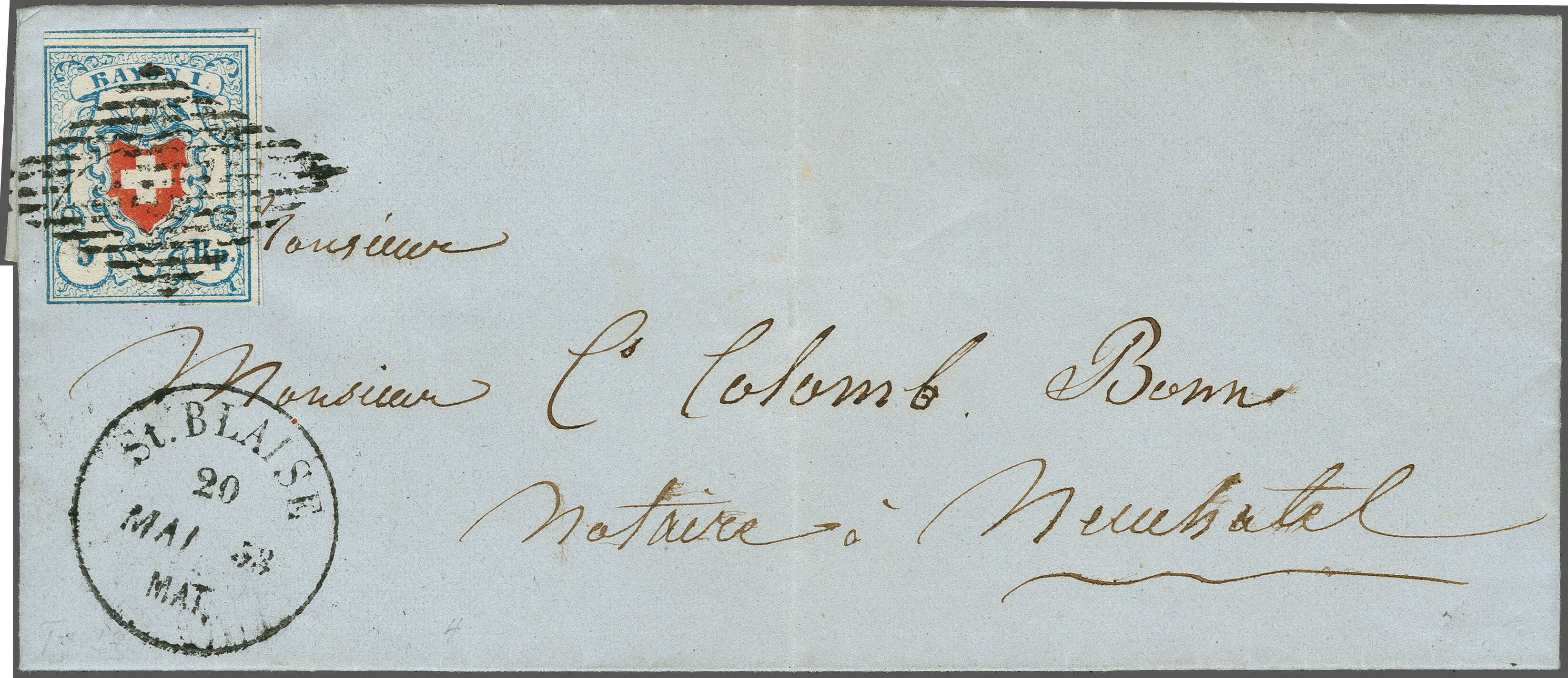 Raute mit nebenges. Einkreisstp. "St. BLAISE 20 MAI 53 MAT." in derselben Farbe auf frischem Faltbrieflein im 1. Briefkreis nach Neuchâtel. Rücks. Ankunftsstp. vom selben Tag. Befund Trüssel (1999). (Image 1)