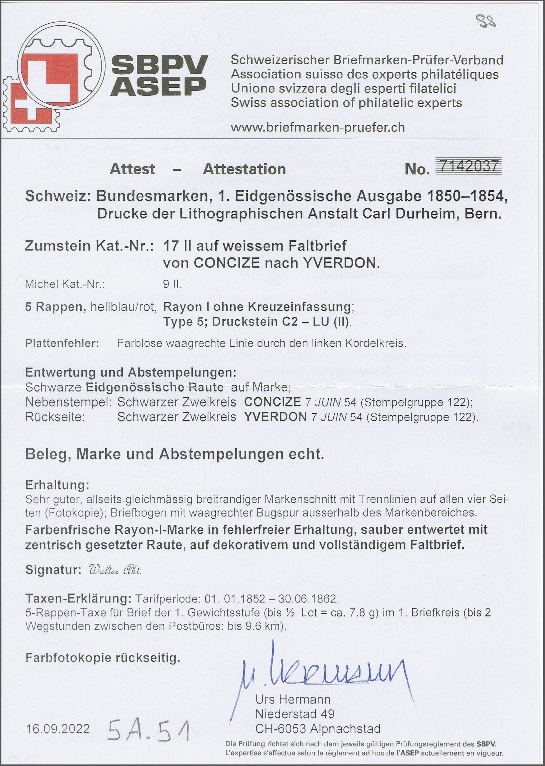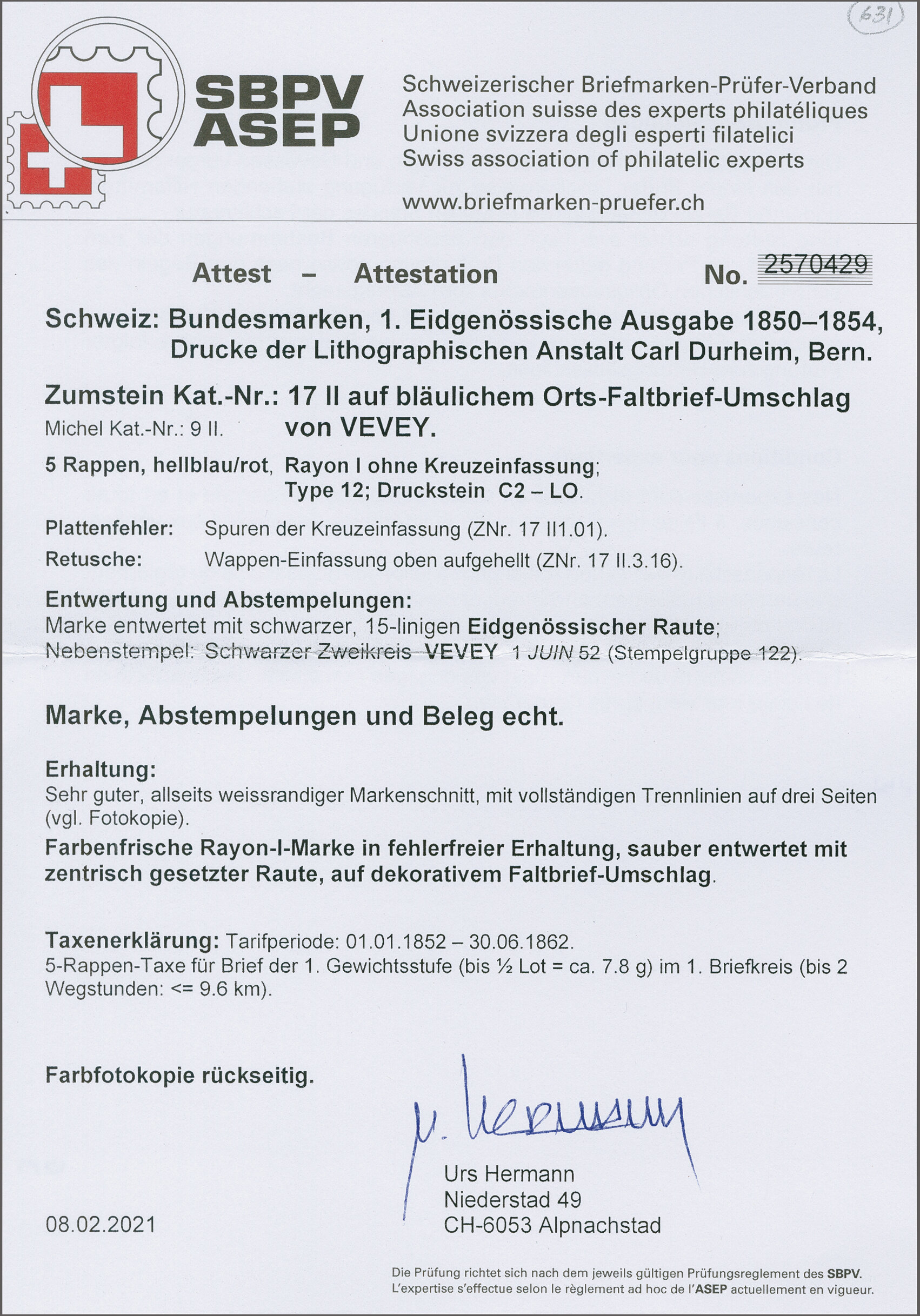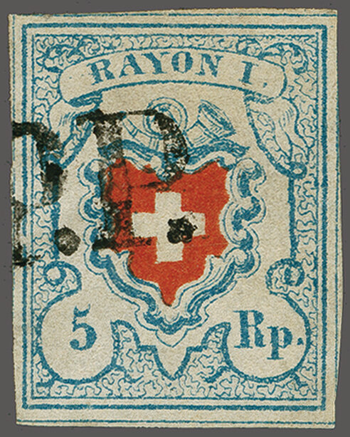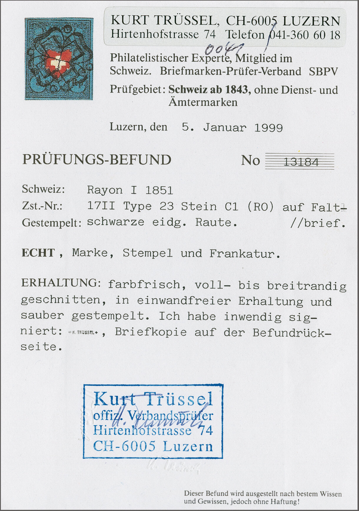 Stein C2: Type 1 r/u mit Spuren der Kreuzeinfassung, farbfr. und breit- bis überrandig mit breitem Gruppenabstand oben, klar entw. mit schön senkr. aufgesetzter schwarzer eidg. Raute. Ein attraktives Stück; Attest Hermann