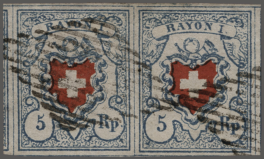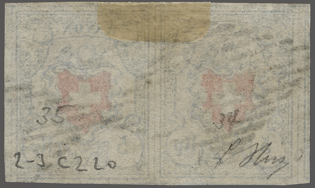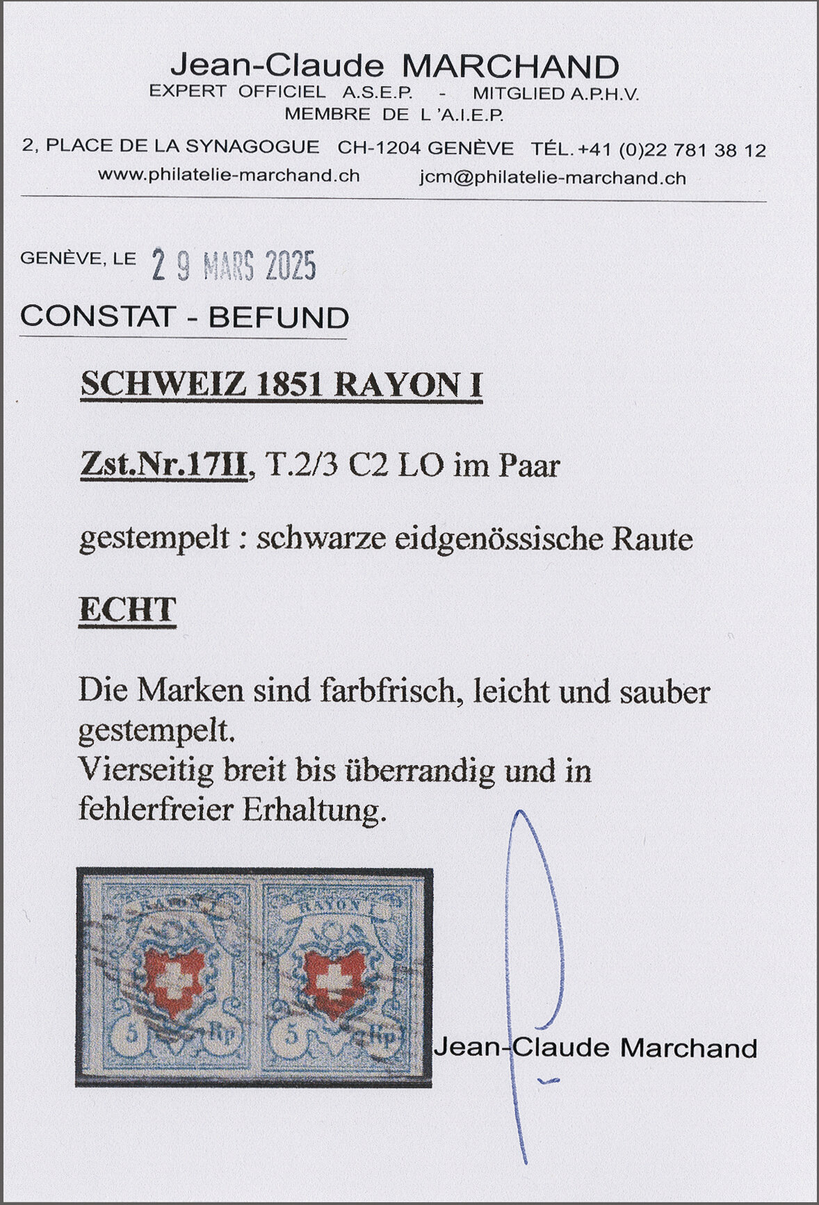 Stein C2, Typen 2+3 l/o im waagrechten Paar, farbfr. und breit- bis meist überrandig mit drei kompletten Trennlinien und Teilen zweier Nachbarmarken, zart entw. mit eidg. Raute. Befund Marchand (2025). (Image 1)