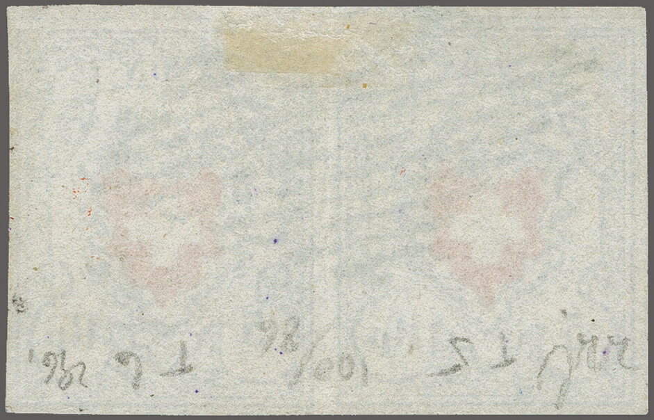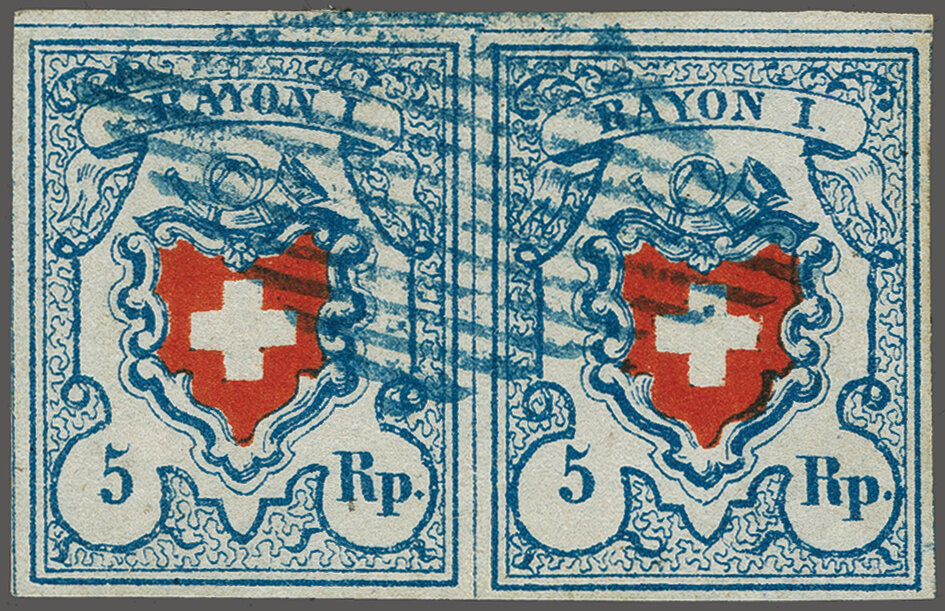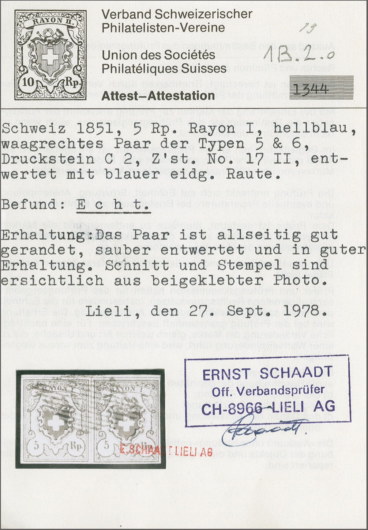 Stein C2: Typen 5+6 r/o im waagr. Paar, farbfr. und breit- bis überrandig mit Bogenrand oben, klar und kreuzfrei entw. mit blauer eidg. Raute. Attest Schaadt (1978). (Image 1)