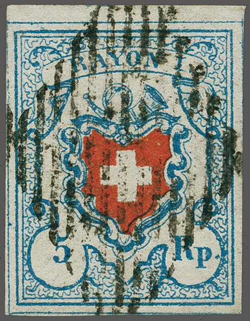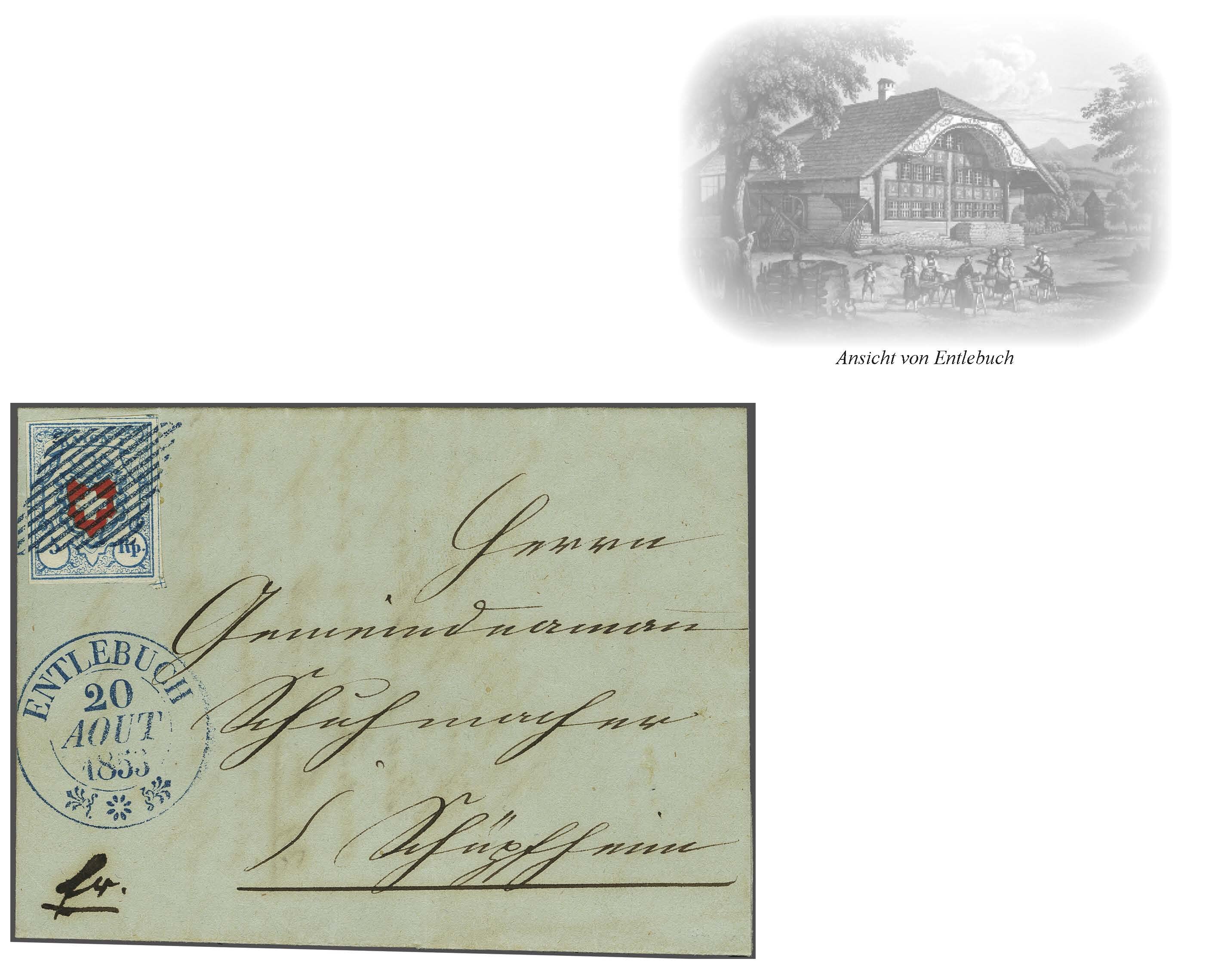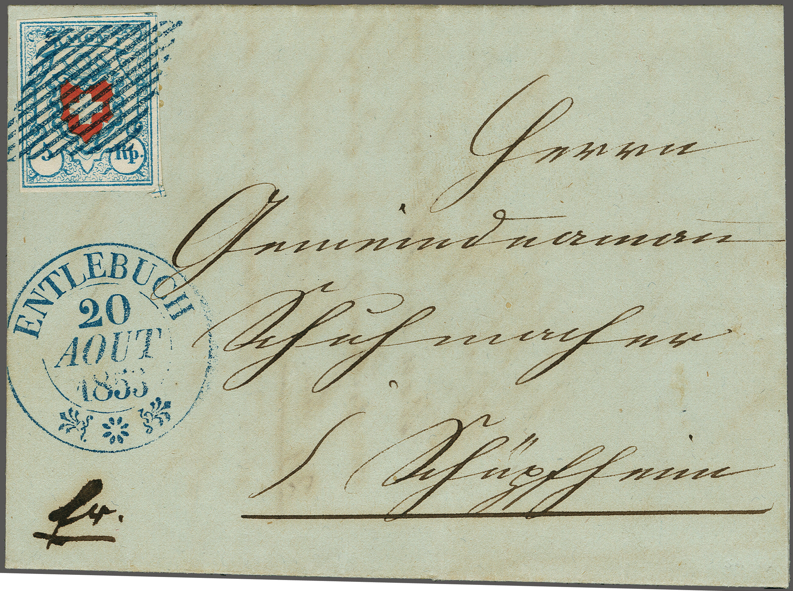Stein C2: Type 18 l/o, farbfr. und breit- bis überrandig, satt und kontrastreich entw. mit übergehender blauer eidg. Raute mit nebengesetztem höchst attraktivem Zierzweikreisstp. "ENTLEBUCH 20 AOUT 1853" in derselben Farbe auf