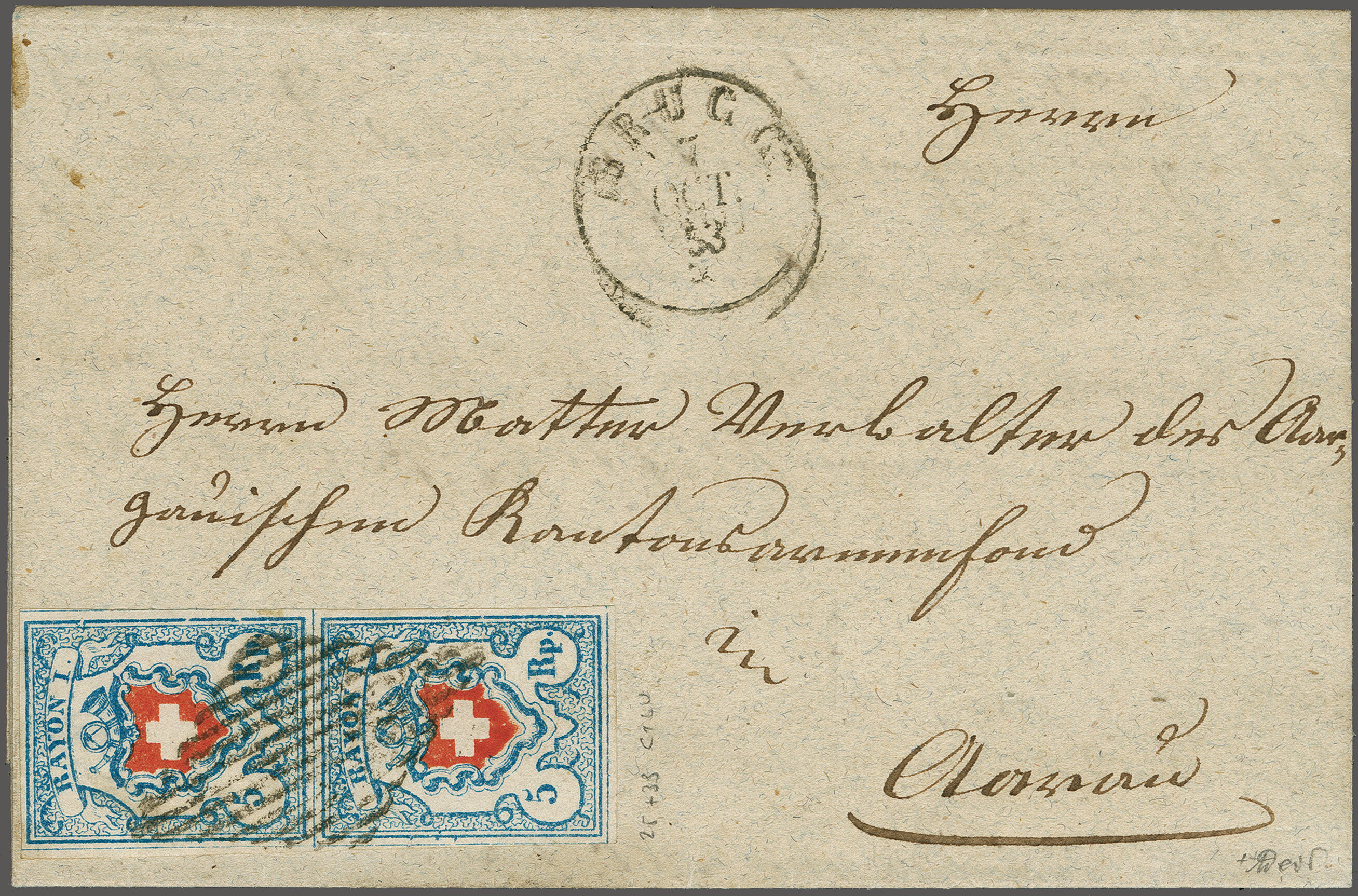 Stein C1: Typen 25+33 l/u im senkr. Paar, farbfrisch und breit- bis überrandig mit Bogenrand links und unten, leicht und voll aufgesetzt entw. mit schwarzer eidg. Raute mit nebenges. Fingerhutstempel "BRUGG 7 OCT. 53" auf