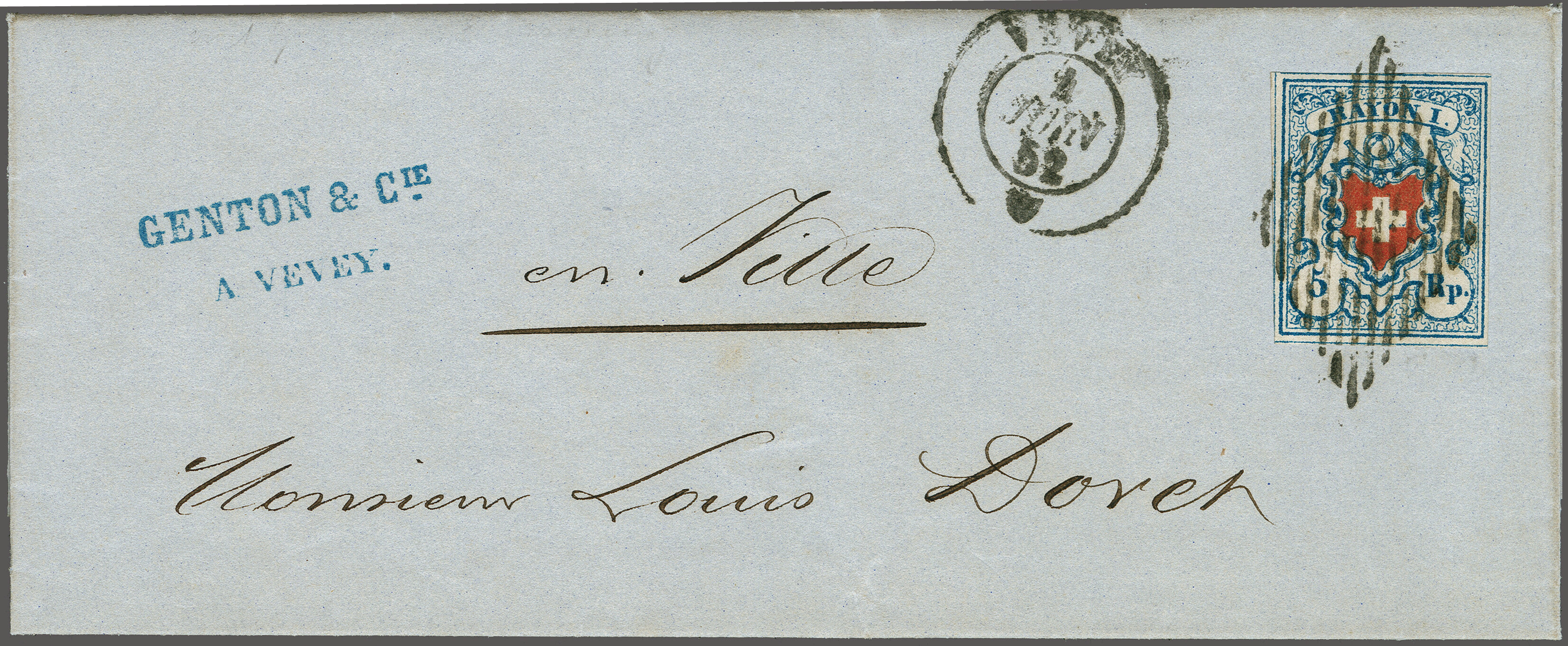 "VEVEY 1 JUIN 52" und Absenderstp. "GENTON & CIE. / A VEVEY" in blau auf archivfrischer Faltbriefhülle an eine Adresse in der Stadt. Ein dekorativer Waadtländer Brief; Attest Hermann (2021). (Image 1)