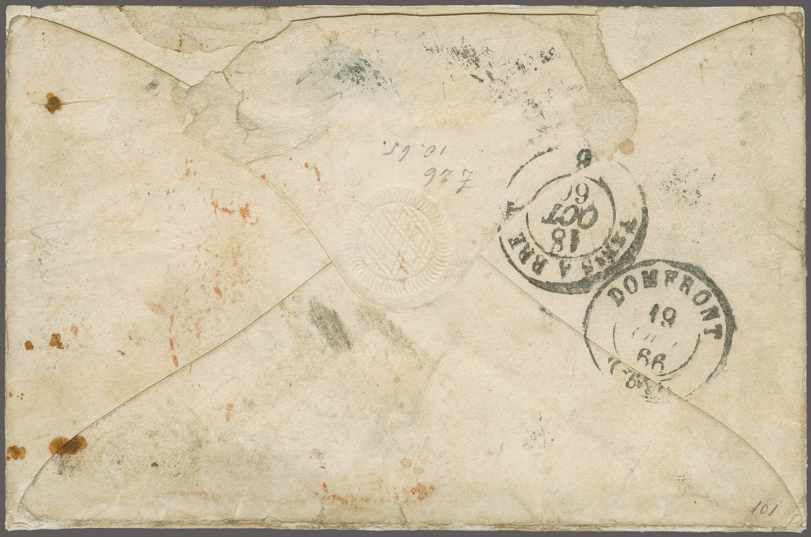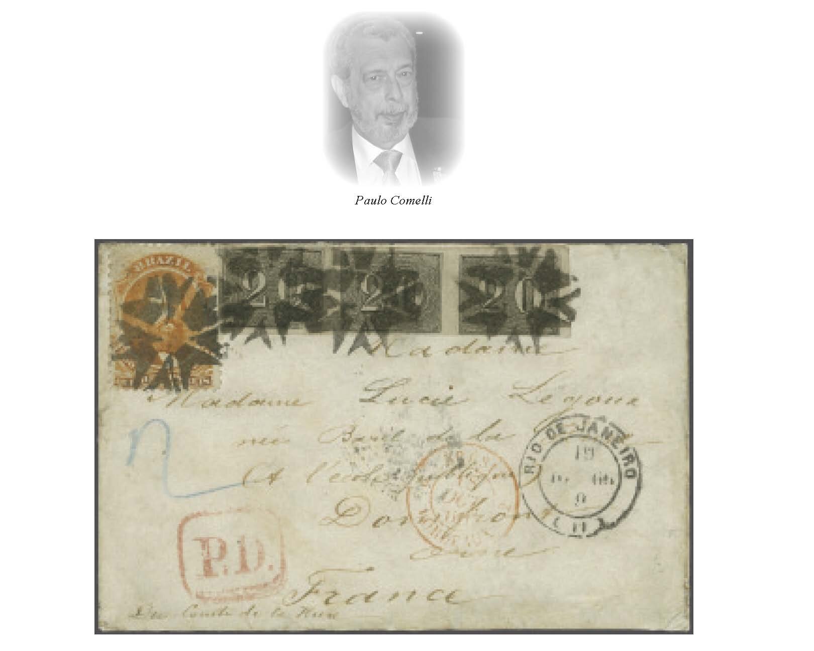 10070 cover imageVerticais 1850: 20 r. black on greyish thin paper, a horizontal strip of three, margins shaved to large, used in combination with 1866 Dom Pedro 500 r. orange on 1866 double rate cover from Rio de Janeiro to Domfront, France, all tied by segmented star obliterators in black. Rio de Janeiro despatch cds below (Sept 19) with framed "PD" in red with Bordeaux entry marking in red alongside (Oct 18). A charming and rare cover - just three covers are recorded with a strip of three of the 20 reis, this being the sole example with a mixed issue franking. Provenance: Collection Paolo Comelli, Investphila, Lugano, 16 March 2012, lot 1197. (Image 1) (Image 2)