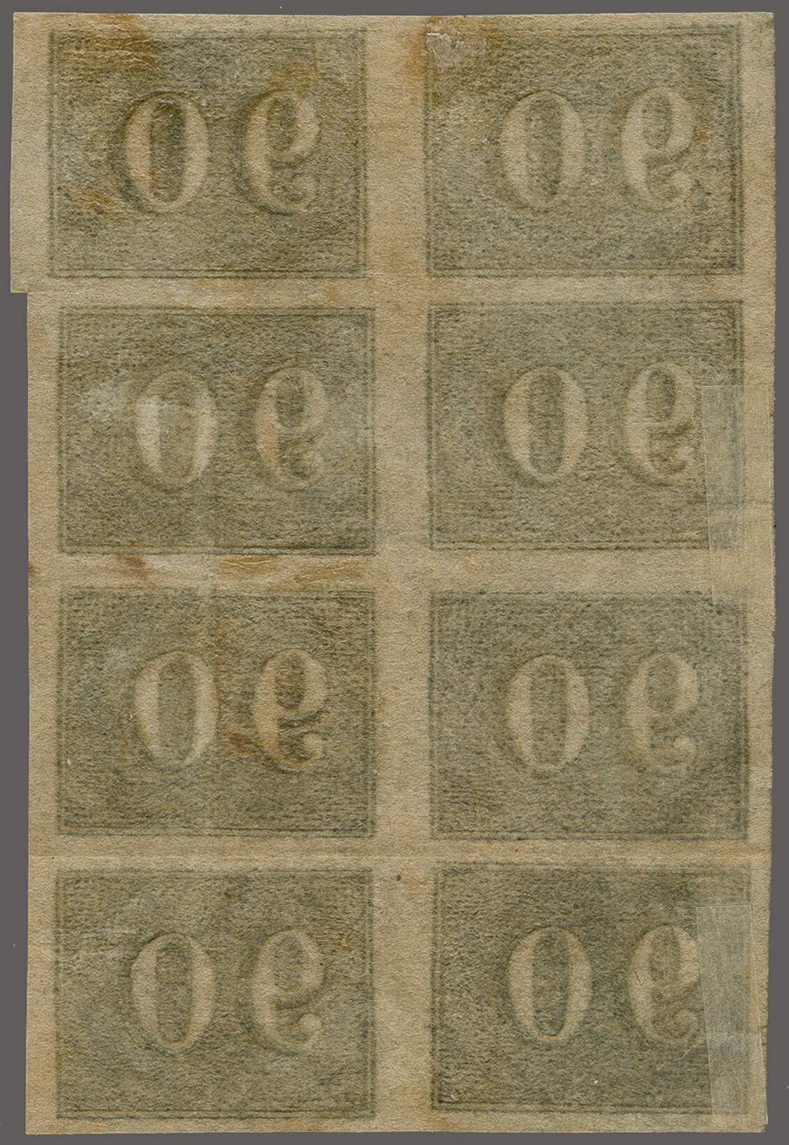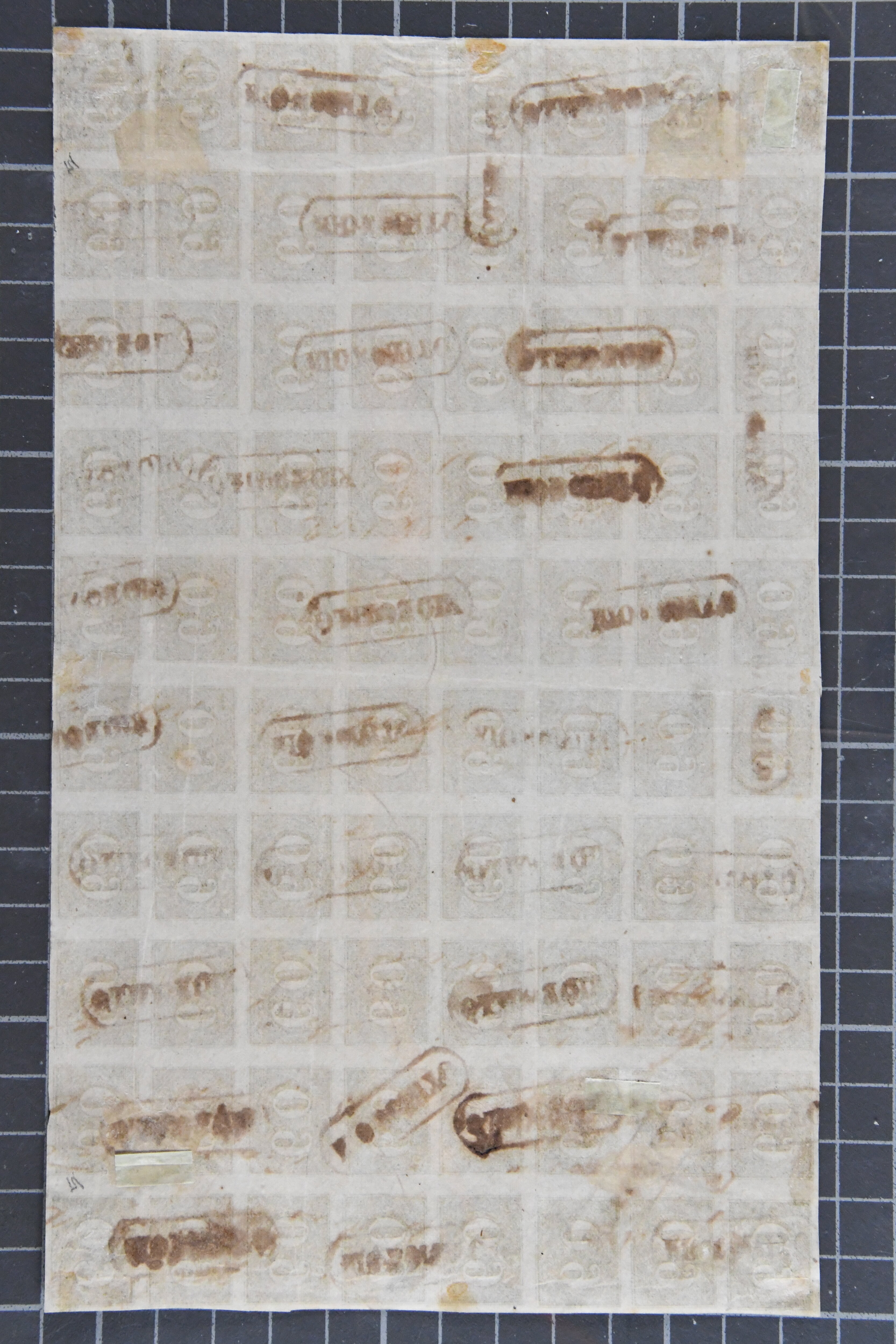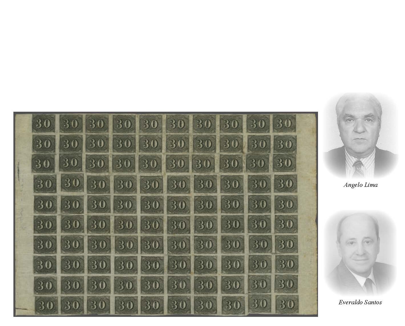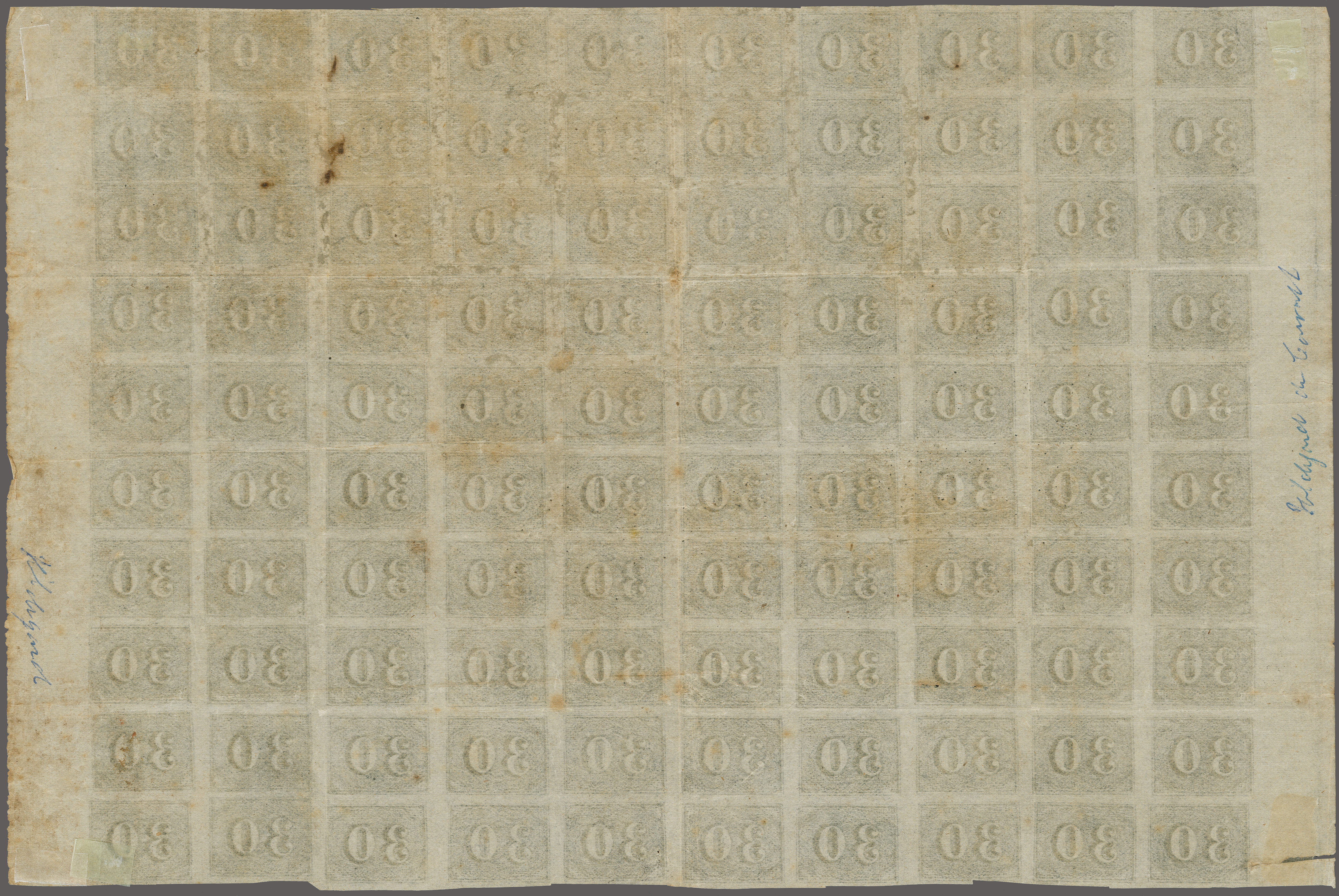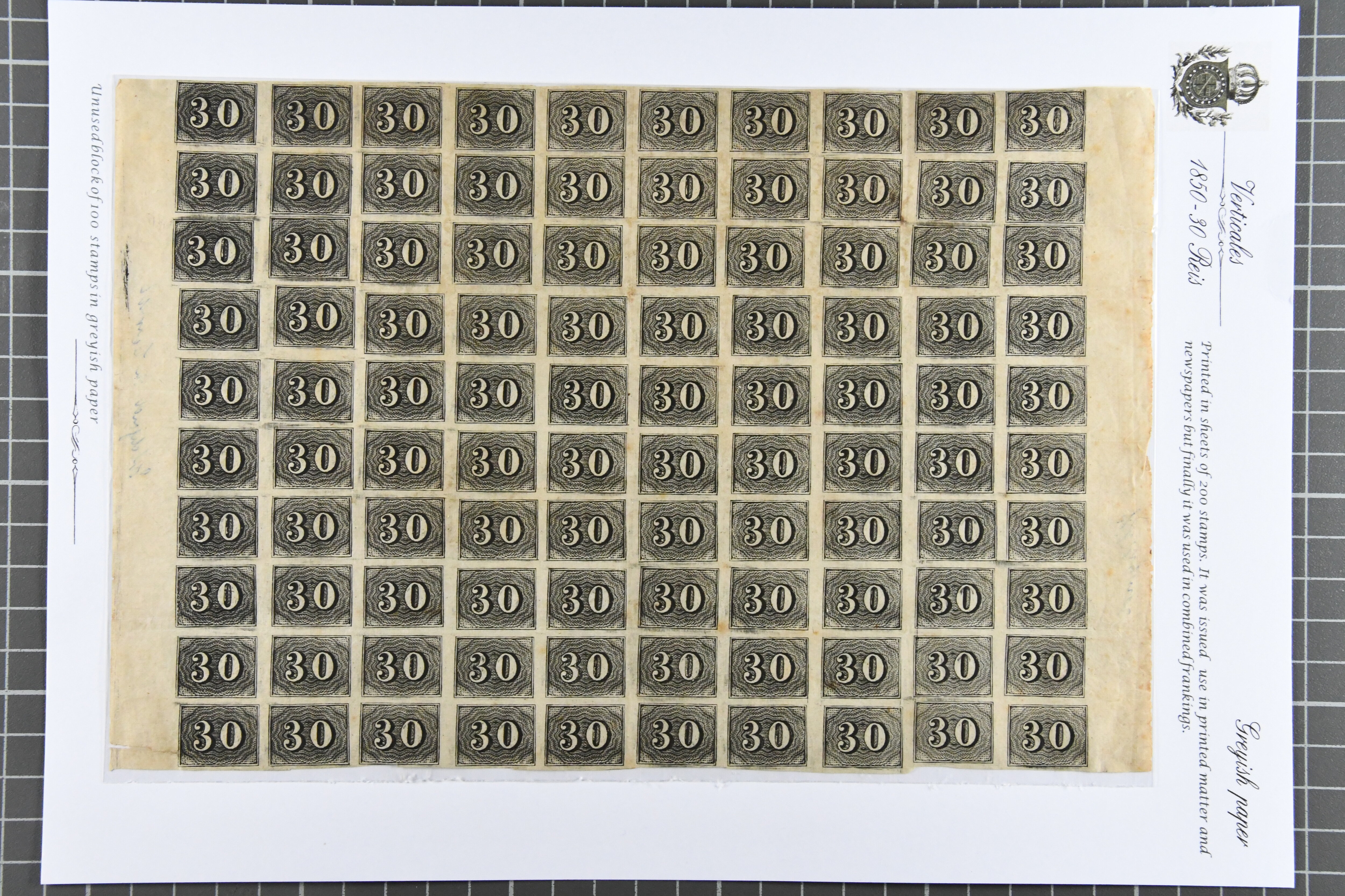 10071 */bof imageVerticais 1850: 30 r. black on greyish thin paper, an unused half sheet of 100 with sheet margins at left and at right, in a deep shade and showing the misalignment between the cliches, slight split in margin at lower left, some typical creasing and one or two age stains, with partial original gum. Probably the largest multiple now extant, a splendid and extremely rare multiple. Provenance: Collection Reynaldo Bruno Pracchia, DF, Zurich, 18 Nov 1987, lot 60271; collection Angelo Lima, DF, Zurich, 4 Nov 1993, lot 30169; collection Everaldo Santos, Afinsa, Madrid, 14 March 2001, lot 119. (Image 1) (Image 2) (Image 3)