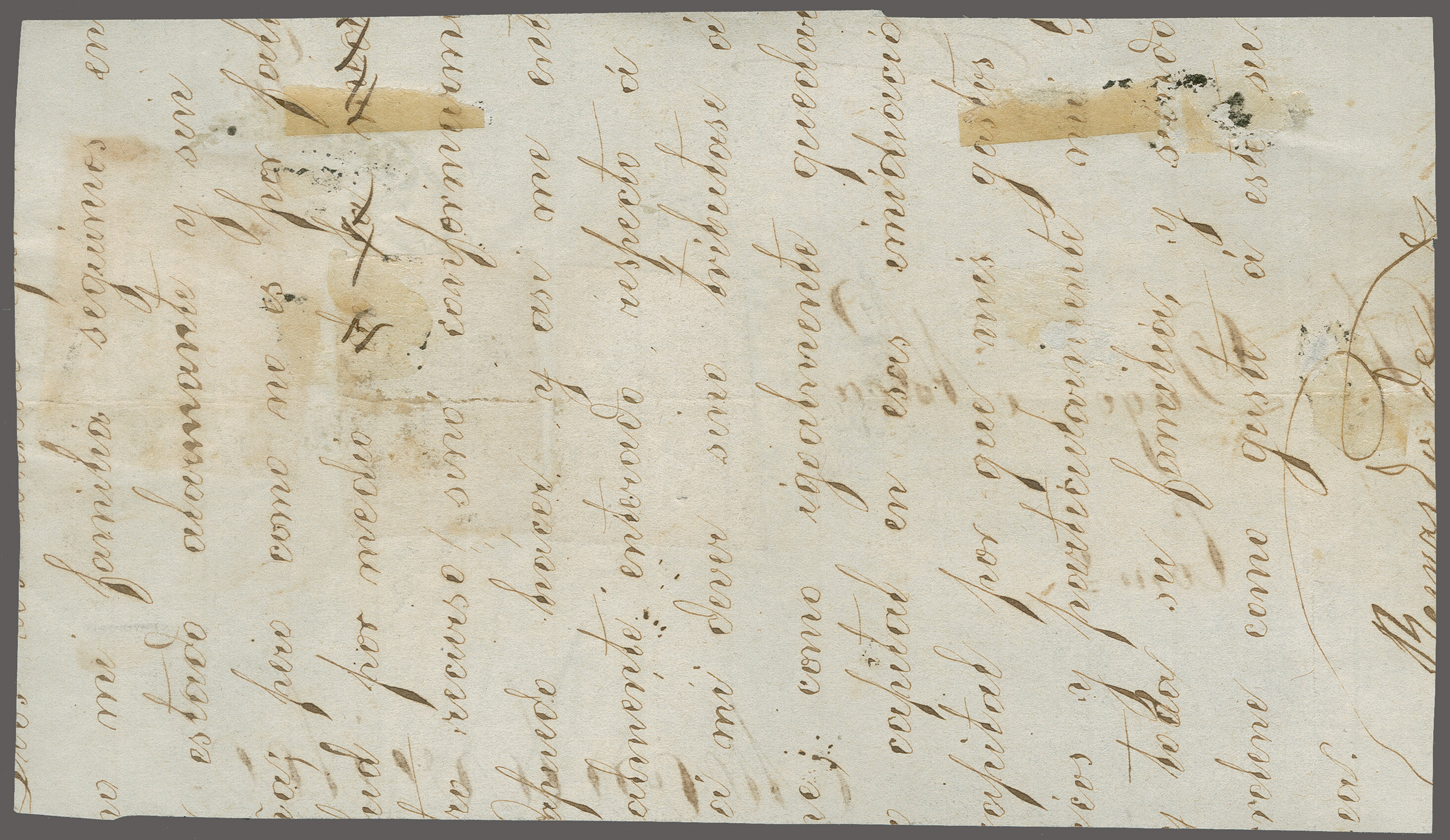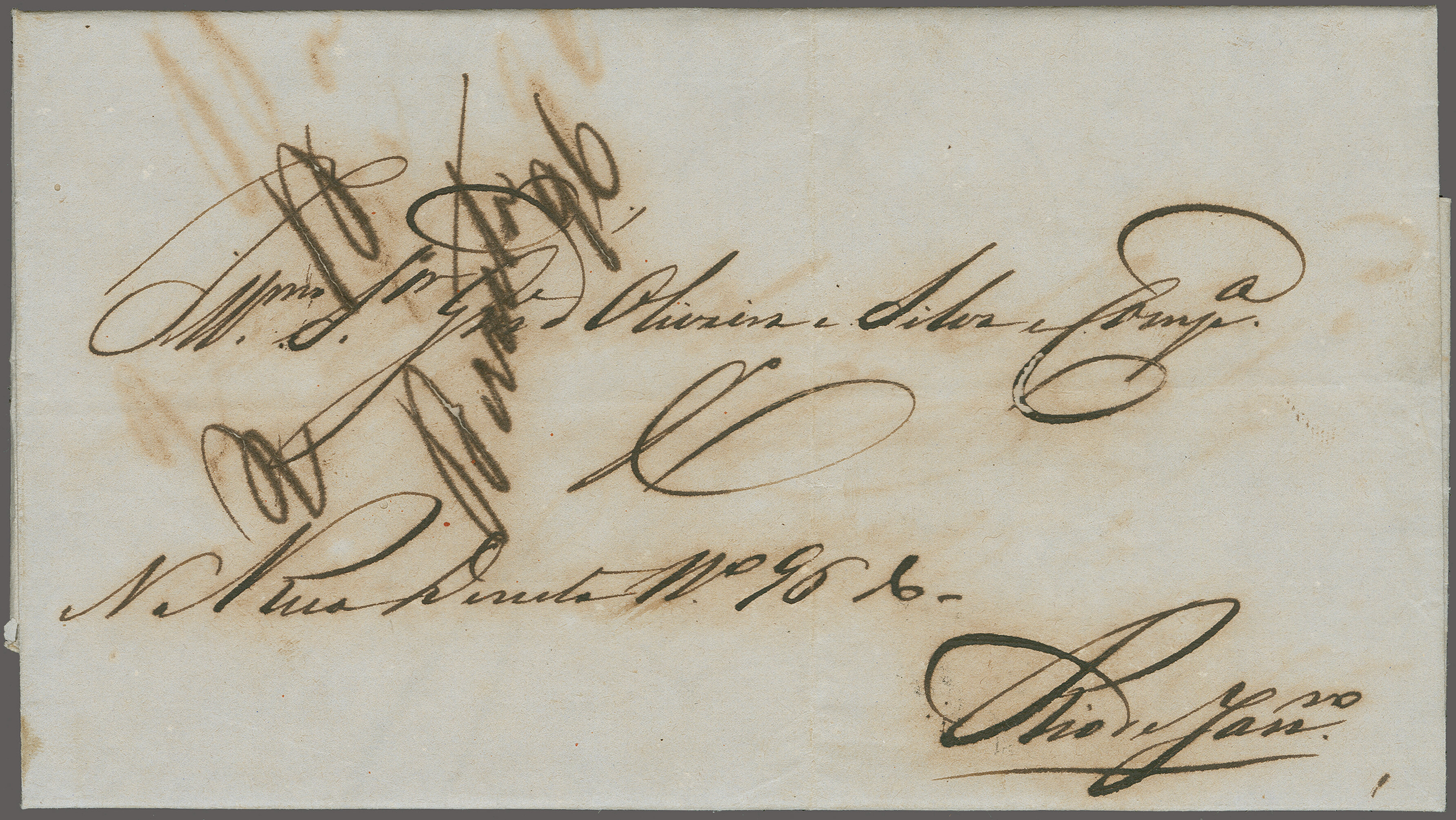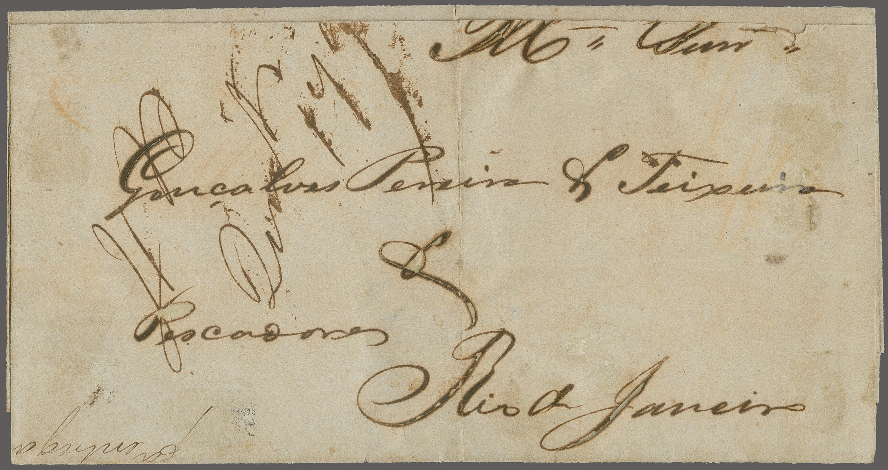 10080 cover imageVerticais 1850: 60 r. black on greyish thin paper and 30 r. grey-black on greyish thin paper, each with just shaved to mostly large margins, used in combination with 1866 Dom Pedro 10 r., vermilion on 1873 entire letter at single rate from Rio de Janeiro to Mendes, all tied by segmented cork handstamps in black with Rio de Janeiro cds (Jan 10) below. Edge wear along folds and closed tear in face panel but a remarkable and very late combination usage of both issues. (Image 1)