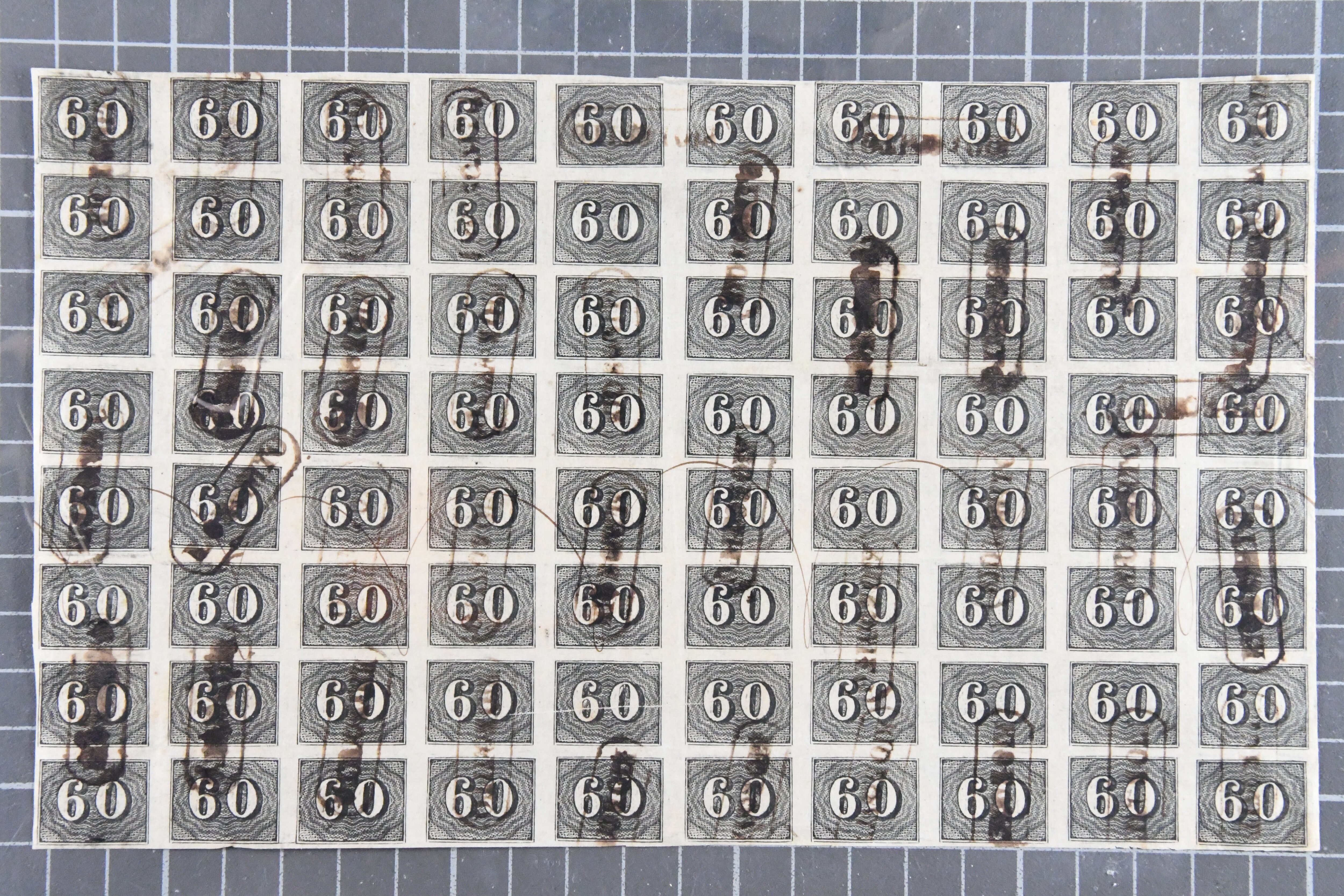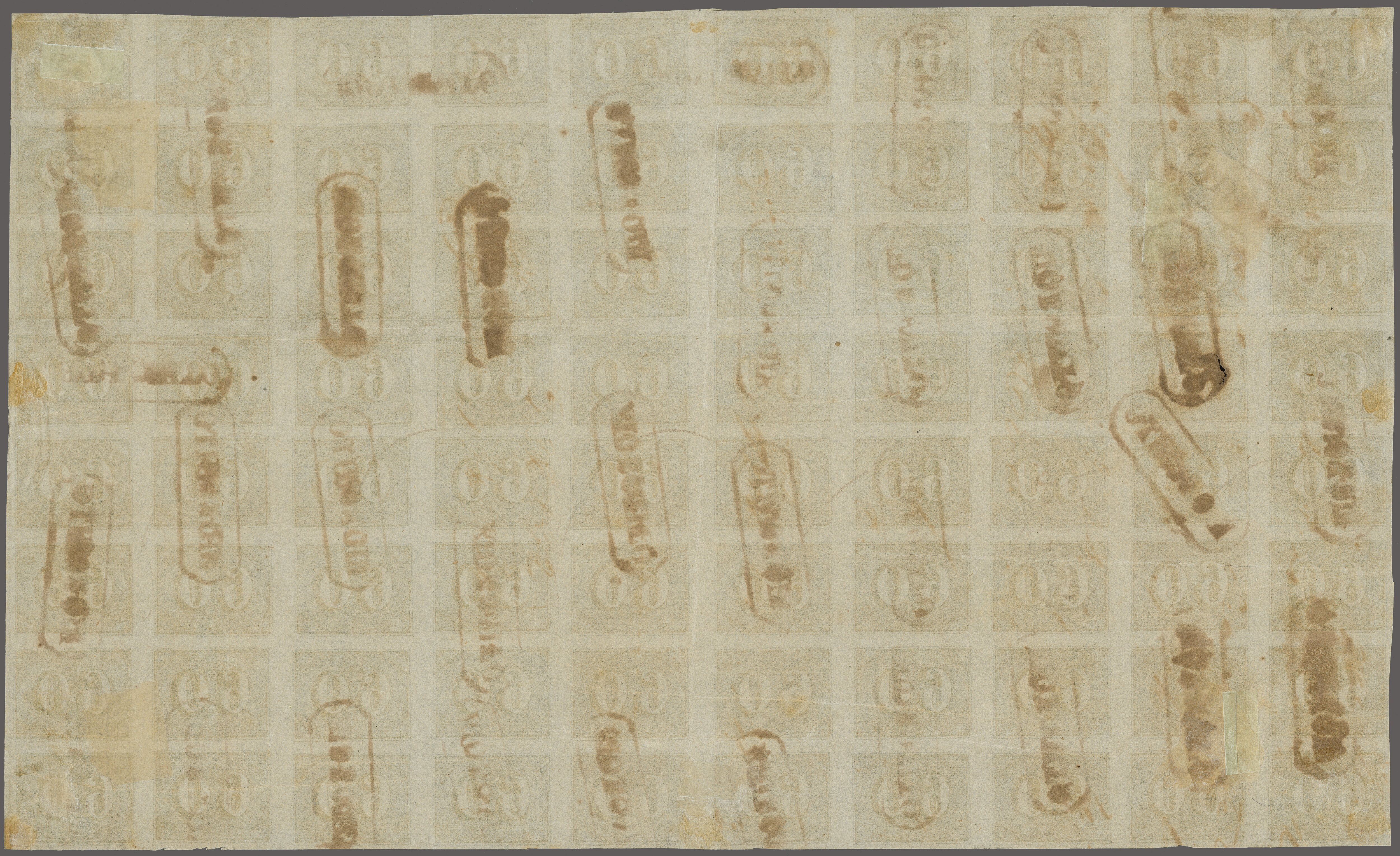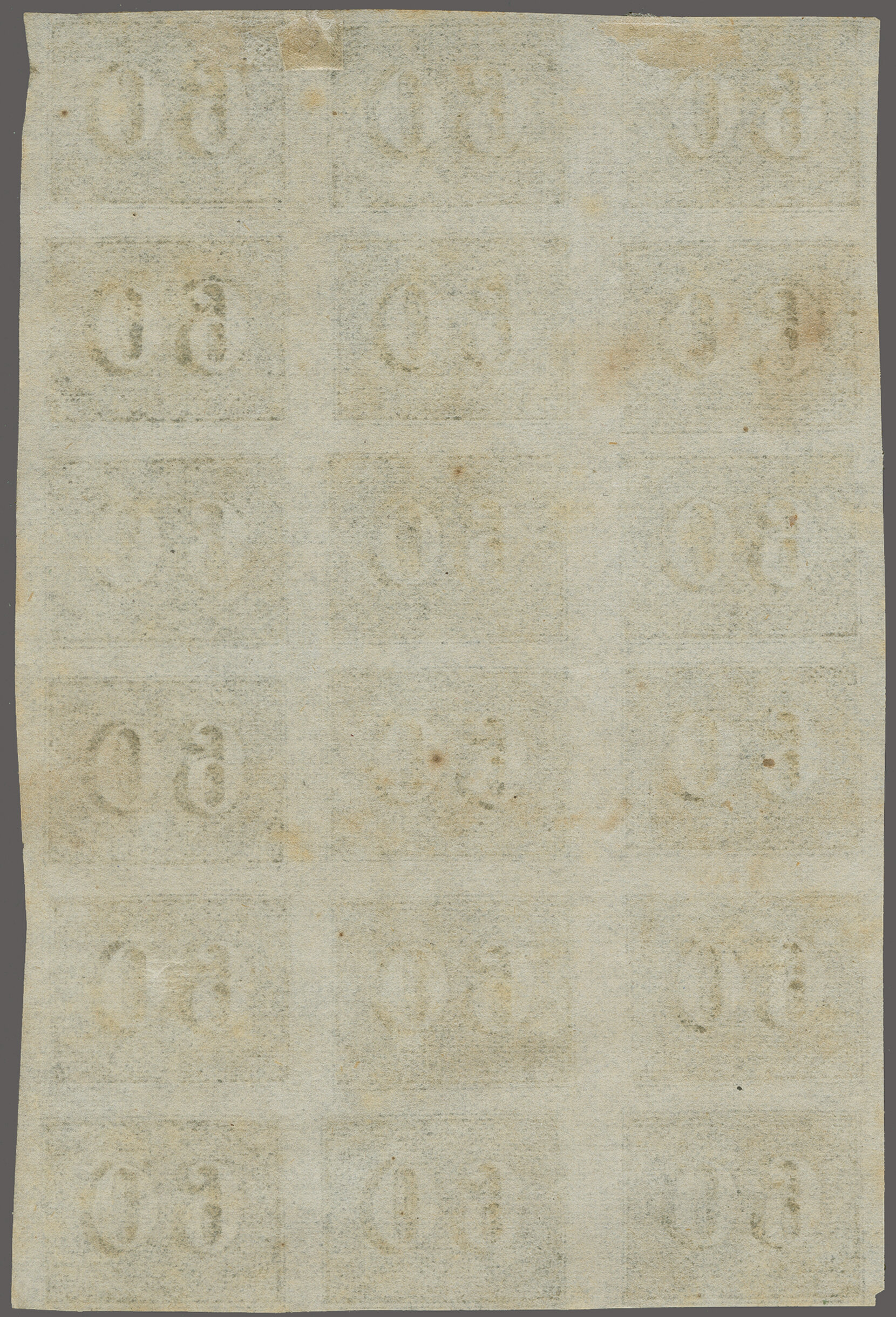 10075 bof/(*) imageVerticais 1850: 60 r. black on greyish thin paper, an unused block of eighteen (3 x 6) with clear to large margins on all sides, trifle close at base, tone spot on one stamp otherwise a fine large multiple. (Image 1)