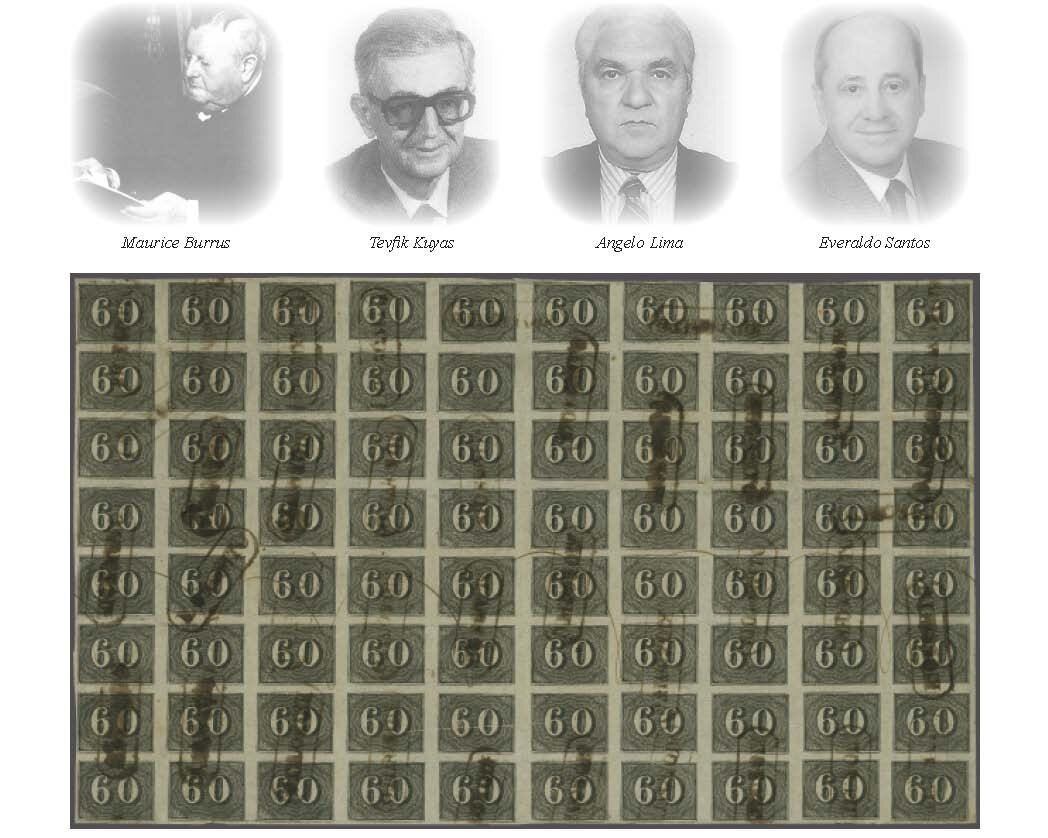 10076 bof imageVerticais 1850: 60 r. black on yellowish thin paper, the famous used block of eighty (10 x 8) with just clear to large margins on all sides, some typical light thins and creases, cancelled both in manuscript and by framed "RIO BONITO" handstamps in brown (Ayres fig. 1431), the handstamps having affected the paper in places however, this is the largest used multiple recorded and in exceptional quality for such a multiple. Provenance: Collection Maurice Burrus, Robson Lowe, London, 4 April 1963, lot 1347; collection T. Kuyas, SG, Frankfurt, 18 May 1978, lot 338; collection Angelo Lima, DF, Zurich, 4 Nov 1993, lot 30178; ccollection Everaldo Santos, Afinsa, Madrid, 14 March 2001, lot 121. (Image 1) (Image 2) (Image 3) (Image 4)