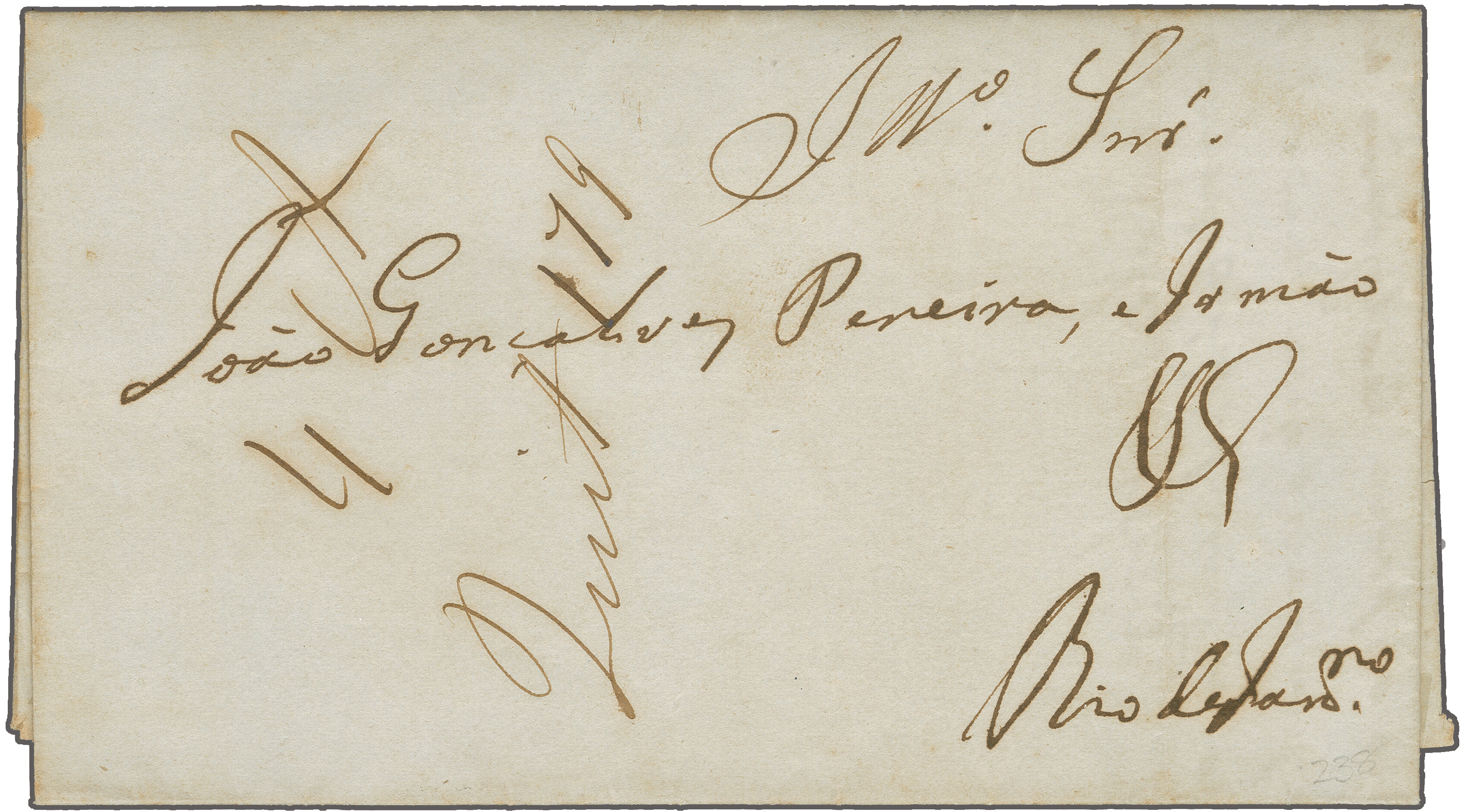 10083 cover imageVerticais 1850: 90 r. black on greyish thin paper in a resonant deep shade, large margins all round and sheet marginal at right showing portion of adjoining stamp at top, used on 1864 cover from Rio de Janeiro to Queluz at double the internal rate, neatly tied by small "Correio Geral da Corte / Brazil" cds (Feb 10) in black. File fold well away from the adhesive, a charming and scarce cover. (Image 1)