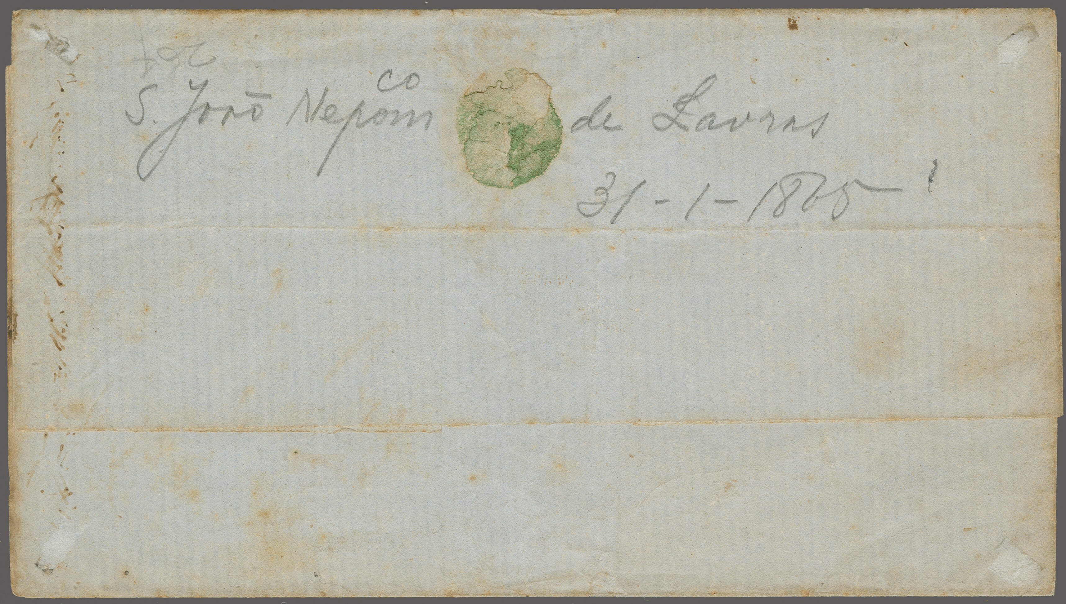 10072 cover imageVerticais 1850: 30 r. black on yellowish thin paper, a vertical pair used as seal on reverse of October 1860 cover at single rate from Vila de Queluz to Rio de Janeiro, tied by bold strike of straight line "V.D.QUELUZ" handstamp in blue (Ayres fig. 1182) with "Correio Geral da Corte" cds below with date in manuscript "2-11-60". Some splitting on folds and obverse with imperfections but an attractive usage. (Image 1)