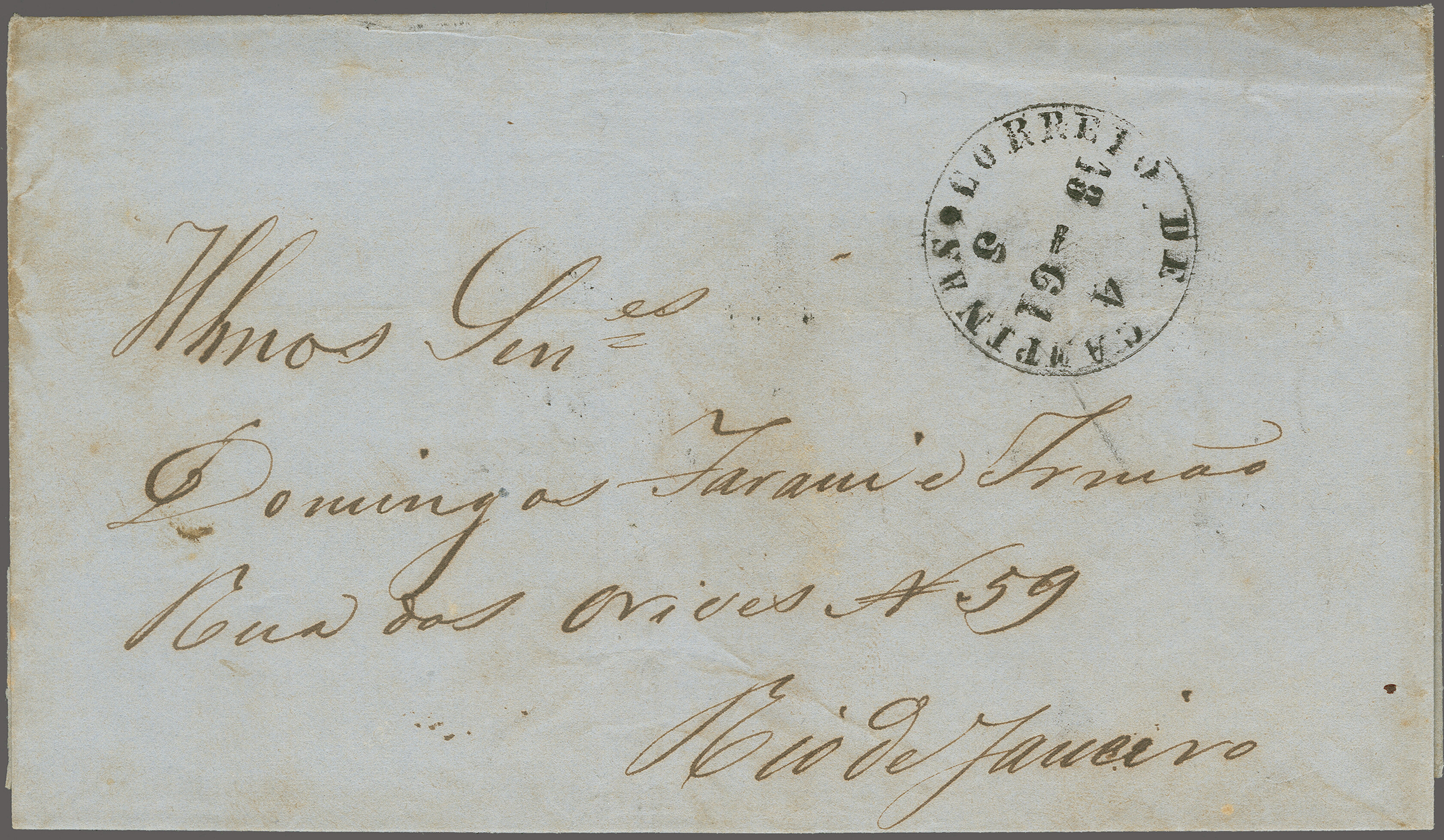 10079 cover imageVerticais 1850: 60 r. black on yellowish thin paper, a used vertical strip of four with clear to large margins on all sides and showing portion of adjoining stamp at top, on reverse of 1861 cover from Campinas to Rio de Janeiro carried at triple the Maritime rate, tied by two fine strikes of scarce circular "CORREIO DE CAMPINAS" datestamps (March 4). Small opening tears away from adhesives and repeated fine strike of the Campinas cds on the obverse of a scarce cover. (Image 1)