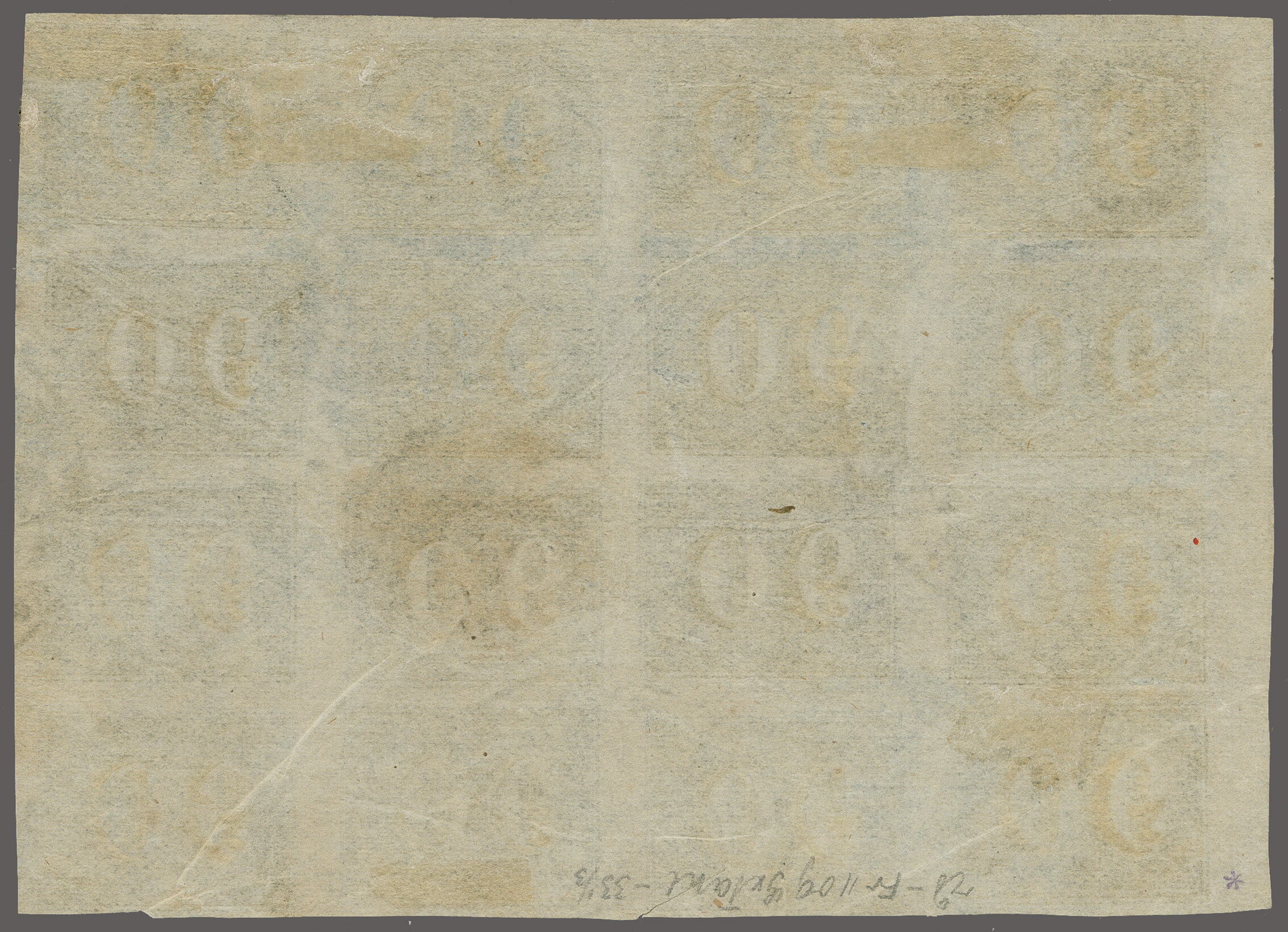 10082 bof imageVerticais 1850: 90 r. black on greyish thin paper, a used block of sixteen (4 x 4), close at base otherwise with large margins, thin repaired between first and fifth stamp and small inclusion at base of stamp at lower right, cancelled by segmented cork handstamps in blue and by light circular datestamps in black. Despite the imperfections an important block - the third largest used multiple recorded. (Image 1)
