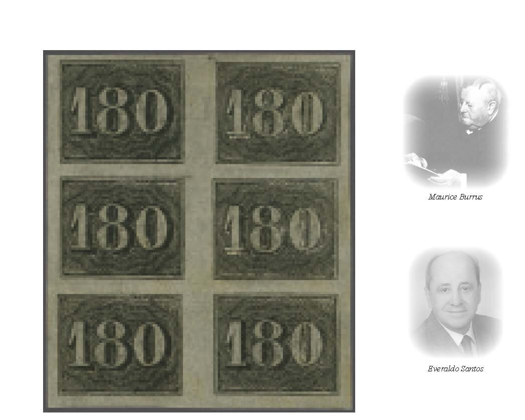 10085 */bof imageVerticais 1850: 180 r. black on greyish thin paper, an unused block of six (2 x 3), of fine rich colour with some evidence of re-entries to second and fourth stamps on the numerals and small closed tear at top of second stamp, unused with small patches of original gum. Unused multiples of this stamp are rare (no examples in Pracchia or Ferreira, just a block of four in the Angelo Lima sale). A very attractive and most unusual large multiple Scott = $ 690+. Provenance: Collection Maurice Burrus, Robson Lowe, London, 4 April 1963, lot 1343; collection T. Kuyas, SG, Frankfurt, 18 May 1978, lot 396; collection Everaldo Santos, Afinsa, Madrid, 14 March 2001, lot 135. (Image 1) (Image 2)